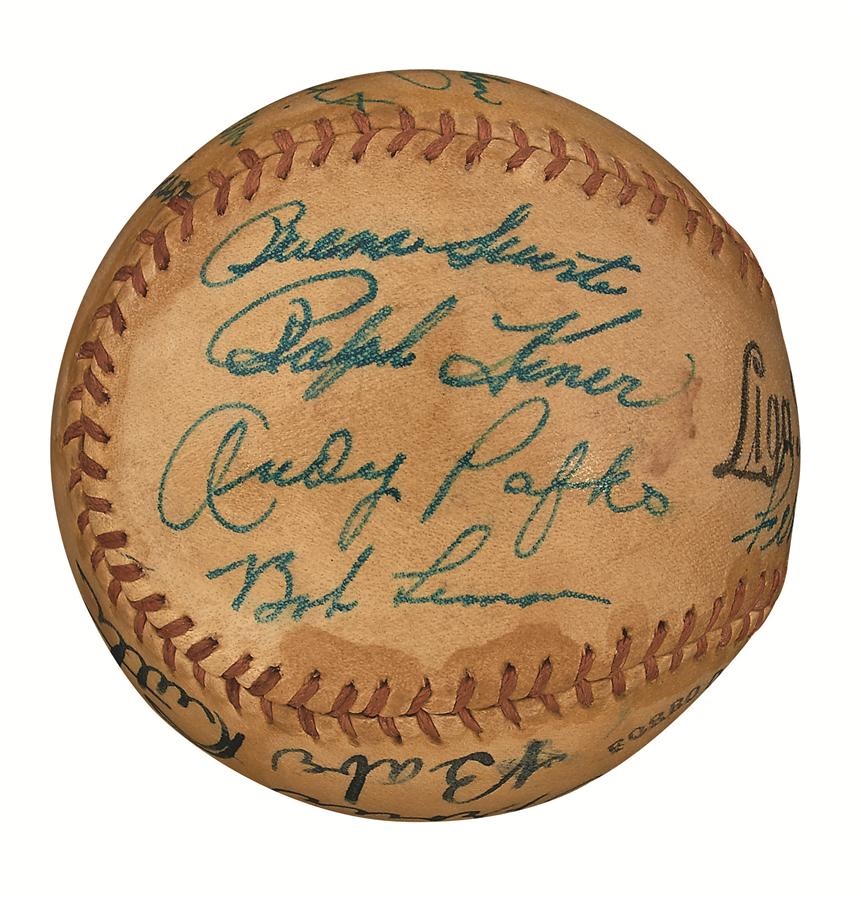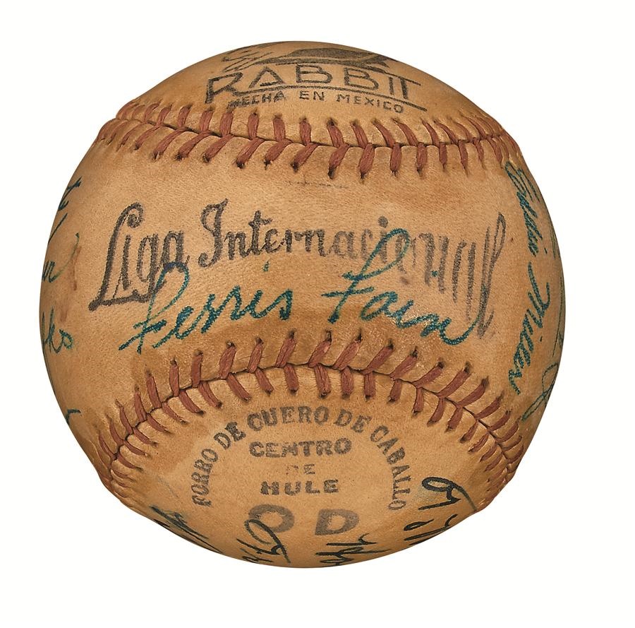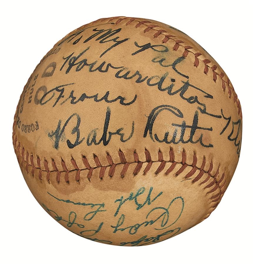 This unusual multi-signed ball includes a beautiful personalized signature on the side panel, "To My Pal, Howarditos Klein, Babe Ruth." That is just one of the great autographs on this Mexican-made Rabbit Liga Internacional baseball, with others including: Jackie Robinson, Ed Lopat, Phil Marchildon, Bob Lemon, Andy Pafko, Ferris Fain, Eddie Miller, Jim Hegan, Ralph Kiner (who signed his name and added, "Buena Suerte" meaning "Good Luck," and Max Patkin, the "Clown Prince of Baseball." Ruth's signature 8/10, and the ball and other signatures are also in fantastic condition. Comes with JSA LOA.