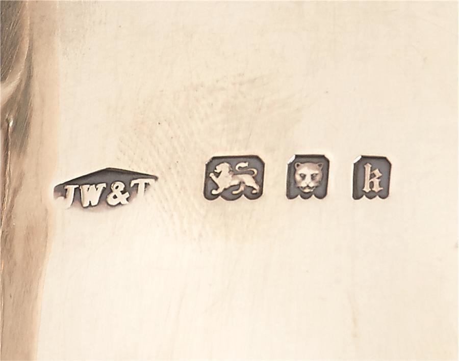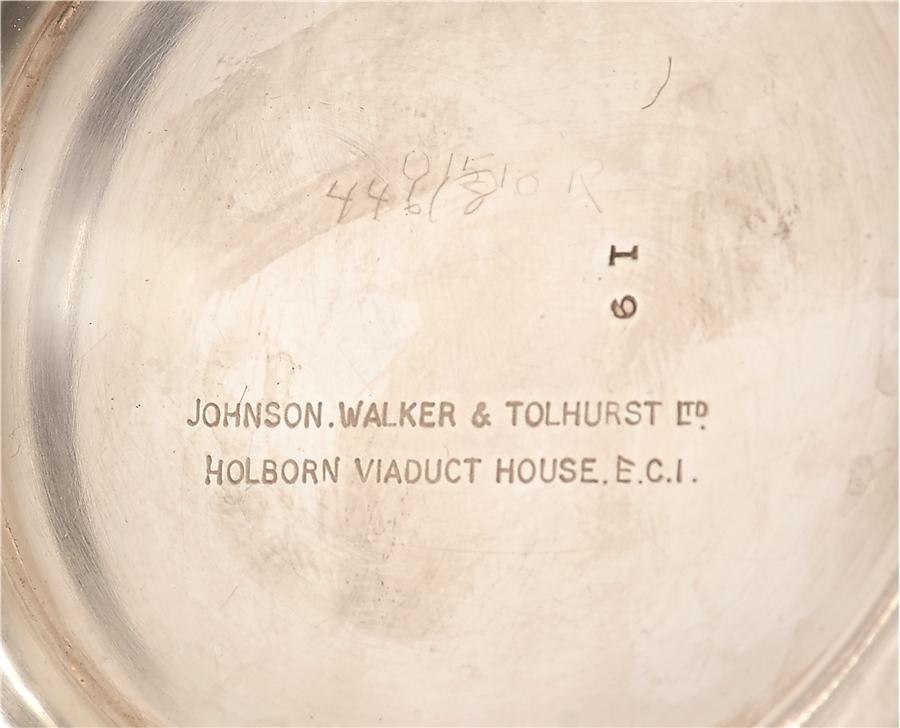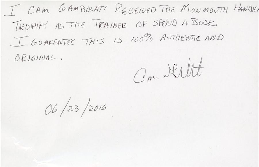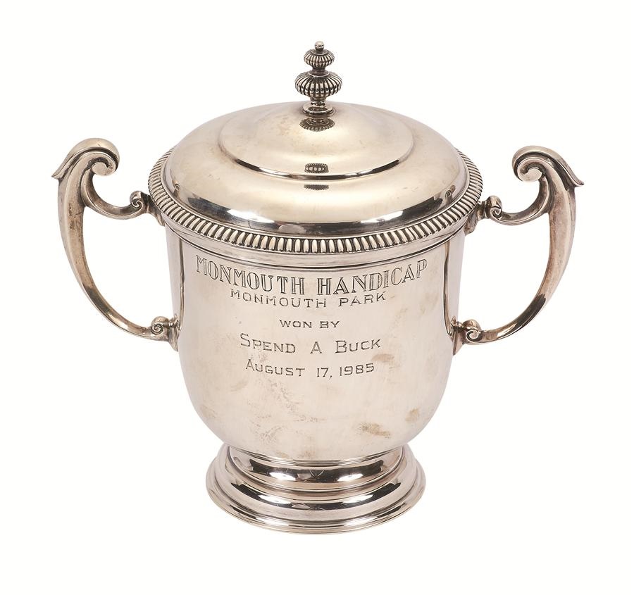 From the 1985 victory of Spend A Buck, this trophy is engraved "Monmouth Handicap, Monmouth Park, Won by Spend a Buck, August 17, 1985." It consists of one piece measuring 25 ounces, and is 7.75x8". The bottom is engraved, "Johnson, Walker & Tolhurst Ltd., Holborn Viaduct House E.C.I." There is one small dent but it remains quite beautiful and was obtained directly from Cam Gambolati, and comes with a handwritten letter from him. Spend A Buck won the 1985 Kentucky Derby but his team made waves in opting to skip the final two legs of the Triple Crown.