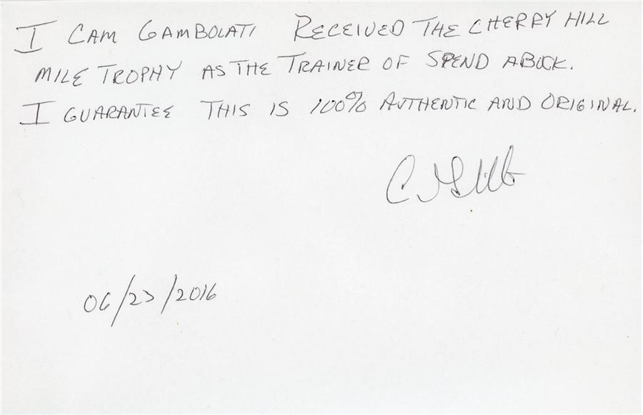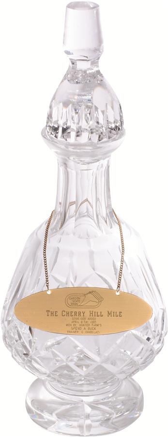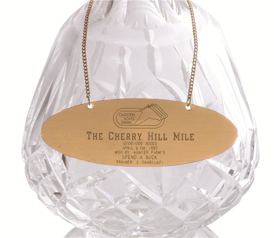 Robert Brennan upended the thoroughbred world in 1995, offering a $2 million bonus to any horse who could win the Kentucky Derby and sweep the "Jersey Crown." Spend A Buck won the Derby, and Brennan's offer prompted his team to skip the Preakness and Belmont to pursue the bonus. This trophy is from the first of the three races in the "Jersey Crown." Consisting of two pieces, the trophy and a top, it measures 5x12.5" and is crystal with no markings. It is accompanied by a gold plaque engraved "The Cherry Hill Mile, $200,000 Added, April 6th 1985, Won by Hunter Farm's Spend a Buck, Trainer C. Gambolati." This elegant specimen was obtained directly from Cam Gambolati and comes with signed handwritten letter from him.