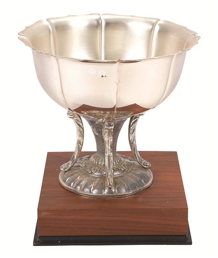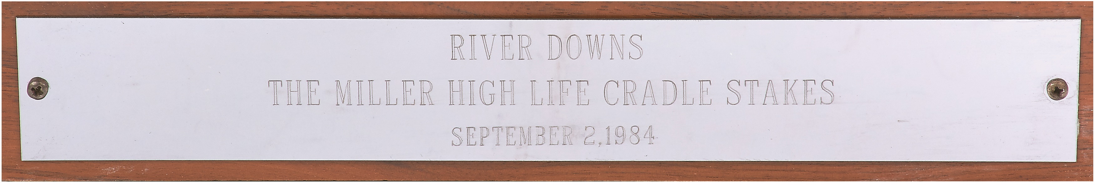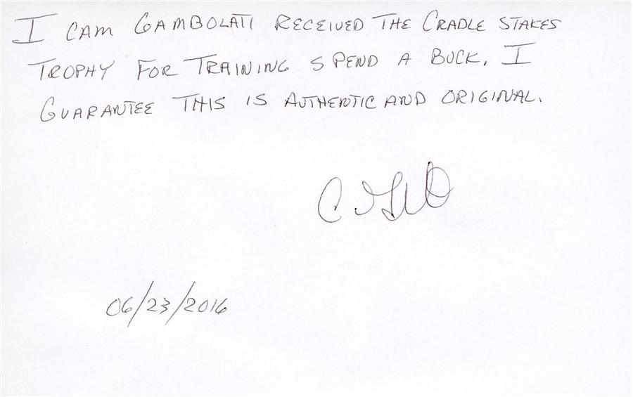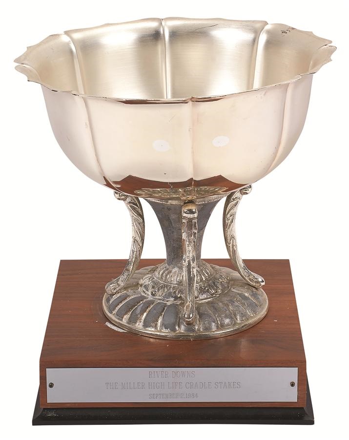 This hefty one-piece trophy consists of sliver bowl with wood base, and is the trainer's trophy from the 1984 Cradle Stakes at River Downs. Presented for Spend A Buck's victory at the Cincinnati track, the plaque is engraved "River Downs, The Miller High Life Cradle Stakes, September 2, 1984." It measures 9.25x11" including the base, and one of the four trophy arms is separated at the top. This historic item was obtained directly from trainer Cam Gambolati and comes with signed handwritten letter from him.