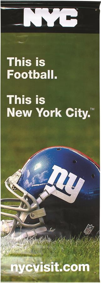 The New York Giants capped an improbable championship run with a 21-17 victory over New England in Super Bowl XLVI. On February 7, 2012, New York City gave the reigning champs a Super Bowl victory parade along Broadway's "Canyon of Heroes" as this 3x8' two-sided banner hung proudly along the parade route in view of tens of thousands of Giants fans, and now it can be yours.