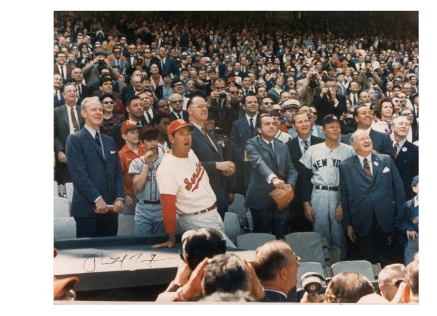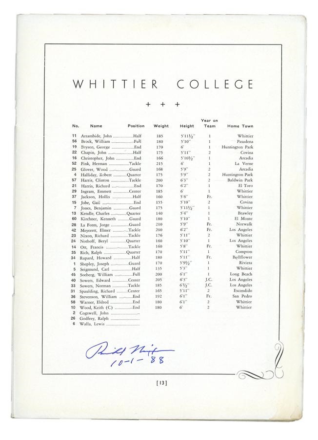 Three items of presidential import are contained in this lot. 1) Richard Nixon signed 8x10" color photo throwing out first pitch at Senators Opening Day, signed in 5/10 black felt tip pen. 2) 1933 Whittier College football program (VG) with Richard Nixon in the lineup. The roster page is signed by Nixon in 9/10 blue pen and also dated in his hand "10-1-88." 3) 1934 Michigan vs. Illinois program with Gerald Ford playing for U of M. This includes a very nice quarter page photo and bio on Ford inside the program, which is in VG condition.