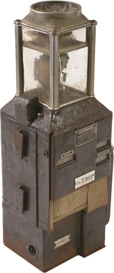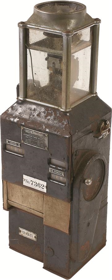 Here's a vintage piece with a great connection to Brooklyn baseball history. This fare box is of a kind used by trolleys to bring fans to and from Ebbetts Field and it has a patent date of 1914, but of course could have been made later. It has a black painted steel housing with nickel plated accessories. It has lots of patina but is all original and complete. One glass is cracked, an easy fix, and this one has the large change hopper on the bottom. It's a solid 24" high, 8.25" wide, and 7.5" deep, made by Johnson Fare Box Co. It requires 12 volt power and we have not tested it, though the mechanisms seem to be free. Ebbetts Field opened just one year before the patent date, in 1913, and through their many early nicknames, the shortened version of "Trolley Dodgers" is the one that eventually became official.