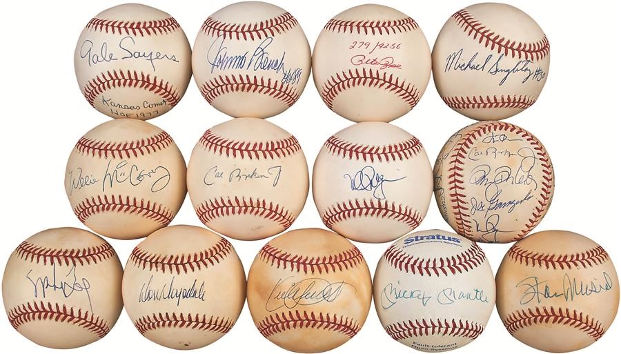 Have a ball with these 54 signed baseballs, mostly autographed by baseball Hall of Famers and legends, some NFL, some entertainment. Signatures include: Mickey Mantle, Kirby Puckett, Don Drysdale, Stan Musial, (2) Gale Sayers "Kansas Comet HOF 1977," Mike Singletary, Spike Lee, Johnny Bench "HOF 89", Cal Ripken Jr, Willie McCovey, Pete Rose, Don Mattingly, Harmon Killebrew "HOF 84", Steve Carlton, Ralph Kiner, Duke Snider, Lou Brock, Rollie Fingers, Hoyt Wilhelm, Brooks Robinson, Dan Quayle, 1992 Pirates, 1992 Expos, Celebrity ball with Gervin/Eruzione/Neal/Povich/Gillies, Multi-ball with Ripken/McGwire/Mattingly/Molitor/Yount/Eckersley. The baseballs are in varying conditions, as are the signatures, but overall there is some great content in this lot.