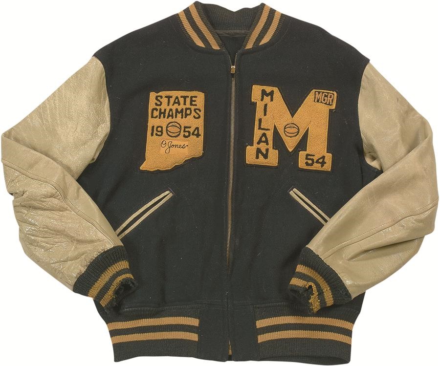 In 1954, the success of the Milan High School Indians in winning the Indiana State Championship became the stuff of legend, eventually depicted in the movie "Hoosiers." This great varsity jacket belonged to team manager Oliver Jones and comes with an LOA from him. Only a few of these are known to exist and they were only given to team members. It sports a yellow chenille "M" on the left breast, has a basketball in the center and "MILAN," "MGR," and "54." On the right breast is another yellow chenille patch in the shape of the state of Indiana with "STATE CHAMPS 1954, O. Jones" and a basketball between the "19" and "54." There are classic leather sleeves, blue body with yellow trim, the sleeve cuffs have some fraying and there is a one-inch tear on the right sleeve. The zipper on front is still in fine working order, and there's a "Cincinnati Athletic Goods" tag sewn inside. It's not easy to find memorabilia from the tiny school with the improbable history, let alone something this significant.