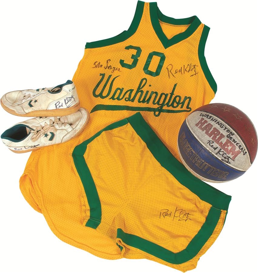 For the Harlem Globetrotters to be the "Clown Princes of Basketball," they need a foil, and for many years the Washington Generals admirably filled that role. This lot is a great selection from the man who originated that troupe in 1952, Louis "Red" Klotz, who is also a member of the Jewish Sports Hall of Fame. Included is: a red-white-and-blue Trotters game-used Baden ball signed by Klotz, with Washington Generals written in black marker. A pair of signed, game used Converse sneakers, white with green highlights. A full Generals game worn 1960s uniform with yellow jersey and shorts with green trim, both signed. The jersey is also signed by Sam Sawyer, who spent many years with the team, in particular "guarding" (and being tormented by) the great Meadowlark Lemon. All of the pieces show very nice use.