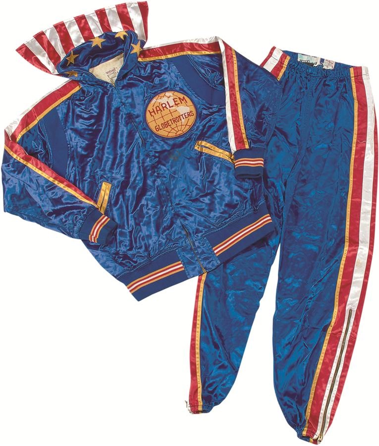 This blue satin warmup suit practically sparkles, as befitting the fame of the Harlem Globetrotters. It belonged to Herbert "Geese" Ausbie, most likely these were his rookie duds. Perhaps he wore them in his first game and kept them forever. The top is a Wilson size 44 zip-front with heavy Globetrotters logo sewn to the left breast, and the colorful red, white and blue with yellow stars collar that flows behind the uniform. The pants are size 34 with elastic and drawstring, in addition to zipped cuffs. Both pieces show great use with some stains, and the set is suitable for display. After turning down offers to play pro baseball and basketball, Geese embarked on a 25-year career with the Globbies, inheriting the mantle of "Clown Prince of Basketball" after the retirement of Meadowlark Lemon.