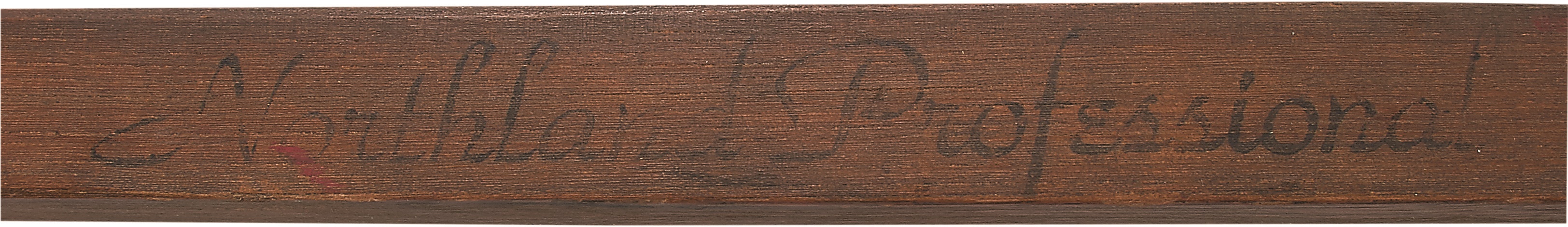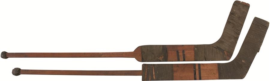 A far cry from today's gear, these all-wood hockey sticks date back to a pair of goalies in the 1940s. Both Northland Professional sticks are stamped; one for Chuck Rayner, Hall of Fame goalie for the NY Rangers, and the other for Baz Bastien who played for the Pittsburgh Hornets and then coached the team. Each has a butt-end of electrical tape, while cloth tape runs through much of the paddle and blade of each. The wood grain has settled in to a dark brown, and there is some cracking (thus, the cloth tape) and outstanding use shown throughout both pieces.