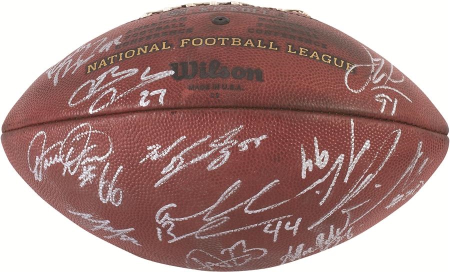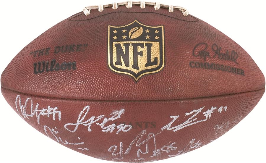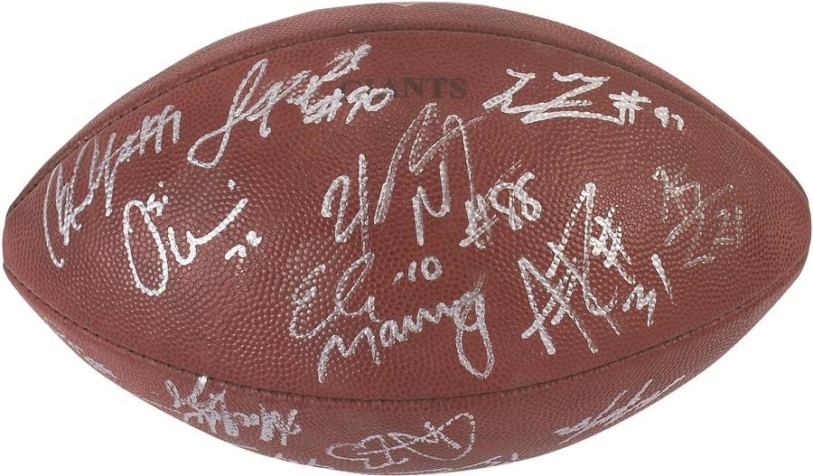 Signed by 19 members of 2010-11 Giants, this Official NFL Kickoff Wilson Duke football includes the likes of: Eli Manning, Brandon Jacobs, Jason Pierre-Paul, Hakeem Nicks, Ahmad Bradshaw, Justin Tuck, Mario Manningham, Osi Umenyiora, Mathias Kiwanuka, Aaron Ross, Chris Canty, Kenny Phillips and Corey Webster. The ball is in great condition, signed in silver Sharpie, though some signatures show smudging from players handling the ball. A gold-and-black NFL crest logo is on one pane, while the other has the "NFL Kickoff 2010" logo stamped into the ball. A beautiful display piece.
