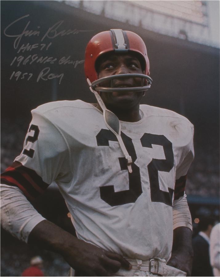 One of the finest Limited Edition signed photos you will see, legendary running back Jim Brown has signed in silver Sharpie, “HOF 71…1964 NFL Champs…1957 ROY” on this stunning image of the gladiator freezing at Yankee Stadium, wearing a fur-collared sidelines coat. Huge silver paint pen signature, gorgeous matte finish, Yankee Stadium towers over Jim Brown (as if anyone could). Dressed to impress, the greatest running back ever sports an orange Cleveland Browns helmet with his immortal “32.” It's stamped on back with the LE issue number LE/200. Jim Brown is contractually obligated never to sign this way again. In MINT condition.