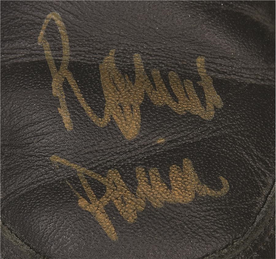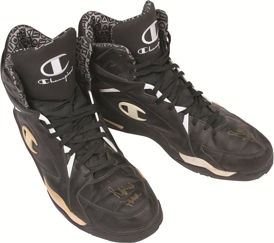 Despite playing most of his storied career with the Celtics, these were obtained during the one season Robert Parrish performed with the Charlotte Hornets. They come from the season's final game, his team's 85-84 Conference Quarter-final elimination at the hands of the Chicago Bulls, on May 4, 1995. Each black Champion Hightop is signed in gold on the toe, and the pair is photomatched to Getty Image 83561881. The sneakers show nice use and are in terrific condition. Comes with LOA from the original owner who obtained these shoes directly.