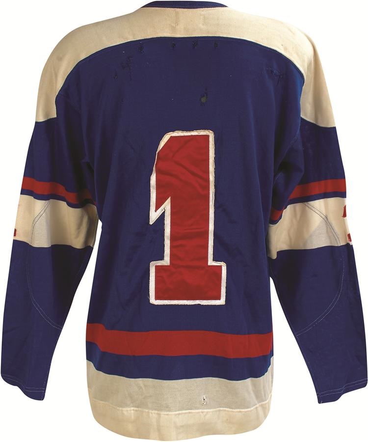 Fans of Nordique Nation will appreciate this blue jersey with red and white trim, which hearkens back to Quebec's days in the WHA. It is all-original but for the name that has been removed from the back, it features the Nordiques' logo on the front and large number "1" on the back and on both sleeves along with Maska and washing instruction tags in the collar. It shows nice use as there are some rips (team repaired and unrepaired) on the back where the name plate had been sewn on. Serge Aubry was Quebec's goalie in the early 1970s and perhaps the most vivid sign of how the sport has changed is that it is hard to imagine modern-day netminders' gear fitting into this relatively narrow top. -