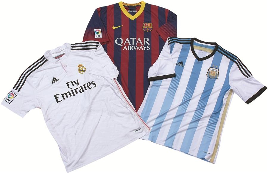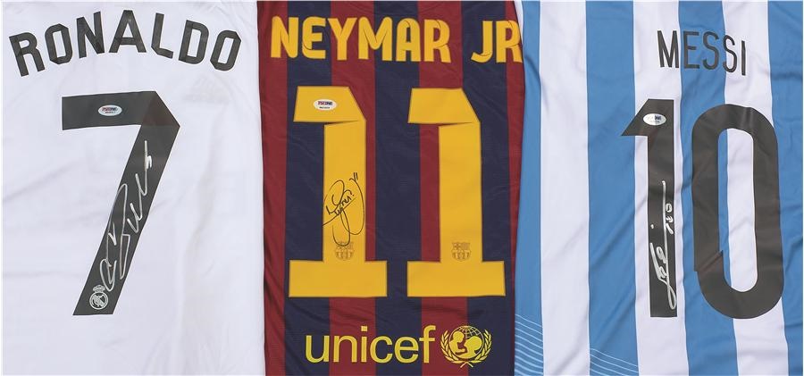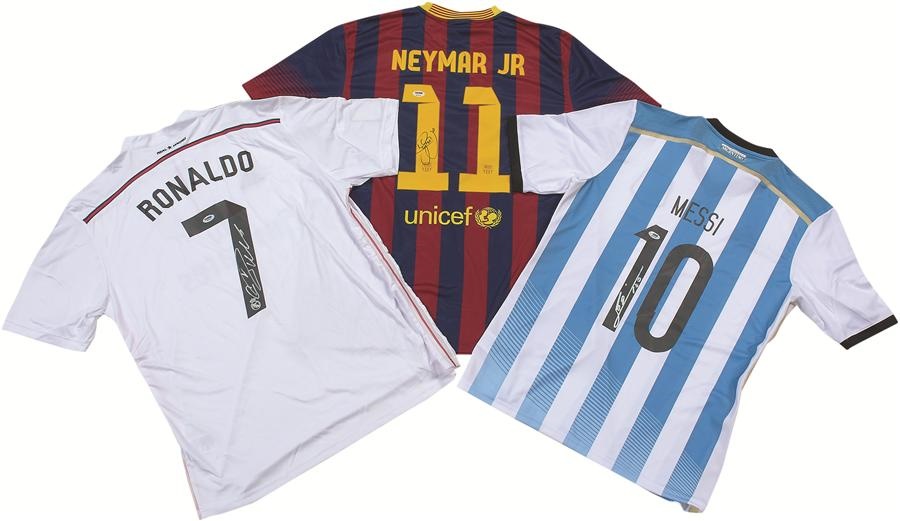 Fans of "The Beautiful Game" will leap at the chance to own these never-worn jerseys, signed by three of the world's best soccer players. FIFA World Player of the Year Lio Messi has signed the traditional blue-and-white striped jersey of Argentina in silver Sharpie on his number; the beautiful Adidas top features embroidered "AFA" patch and gold stars. Brazilian superstar Neymar has signed an FC Barcelona jersey in black Sharpie, with LFP and FCB patches sewn on. Finally, Portugese standout Christiano Ronaldo put silver Sharpie to a white Real Madrid top, with FCP and Madrid patches (there is some peeling to the Emirates letters on front). All are PSA Certified. This is simply an exquisite lot of current legends of the game.