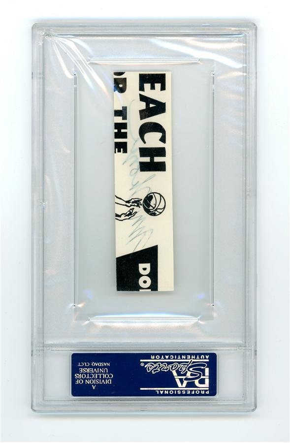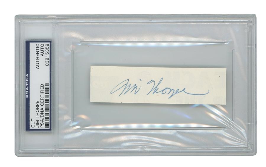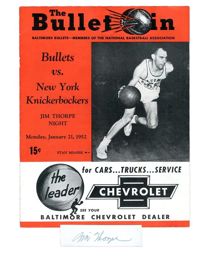 This perfect signature of Jim Thorpe was neatly removed from a page of this rare program, giving it new life and virtual displayability. The program is from the January 21, 1952, Baltimore Bullets basketball game against the New York Knicks. On the white section of the scorecard within, it was signed in person at the game with a deep blue ink “Jim Thorpe.” Signed in the last year or so of his life, Thorpe was being rediscovered (like the great Babe Ruth a few years before) when it was nearly too late. Recently named as the “Greatest Athlete of the Half Century” (AP) and his wife admitting to being broke and taken advantage of by people over his life, Thorpe was finally getting some appreciation for a contribution that defies words. Thorpe signature slabbed authentic by PSA.