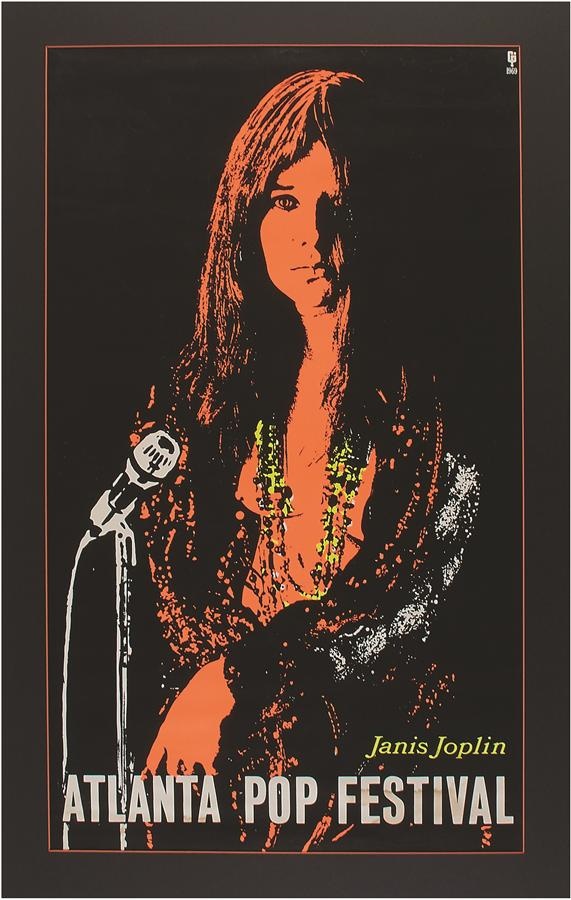 Rich and luxurious, this blacklight poster in brilliant day-glo neon boasts delicate artistry and simply stunning design. Colors are bright and rich, and on par with some of the best poster graphics you will ever see. Original and a first printing, this promoted Janis Joplin at the 1969 Atlanta Pop Festival, only one month before Woodstock. That glorious festival was held on July 4th-5th at the Atlanta International Raceway and also featured none other than Led Zeppelin. There is only one other version of this poster known at a smaller size of 20x30", in this version the poster itself is approximately 21x36" and overall with matting 25x40". The previous version brought over $8,300 at auction without the matte, but this one is matted and we believe mounted on foamcore, which should be is easily removable. There is some water staining in the titles at bottom but it is otherwise in EX condition. This truly belongs in the pantheon of psychedelic art, a great find in the poster world and in the world of Janis.