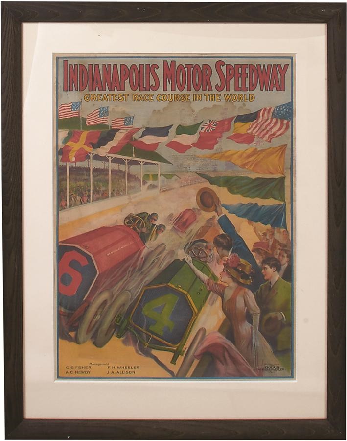 Spectacular art nouveau design, this 1909 Indianapolis Motor Speedway offering is in the pantheon of racing posters, perhaps the finest ever produced from the historic opening of this penultimate facility; at 400,000 total it is the highest-capacity sports venue in the world. Displaying incredibly vivid lithography and printed on heavier stock, this was created by the Otis Company and this 20x26" poster is framed to 28x36". To understand its significance, one copy is held by the Library of Congress, and this one was found in a desk belonging to Wilbur Shaw, President of the Indianapolis Motor Speedway from 1945 until his death in 1954. Shaw was also a race car driver, winning the Indianapolis 500 three times, the first to win twice in a row. There is a small hole in the upper margin, otherwise it is in EX condition.