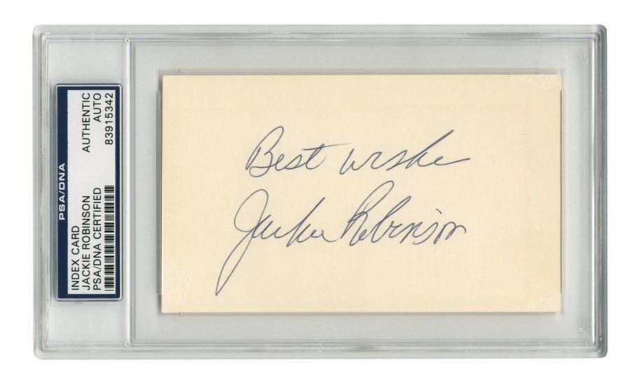 A stunning 10/10 signature from Jackie Robinson graces this 3x5" index card, which includes "Best Wishes" inscription. Both card and signature, in blue ball point pen, are in MINT condition, it looks like it was signed yesterday. A simple, perfect keepsake of one of the seminal figures in American sports history. Comes encapsulated by PSA/DNA.