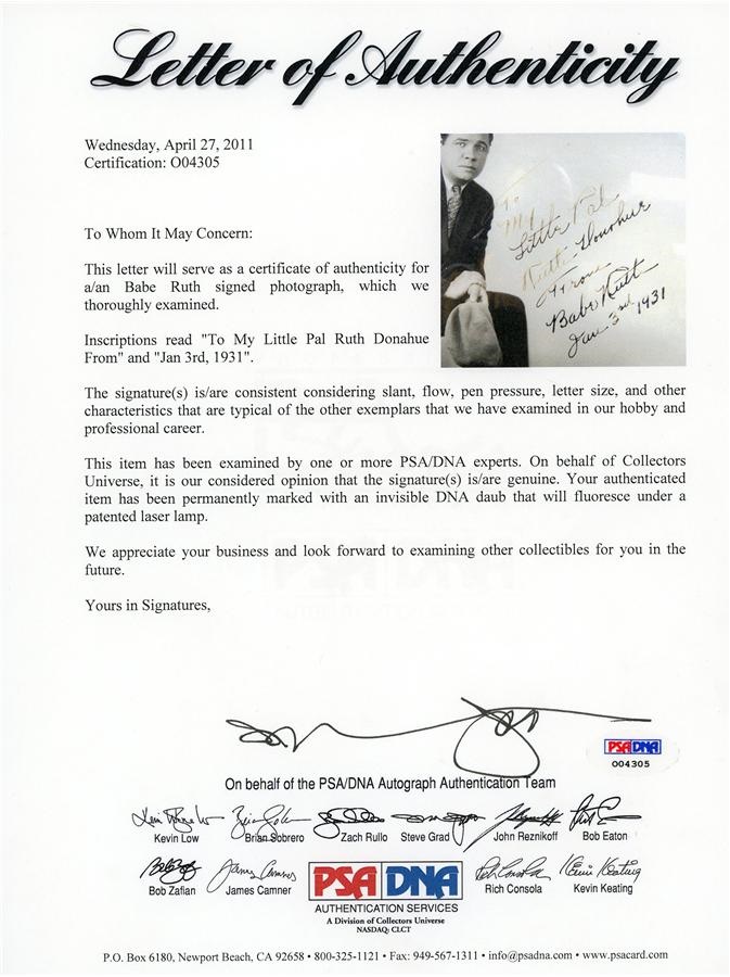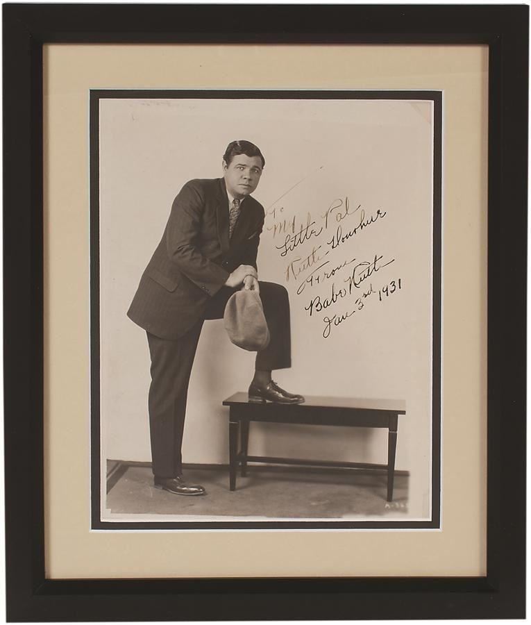 What makes this piece so interesting is that the Great Bambino signed "Ruth" twice; one for his signature and one on the inscription. This 8x10" Type I photo of Babe Ruth is inscribed "To My Little Pal Ruth Donohue, From Babe Ruth, Jan 3rd, 1931," and the signature is the boldest part of the writing. Framed with museum quality UV glass, and measuring 12x14", it comes with PSA/DNA LOA. The Babe was friends with a man named Jimmie Donohue, who owned a restaurant in NJ; this may very well be Jimmie's daughter. The photo has minor creasing, but it's a perfect image of the dapper legend in suit and tie.