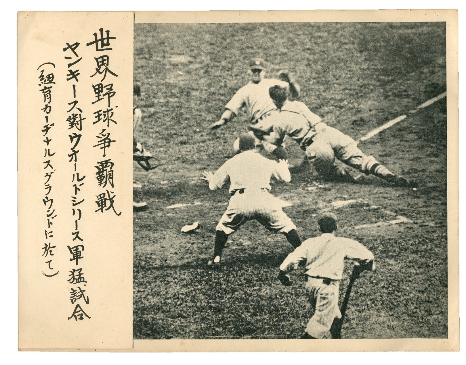 Evidence that it is indeed the "World" Series, this Japanese poster advertising the 1926 Fall Classic features Japanese writing on the left margin describing the scene shown. The picture comes from the second game of the 1926 World Series, New York Yankees vs. St. Louis Cardinals, won by the Redbirds in seven games.
