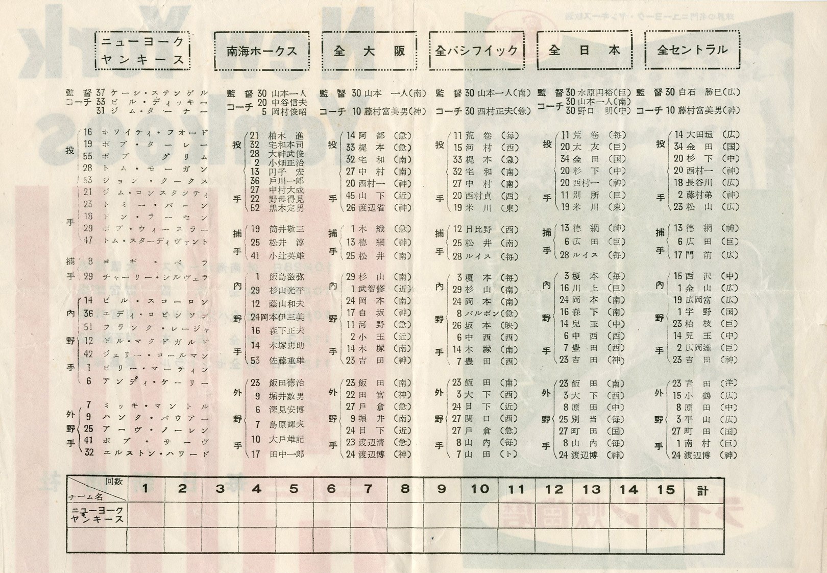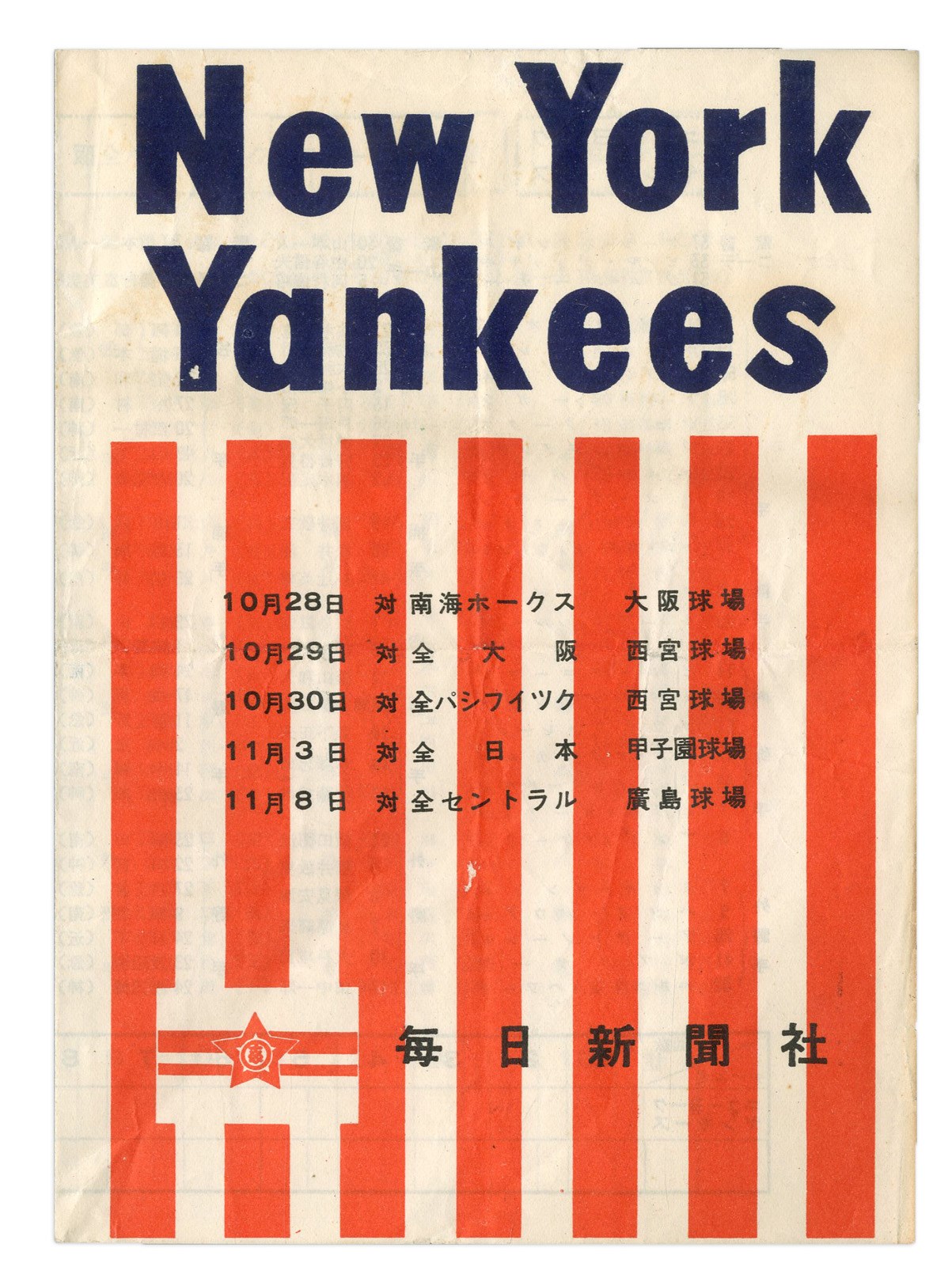 Exactly one week after losing the World Series to their hated rivals from Brooklyn, the Yankees embarked on a 25-game barnstorming trip across Asia, including 16 undefeated games in Japan (15 wins, one tie). From that historic swing comes this clean, 7x5" scorecard (only the final score of 4-2 is noted) with the players' names written in Japanese. There's a Yankees team photo of the reverse and the scorecard is dated October 30, 1955. Thirty-nine years later, the Yanks would return to Japan to play two regular-season games against Tampa Bay.