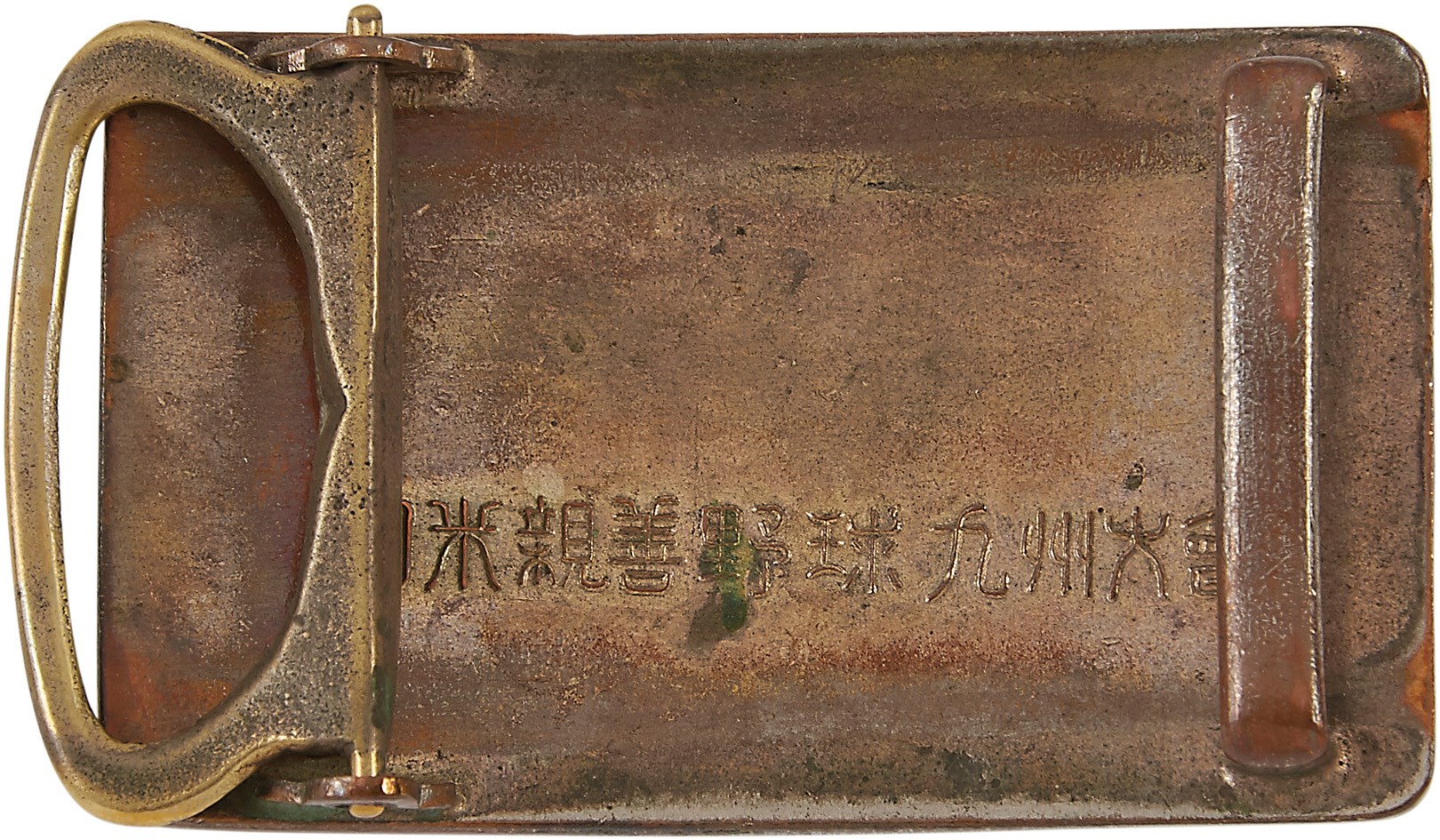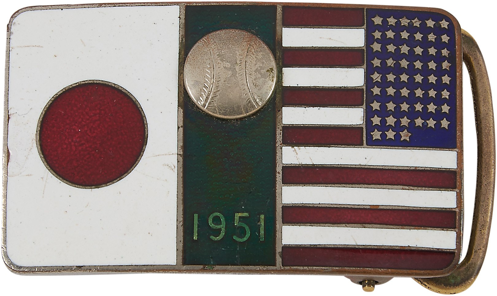 An important yet light-hearted diplomatic endeavor in the post-WWII world, the 1951 Joe DiMaggio All Star Tour of Japan did much to engender peace between the two nations as well as promote America's favorite pastime abroad. This belt buckle from the event joins the flags of the two countries, who were at war only six years prior, with a blue stripe containing a baseball and "1951" in the middle. The back reads "Japan U.S. Goodwill Baseball Kyushu Tournament" all in Japanese characters. There is a small chip and some scratching to the enamel.
