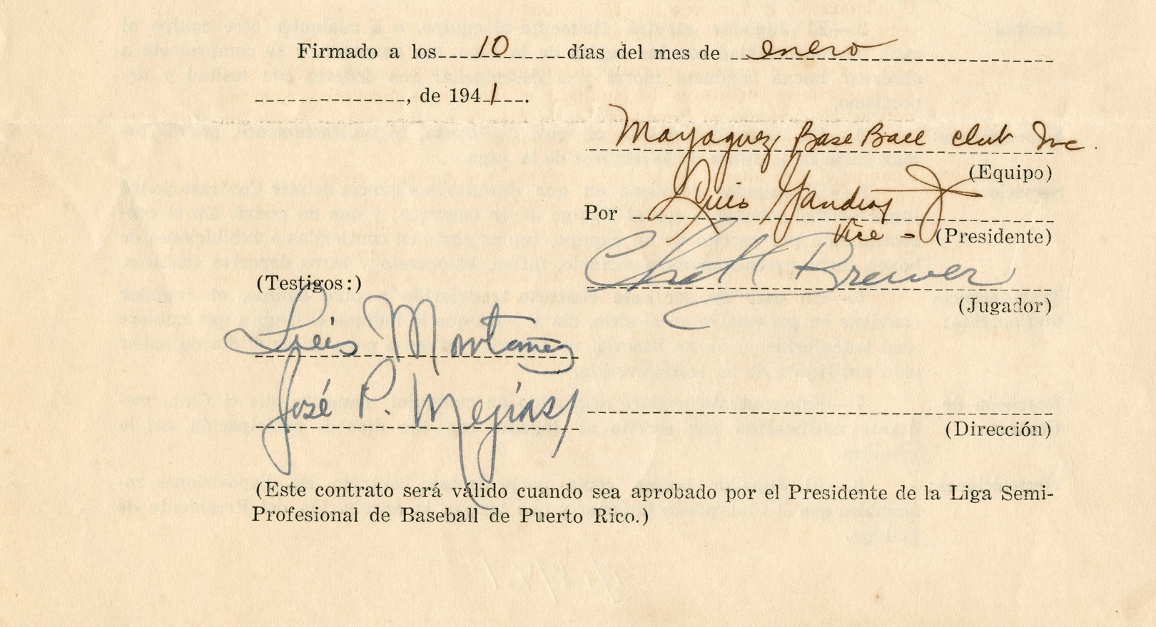 He was a 24-year veteran and an integral part of the Kansas City Monarchs' legendary rotation with Satchel Paige and "Bullet" Joe Rogan. Chet Brewer was an international superstar and coached a young Jackie Robinson as manager of the Kansas City Royals of the California Winter League in 1945. He signed this Spanish-language contract, representing one of his various stops across the globe, playing for the Mayaguez Indians in Puerto Rico. A gorgeous signature further elevates the quality of the lot.