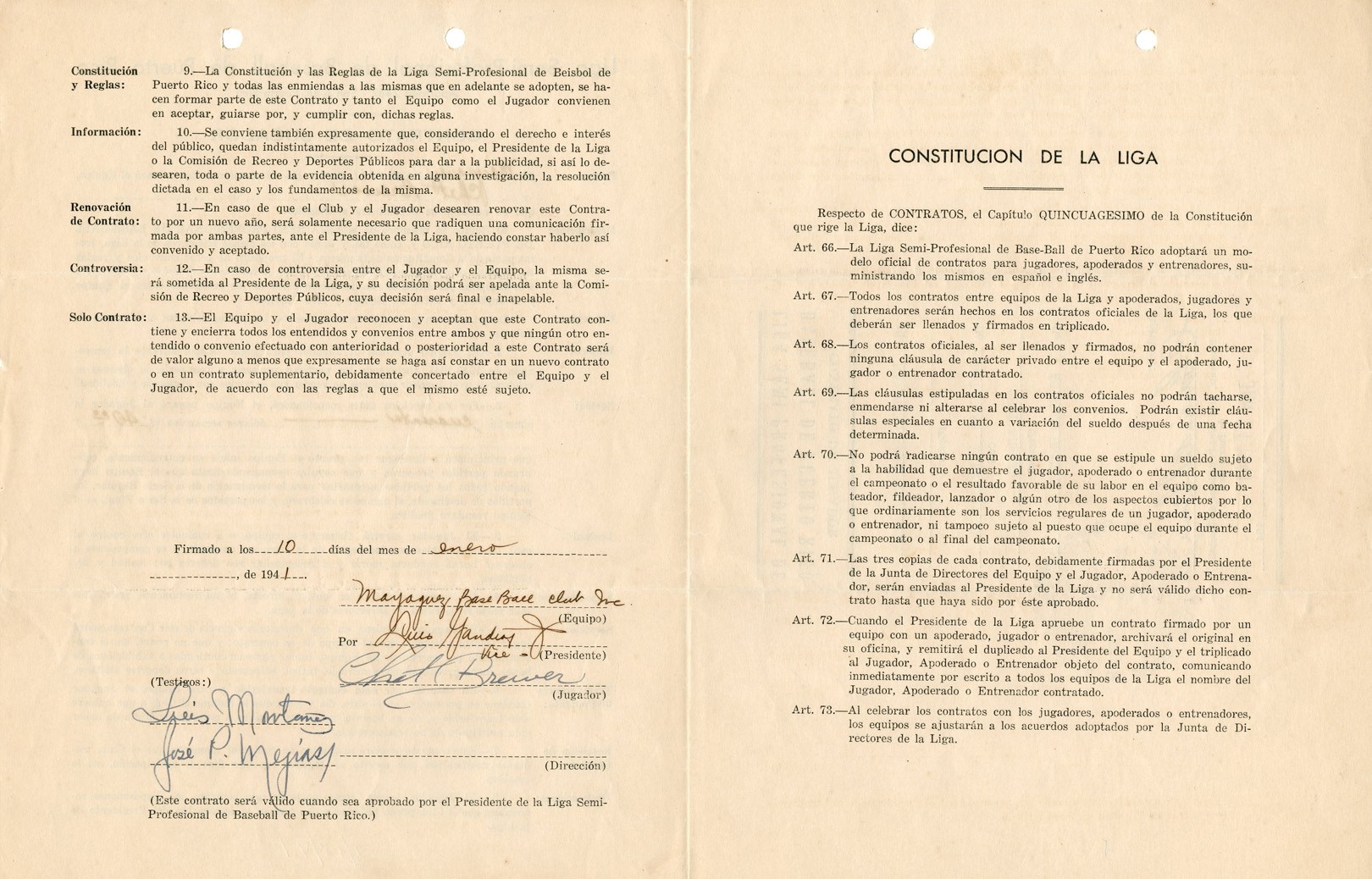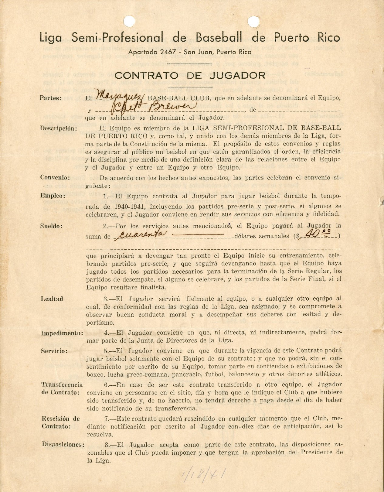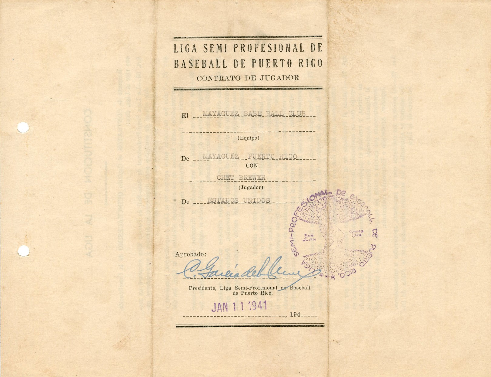 Lot # 416: 1940-41 Chet Brewer Mayaquez Indians Contract