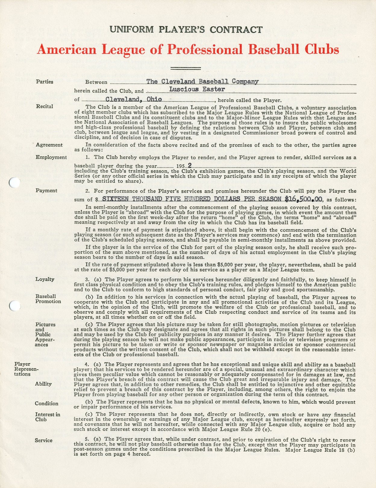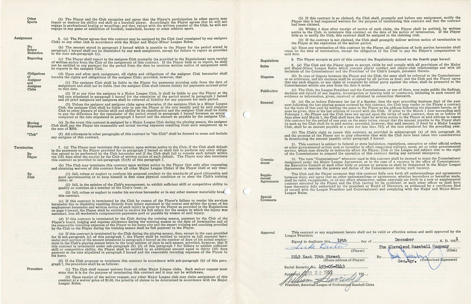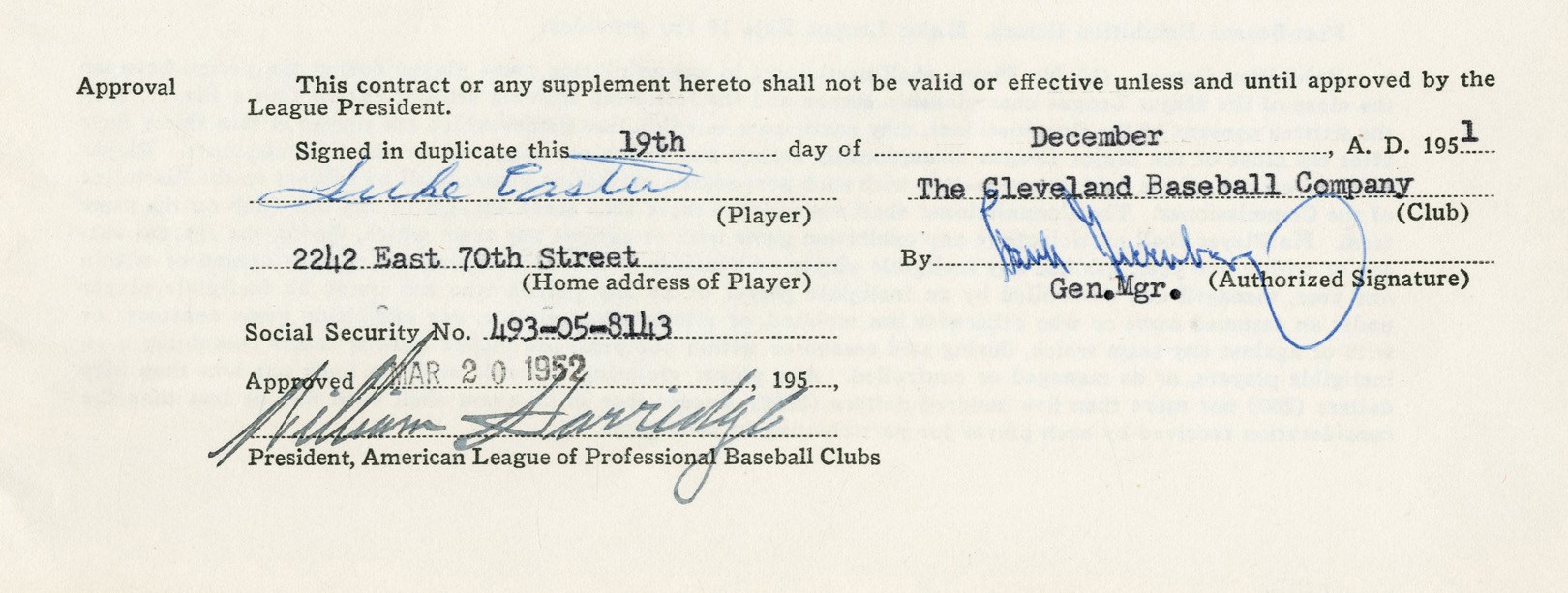 Though his Major League stint was rather brief, Luke Easter is an important name in baseball history. Easter, known for his titanic home runs, won the final Negro League World Series in 1948 before being signed by the Cleveland Indians the following year. This contract comes from his 1952 season with the Indians, the last successful one in his playing career before nagging injuries forced his retirement two years later. It is NM, and signed by William Harridge, Hank Greenberg, and Easter, who was shot and killed in 1979 for the payroll he was carrying.