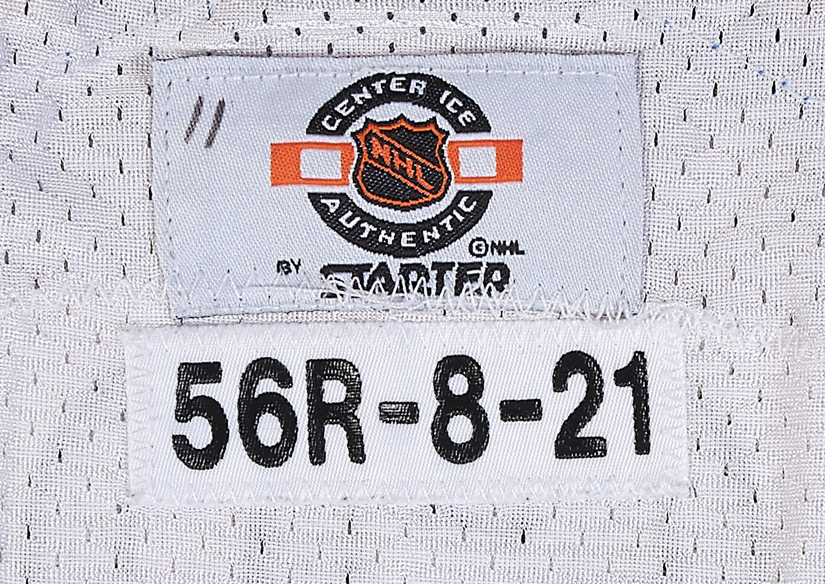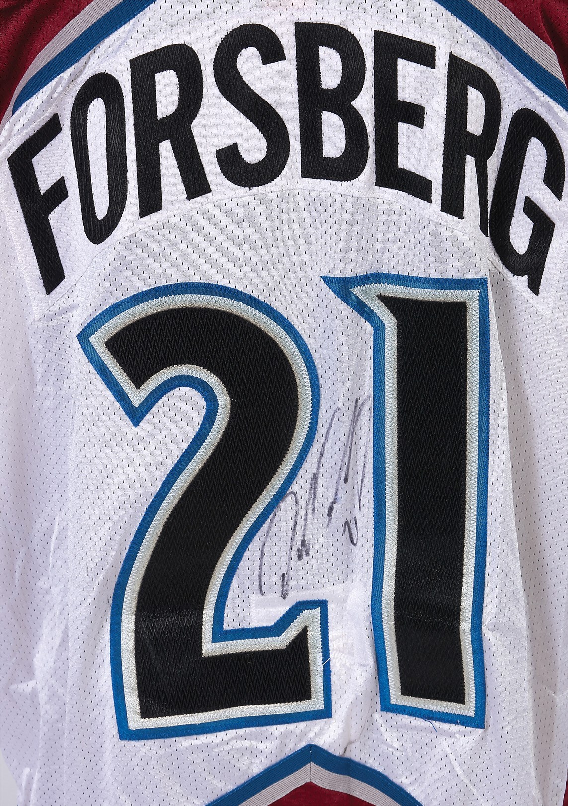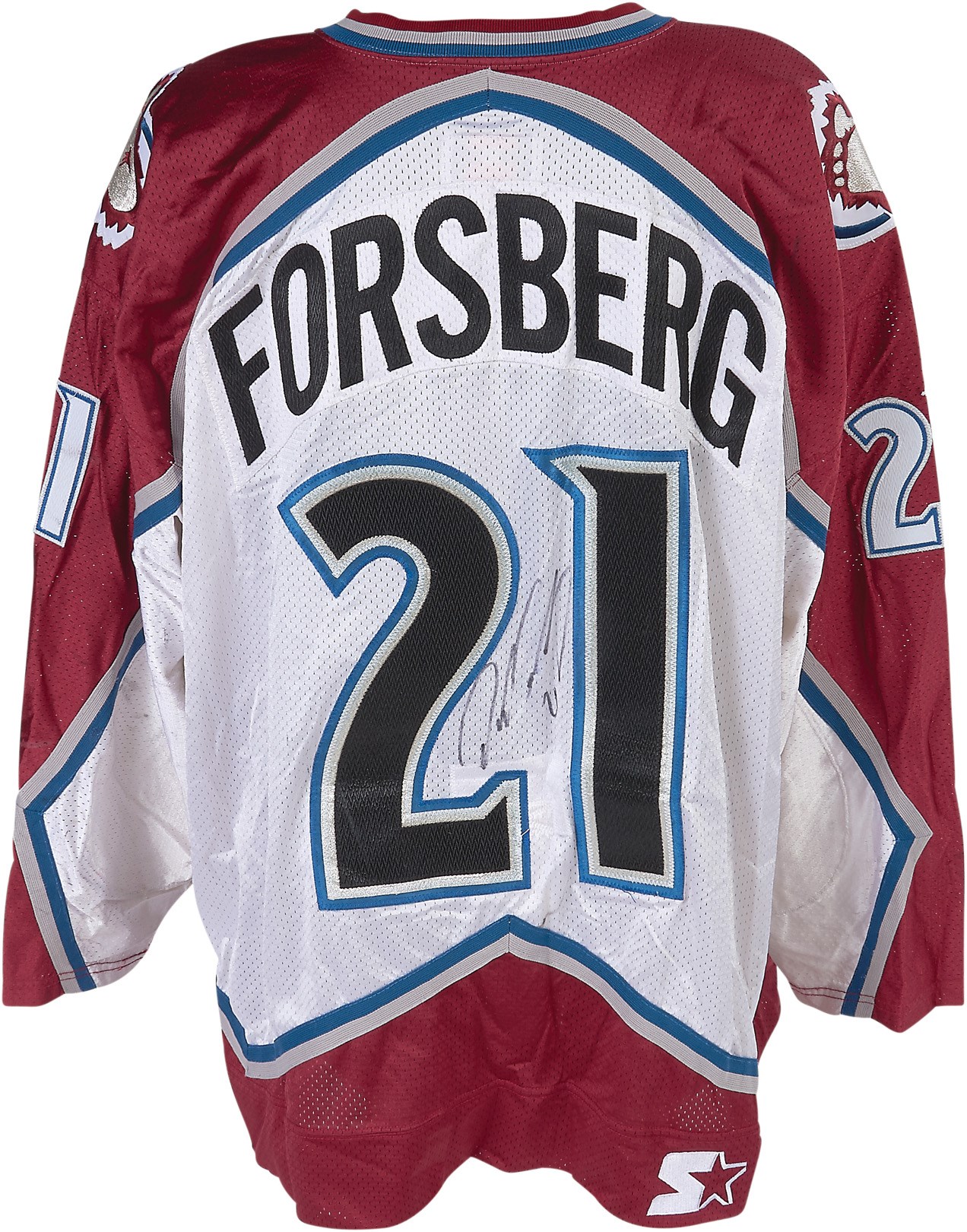 Known for his elite combination of skill and physical play, Peter Forsberg almost single-handedly redefined the "European" style of hockey, making him an easy Hall of Fame choice. This all-original home white jersey was game-worn by Forsberg in the 1998-99 season and has been photo-matched to March 20th, 1999 when the Avalanche tied the Blackhawks 5-5. In this game Forsberg had an assist. Shows heavy use with plenty of stick marks, paint transfers, pulls and a few small rips and burns. Starter tag is in the collar with 56R-8-21 strip tag below, "II" on Starter tag (indicating set 2). The Swedish legend's number "21" is on back and sleeves, with "FORSBERG" sewn on a plate on the back and also signed on the back in 7/10 black Sharpie. Starter and NHL logos are embroidered on the maroon tail, fight strap is present and intact. Forsberg had 30 goals in that All-Star season and two years later, he helped the Avalanche win their second Stanley Cup title. Comes with LOA from MeiGrey Group and has been photo-matched.
