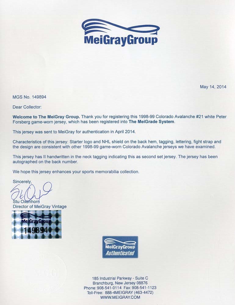 Lot # 452: 1998-99 Peter Forsberg Colorado Avalanche Game Worn Jersey (Photo-Matched, MeiGray)