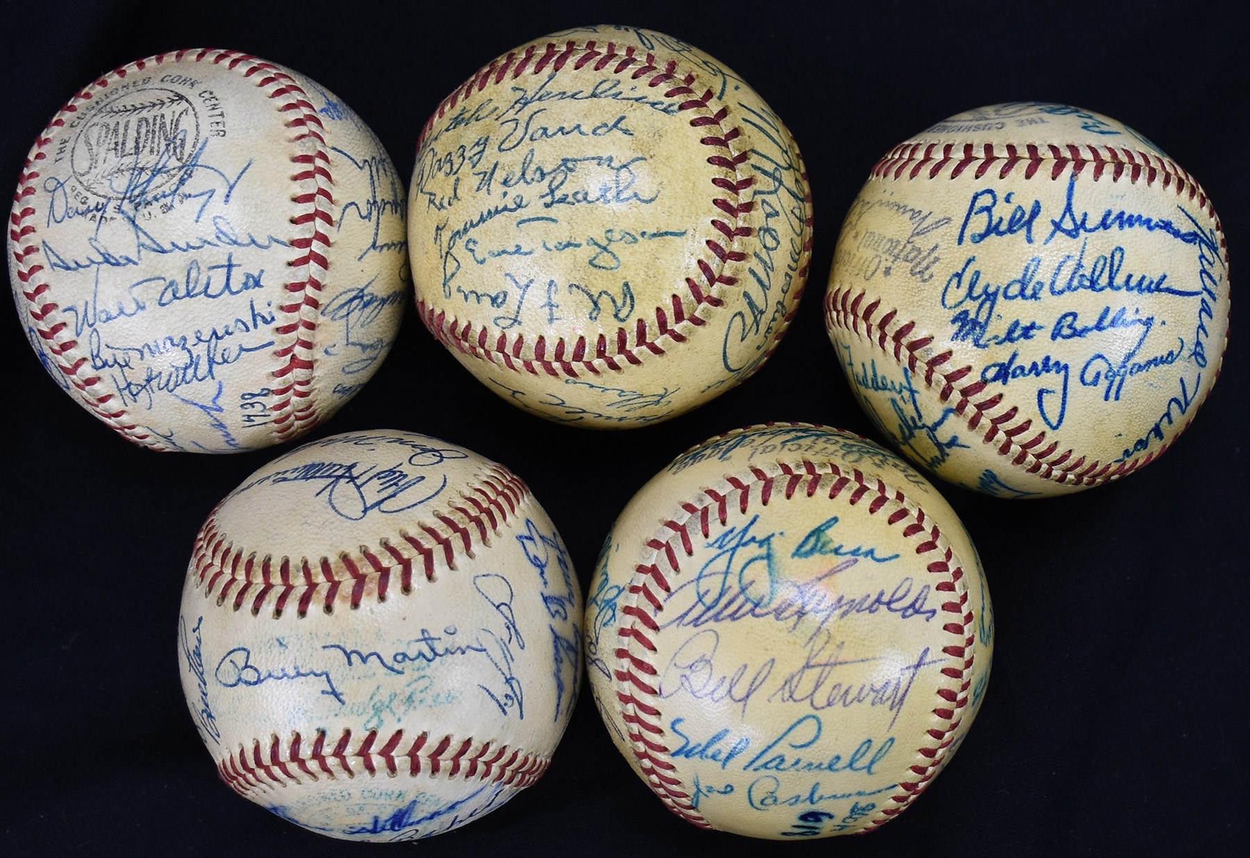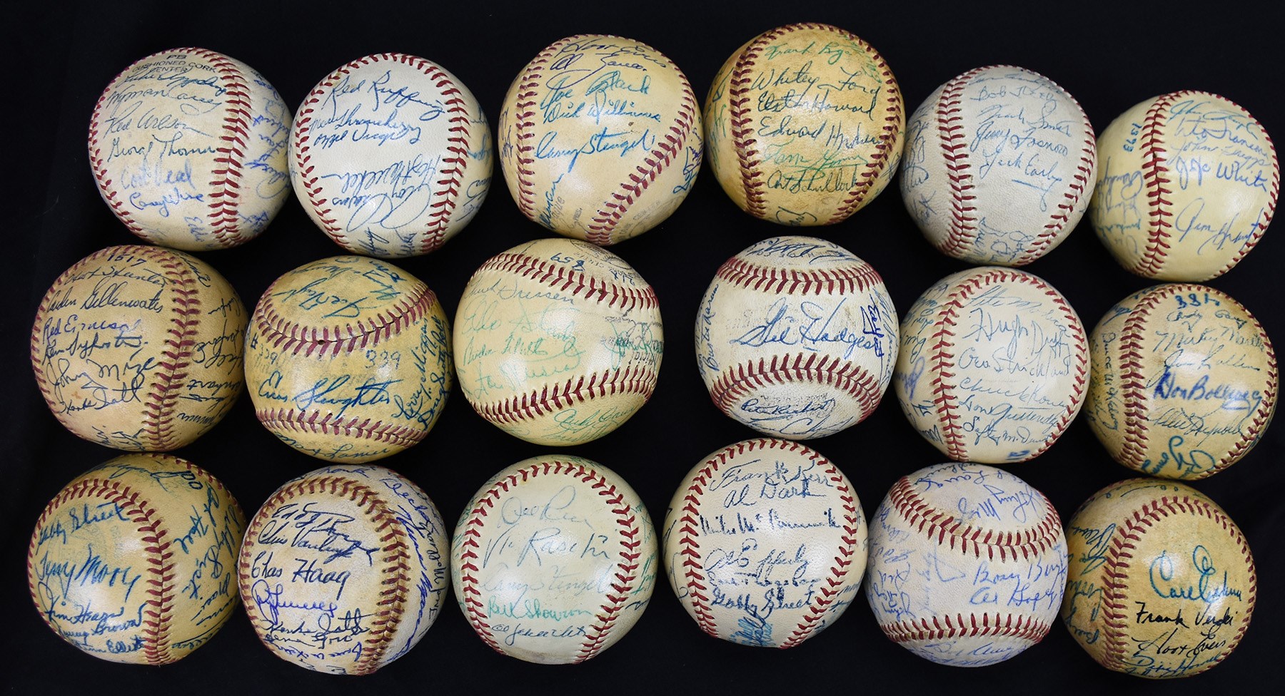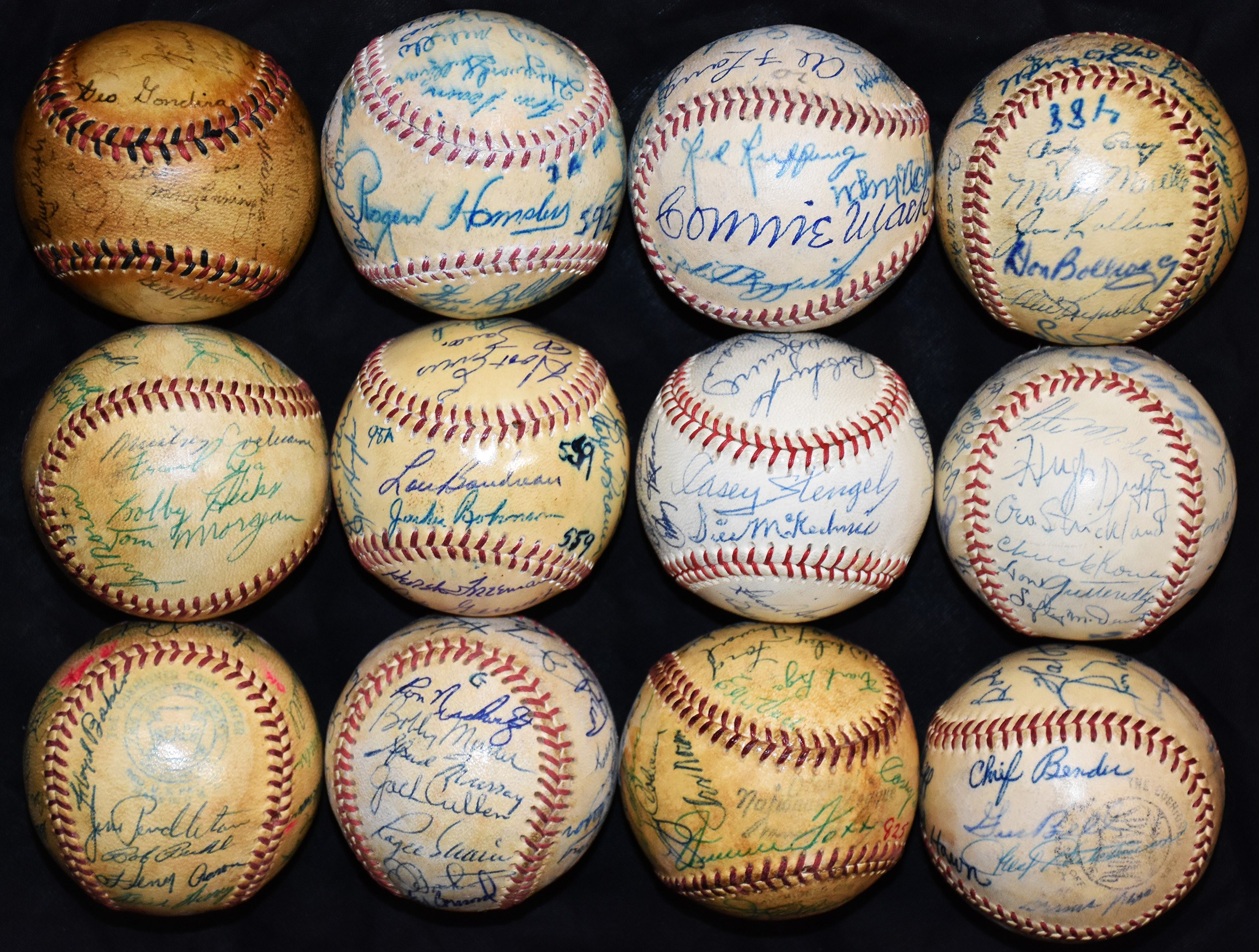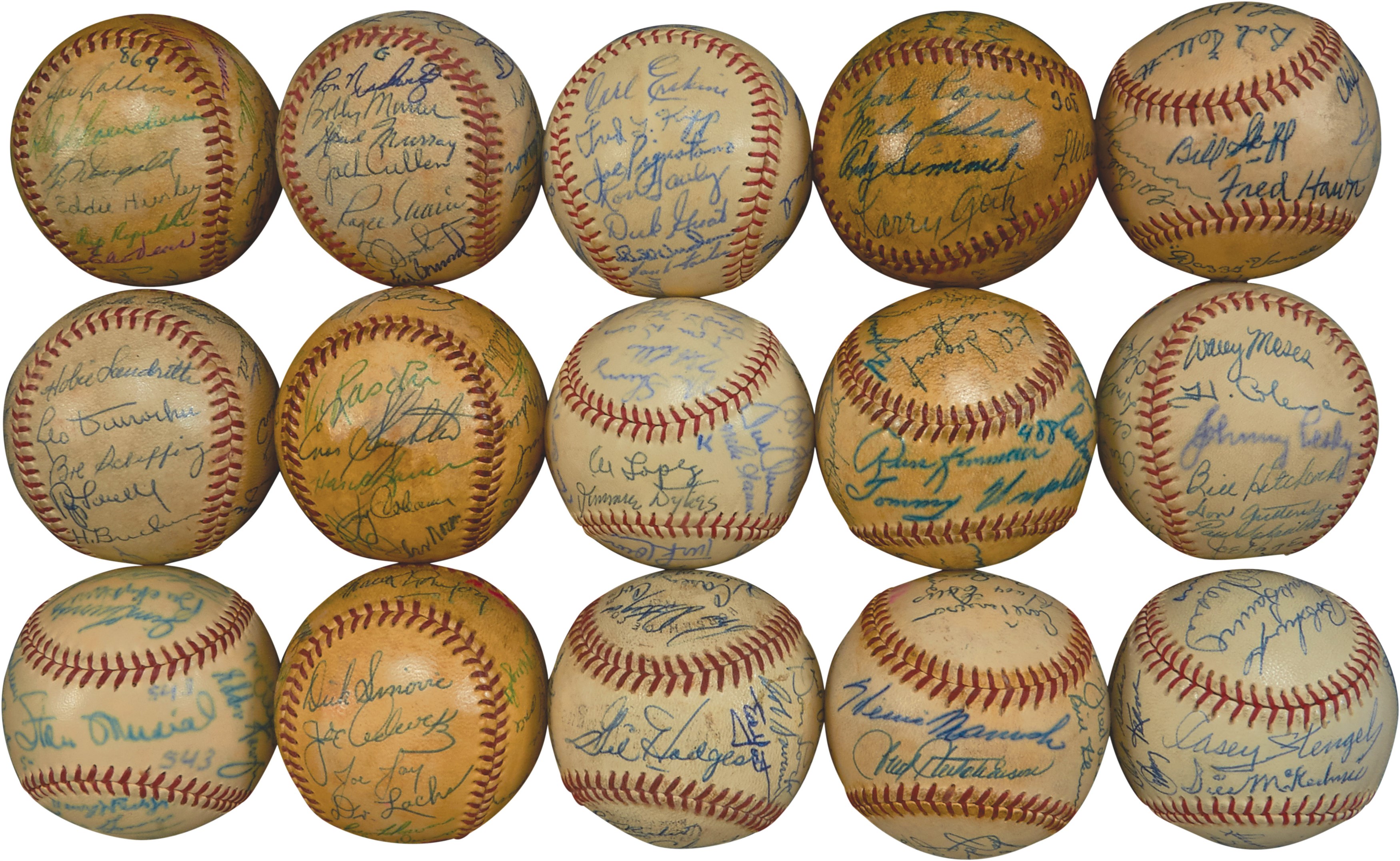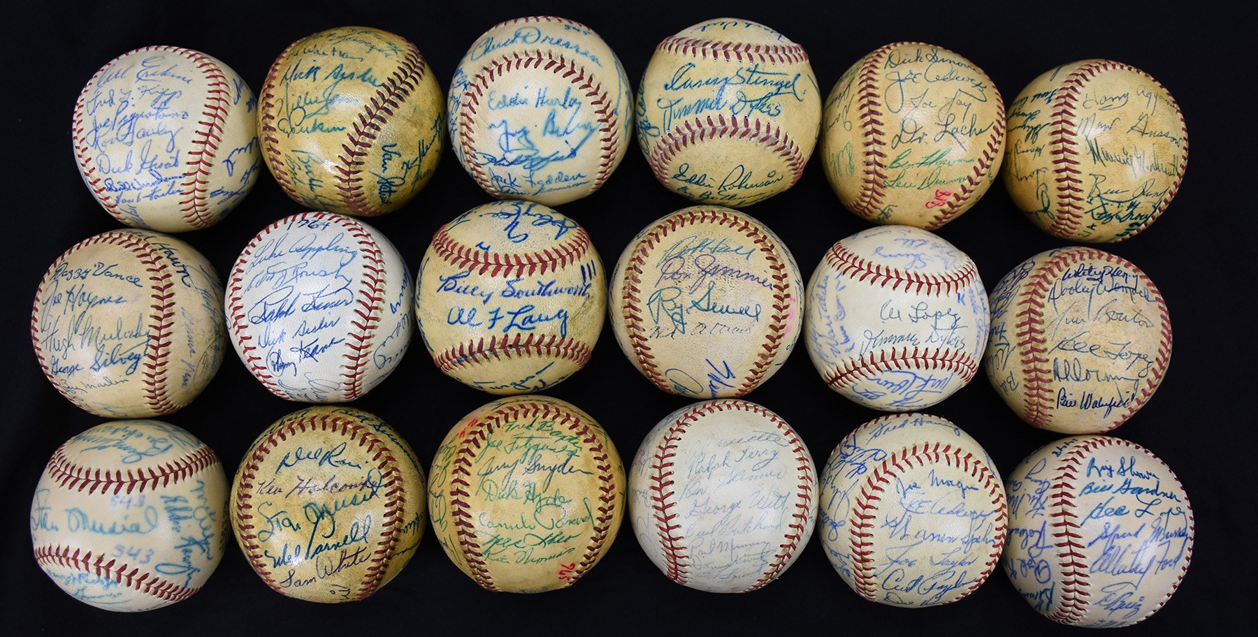 It just doesn't get much better than this. Over 45 Hall of Fame, Old Timers and team-signed baseballs, with an average of 25 period signatures per ball, making for over 1,000 total! Each is signed on either Official National League or American League Frick, Giles, Harridge and Cronin balls, with signatures including: Lou Gehrig, Jimmie Foxx, Jackie Robinson, Rogers Hornsby, Mickey Mantle (1952), Joe DiMaggio, Harry Heilmann, Connie Mack, Chief Bender, Mickey Cochrane, Heine Manush (6), Casey Stengel (7), Don Hoak (2), Hugh Duffy, Gabby Hartnett, Roy Campanella (3), Dizzy Dean, Pie Traynor, Paul Waner, Roger Maris, Grantland Rice, Sandy Koufax, Stan Musial, Hank Aaron, Bill McKechnie (9), Dazzy Vance, Gil Hodges (5), Walt Alston, Bil Dickey, Rip Sewell, Billy Southworth, Harry Agganis (3), Joe E. Brown, Billy Martin, Ford Frick, Yogi Berra, Elston Howard and Joe Gordon. Among the highlights are a 1937 World Champion Yankees ball with Gehrig and DiMaggio, 1952 World Champion Yankees with Mickey Mantle and 1954 Milwaukee Braves with rookie "Henry" Aaron. Signatures average 7.0, with the balls averaging 6.0 with some being much nicer. All come with Reach ball bags and have handwritten inventory numbers from the massive signed baseball collection.