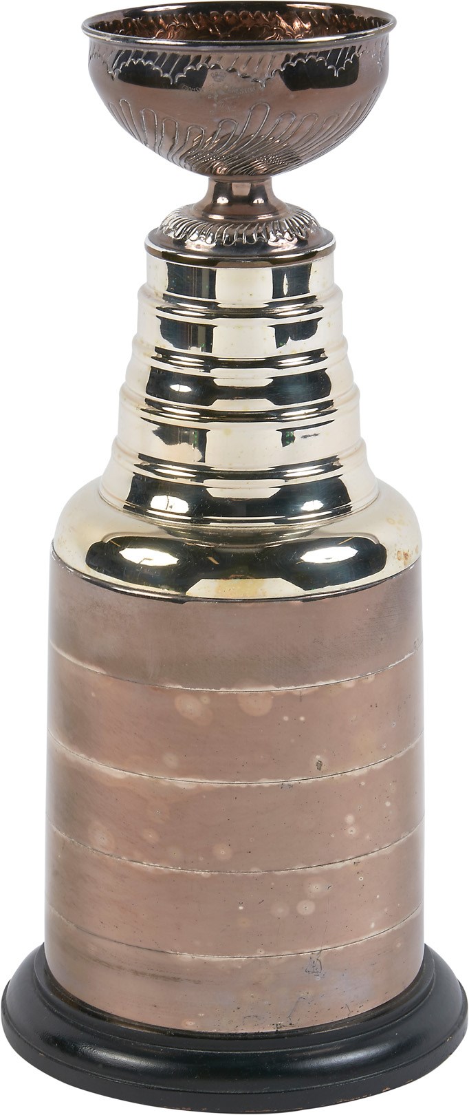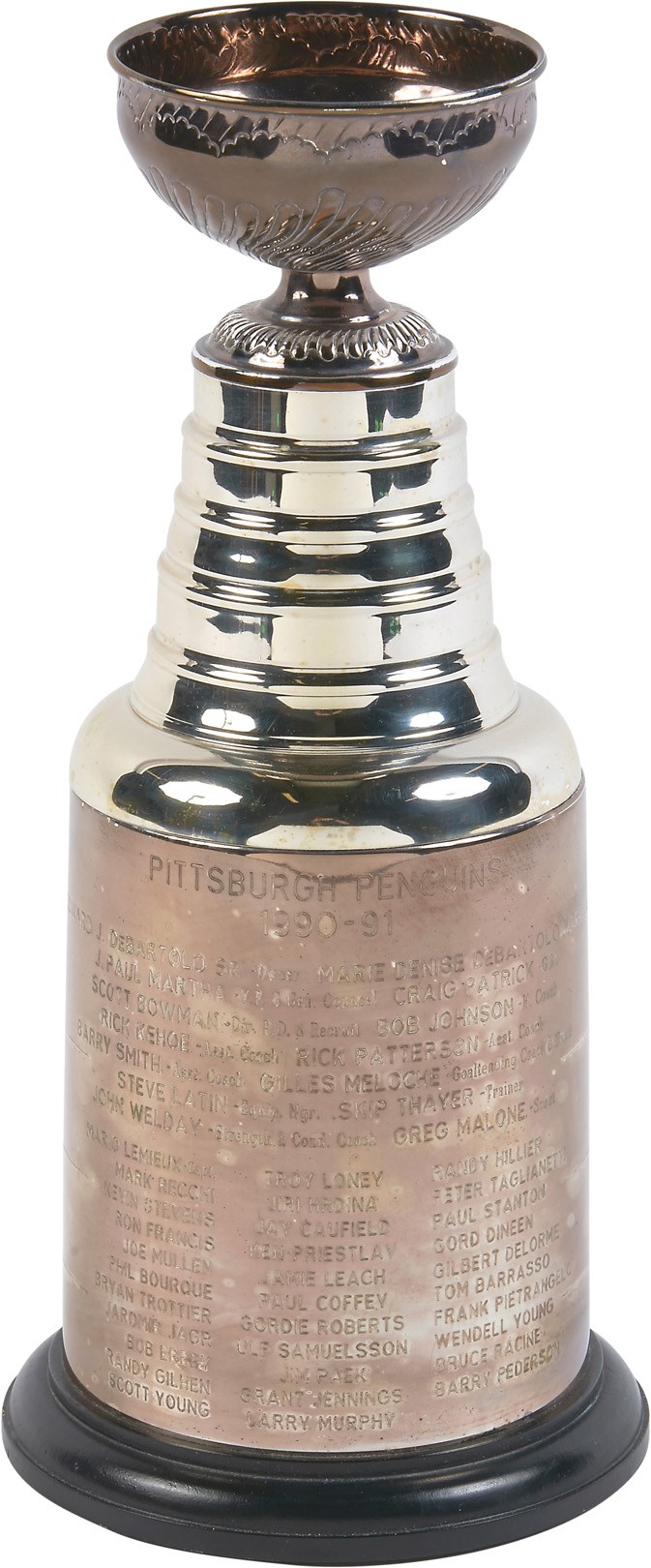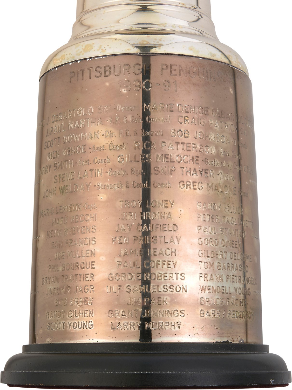 Despite missing the playoffs for seven of eight years and losing superstar Mario Lemieux to injury for half the season, the 1990-91 Pittsburgh Penguins defied the odds and captured the first of their five Stanley Cups. This is a miniature version of the most famous championship trophy in all of sports and was awarded to Kevin Stevens. The silver cup, which measures 13", was awarded to the players on the team, all of whose names are etched on the base, along with the executives, coaches, trainers, etc. There is brown felt on the bottom with a Boffey sticker attached. There is slight toning to the silver color but overall is in EX-MT to NM condition. Six members of that Penguins team, as well as three off-ice officials, have been elected to the Hockey Hall of Fame, and another - Jaromir Jagr - is a shoo-in when he eventually retires. The Penguins would go on to repeat as champions the following season.