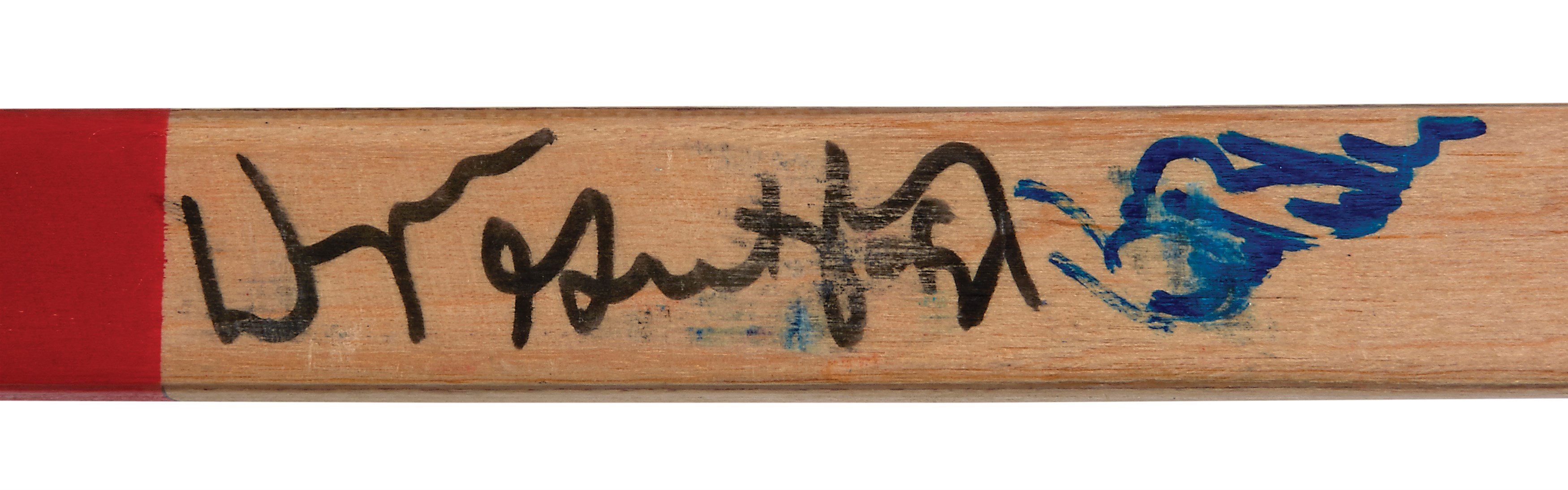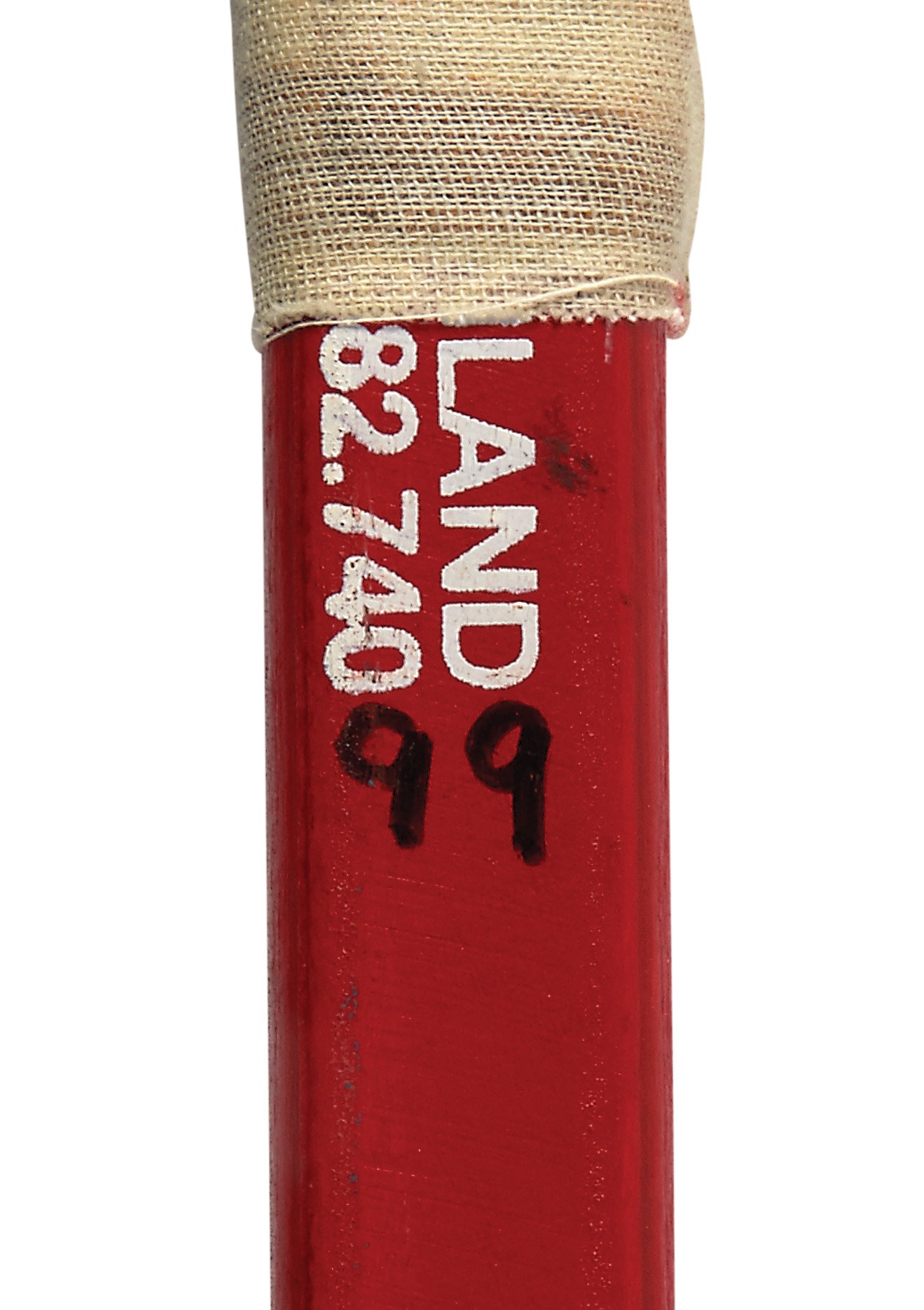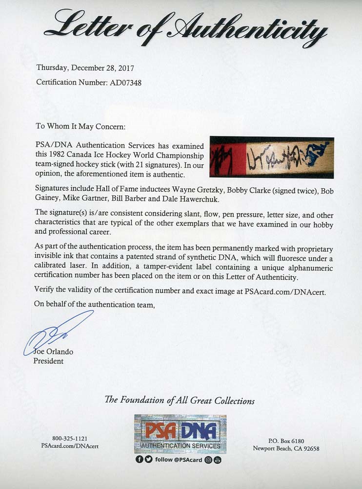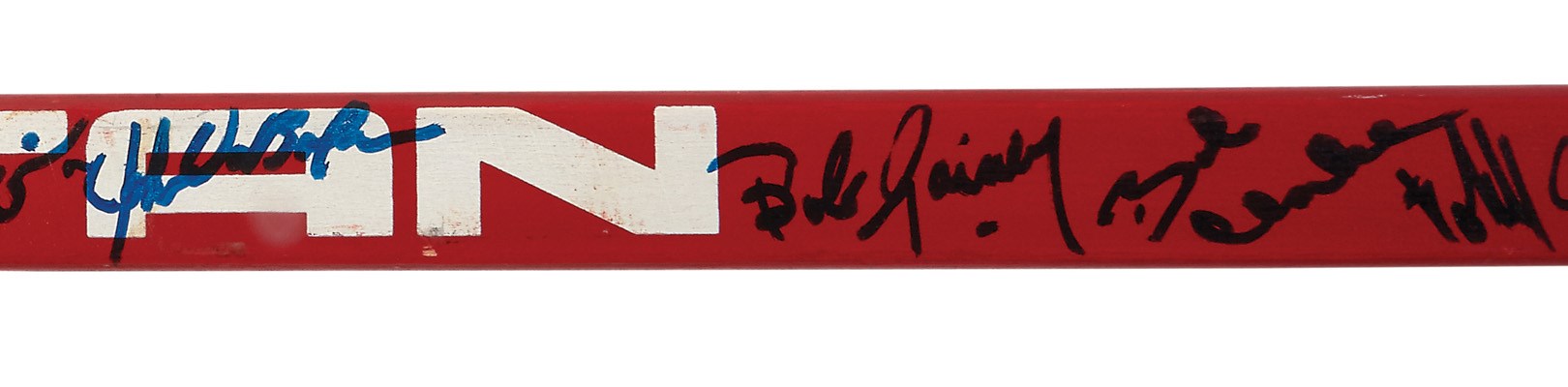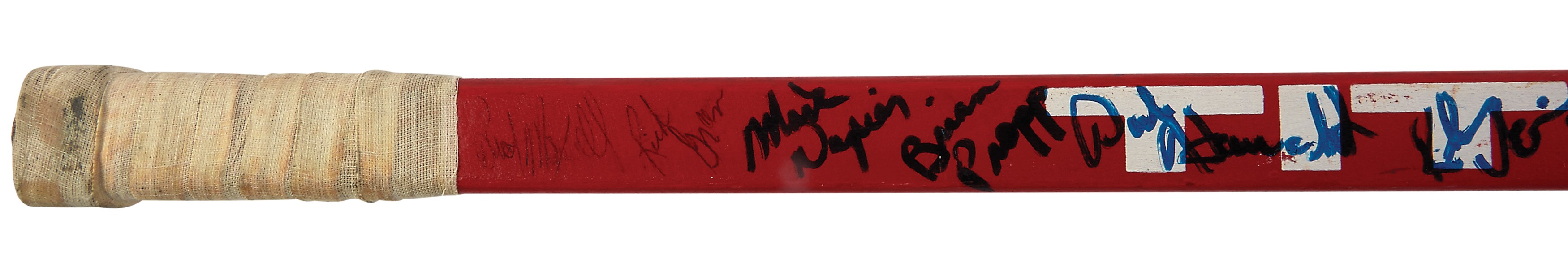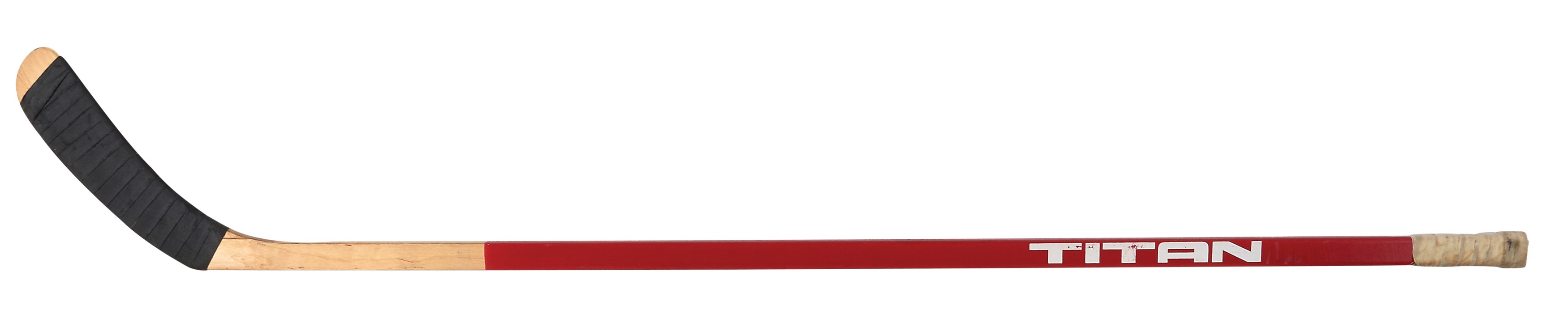 This classic red Titan hockey stick originates from the 1982 IIHF World Championships and was used by none other than a youthful Wayne Gretzky. It has original tape on the butt end and the blade and shows light but definite use. The Great One's number "99" is written in marker at the top of the shaft, which is beautifully signed by 20 of Team Canada's players including: Gretzky, Bill Barber, Bobby Clarke, Mike Gartner, Dale Hawerchuk, Kevin Lowe, Gilles Meloche, Brian Propp, Darryl Sittler and more. The Canadians finished third, taking the bronze at that championship while being led by Wayne Gretzky's tournament-high 14 points. Includes PSA LOA.