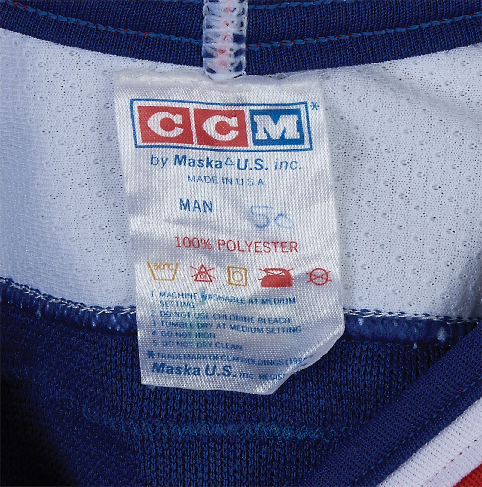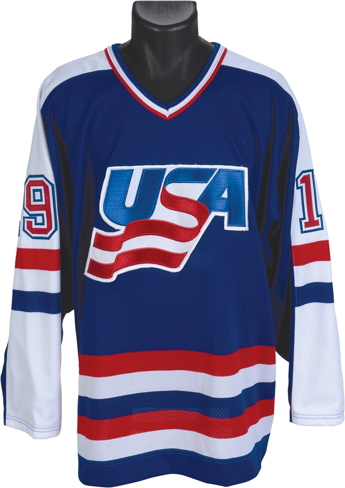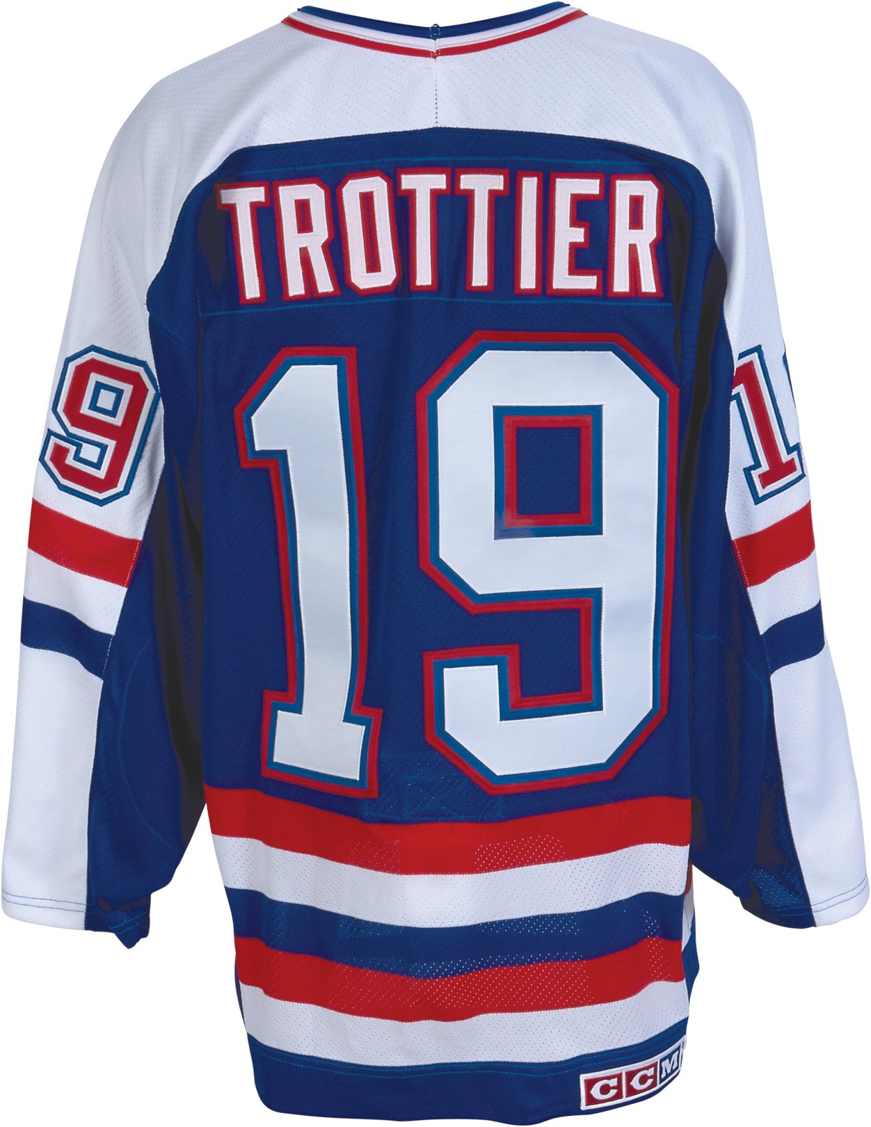 Feeling an obligation to repay his adopted homeland, Canadian Bryan Trottier made the controversial decision to represent Team USA in the 1984 Canada Cup after having played for Team Canada in 1981. This all-original, game-worn jersey from that period is most likely from pre-Canada Cup tournament games in 1984, as the font of the number "1" on the USA jerseys worn during the Cup itself is slightly different. The "USA" crest can be found front and center on the lightly-used jersey, while the number "19" appears on both sleeves and the back, where "TROTTIER" also appears sewn on a nameplate. The size, 50, is written in pen on a CCM tag in the collar.
