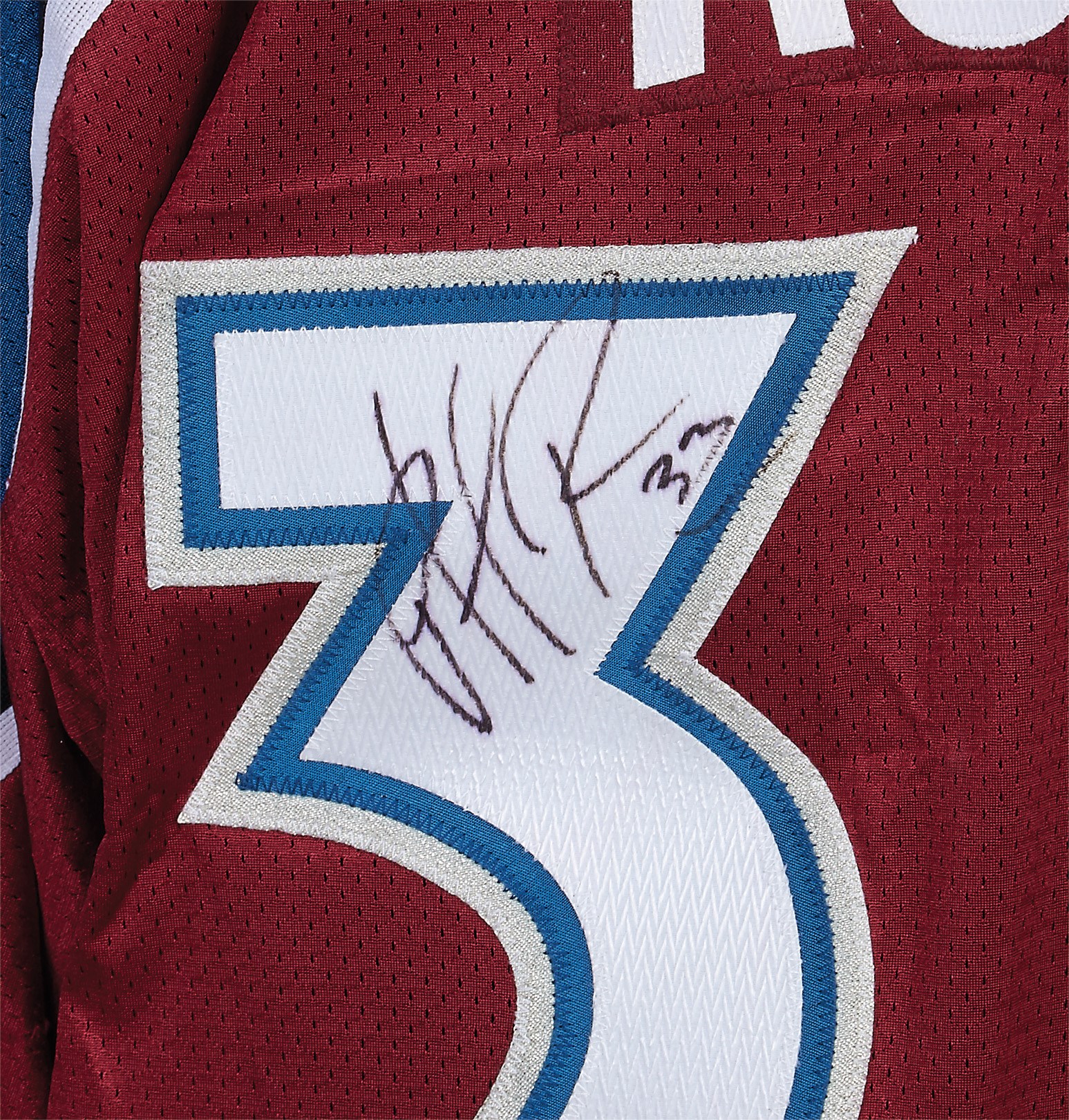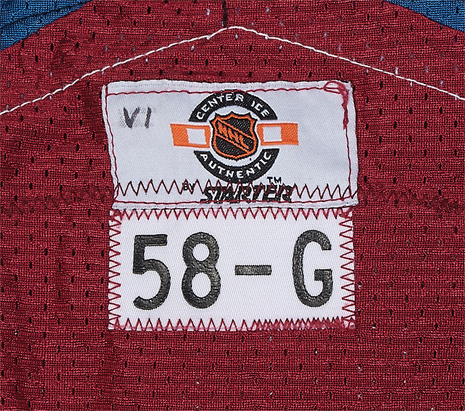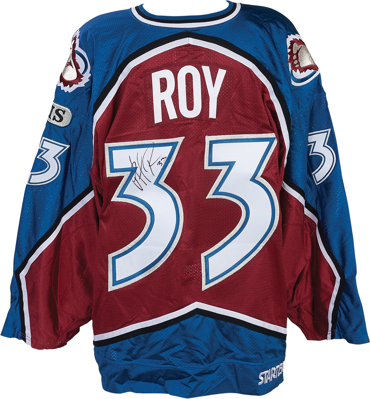 With a playing career that spanned nearly two decades, Patrick Roy is undoubtedly among the pantheon of the greatest hockey goalies of all time. This Roy jersey is game worn during the ’99 Avalanche playoff run and photo-matched to Game 7 of the Western Conference Finals. The 1998-99 Avalanche featured a host of stars including Peter Forsberg, Joe Sakic, and Theoren Fleury, who they acquired mid-season to buttress an already strong attack, but Roy’s prowess in net was unquestionably the team’s greatest asset and biggest attraction. This all-original jersey from a three-time Conn Smythe Trophy winner has an Avalanche crest on the front and the number 33 on both sleeves and the back. "ROY" is sewn on a plate on the back with an accompanying signature in 8/10 black Sharpie on the number. The jersey also features a CHS patch on the left sleeve – commemorating the Columbine High School massacre which occurred in April of 1999 – and was worn during the playoffs. The roman numerals “VI” appear on the Starter tag to signify the 6th set of the season. The jersey has endured only light use and comes with an LOA. Jersey has also been photo-matched to Game 7 of the 1999 Western Conference Finals.