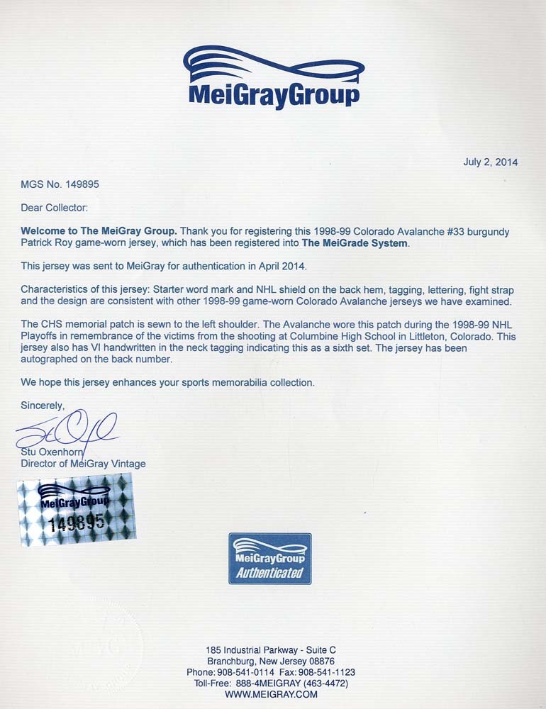 Lot # 444: 1998-99 Patrick Roy Colorado Avalanche Playoff Game Worn Jersey (Photo-Matched, MeiGray LOA)