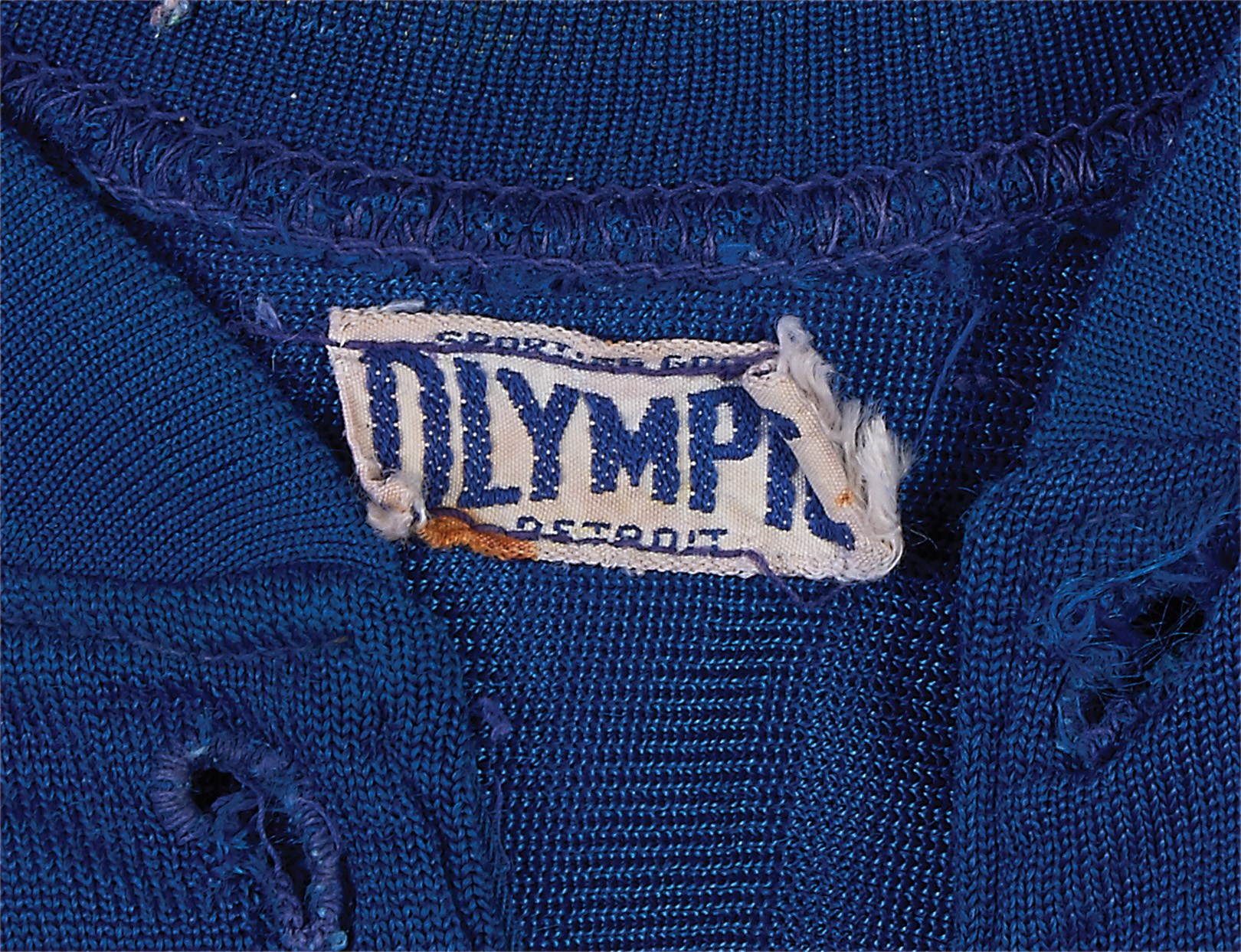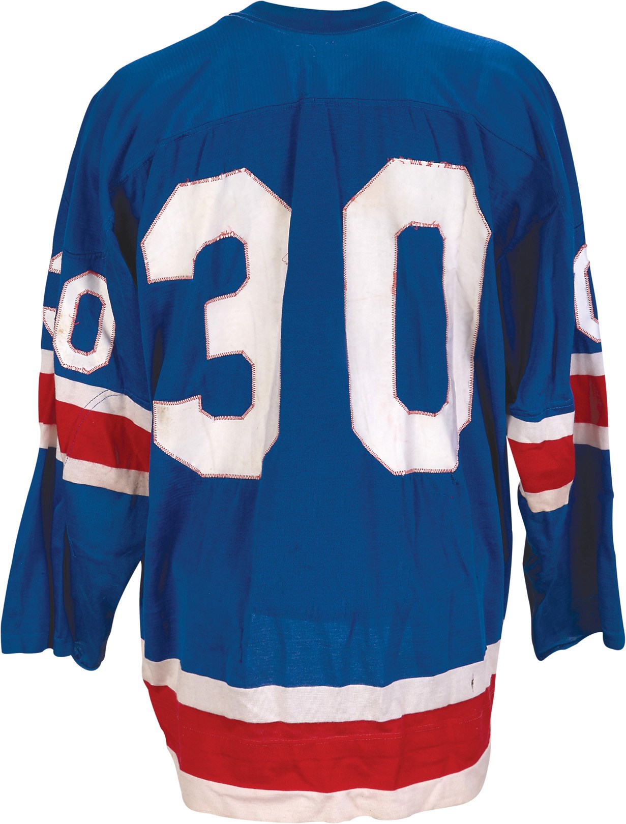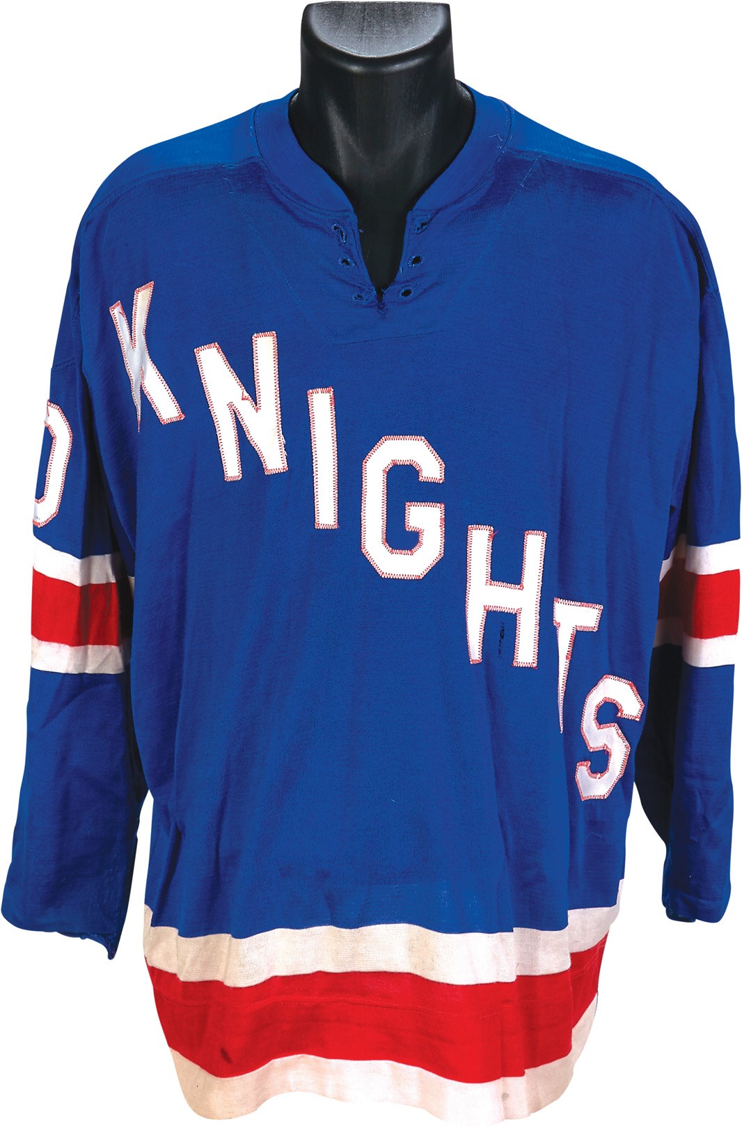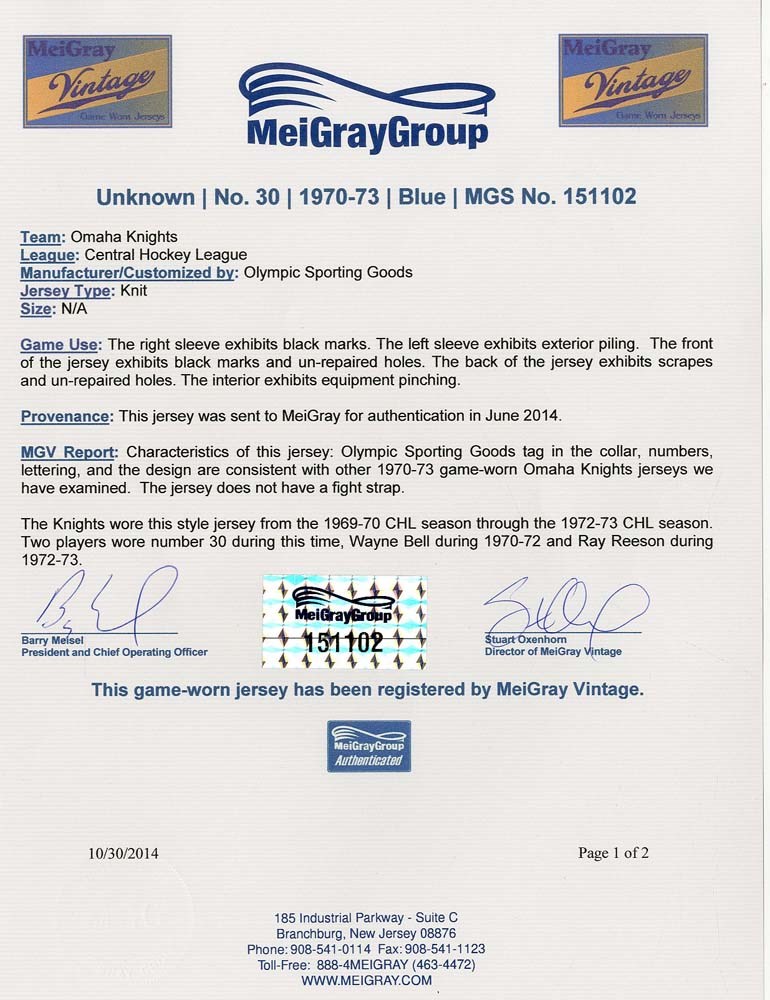The Omaha Knights have popped up in various iterations and leagues since 1939. Their affiliation with the NHL began in 1959 and continued until 1975, and they served as the minor league club for the Atlanta Flames at the end of their run. This game-worn jersey circa 1971 was donned by Wayne Bell, goalie for the Knights. It is all an all-original, blue jersey with red and white trim. "KNIGHTS" is sewn diagonally on the front with the number 30 on the back. The tie from the neck/collar area is missing, though it does have an Olympic tag in the collar, with washing instructions inside the tail. There are some stick marks, unrepaired holes and snags, and pilling throughout the jersey. It has seen nice use and comes with a Letter of Authenticity.