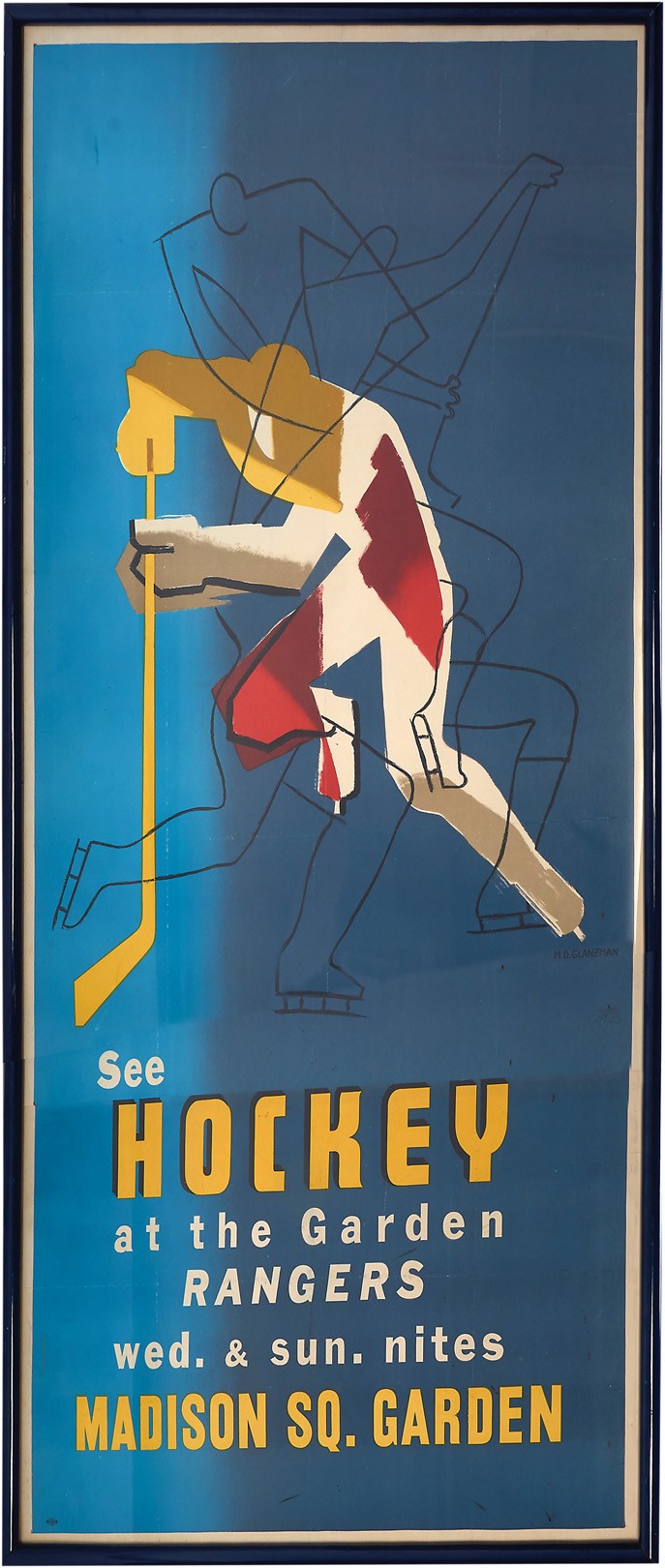 As big as life itself, New York's Madison Square Garden has earned its distinction as "The World's Most Famous Arena." This amazing 1950s New York Rangers advertising poster does the site justice, standing at about seven feet tall by four feet wide. Actually dating from the third of the four buildings to bear the MSG name, this framed beauty shouts,"See Hockey at the Garden, Rangers, Wed. & Sun. Nites, Madison Sq. Garden." On file at the Library of Congress, the colorful Cubist-style art is printed "M.D Glanzman" on right side, and the two-sheet poster has fold creases but is otherwise in EX condition.