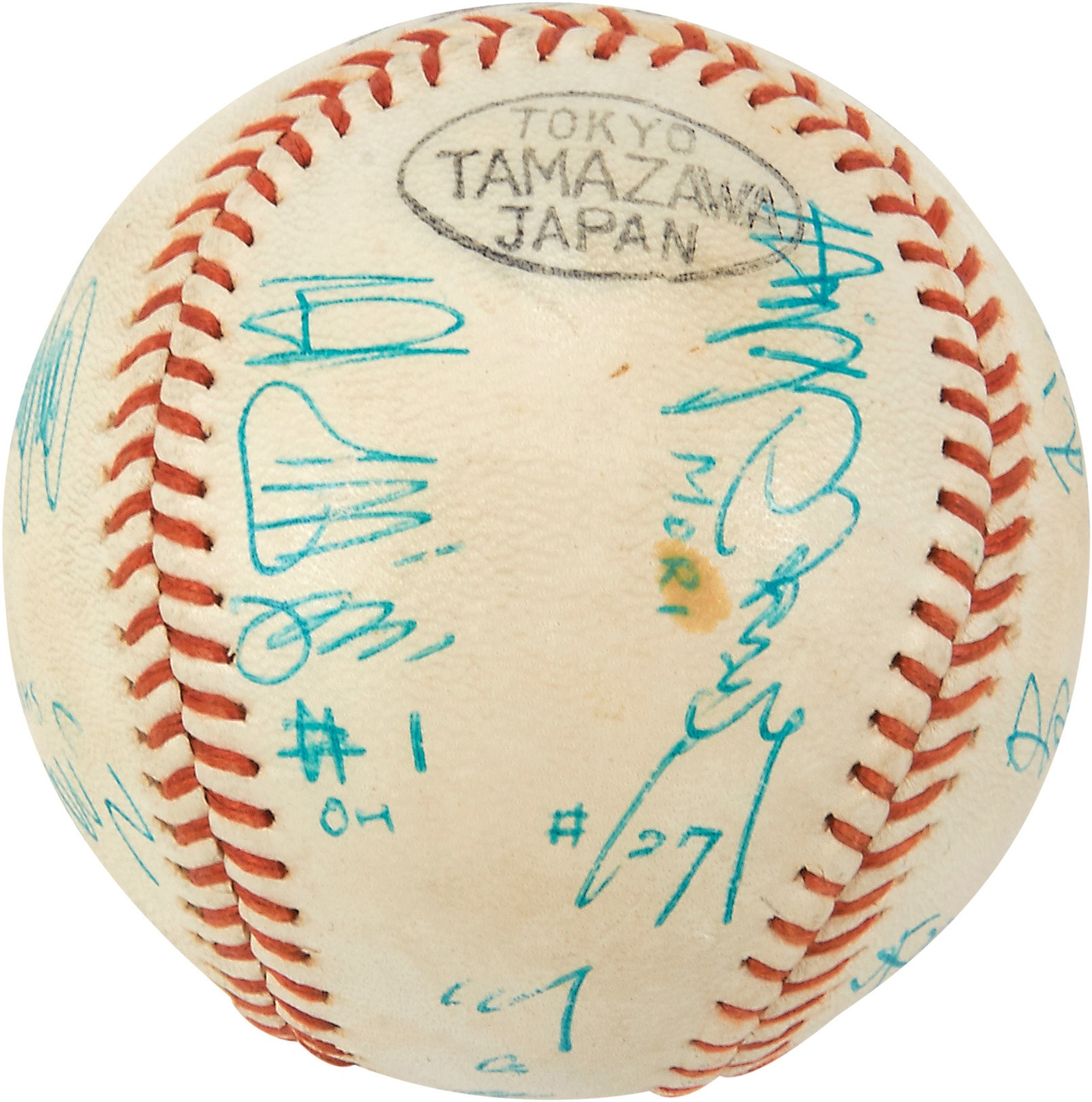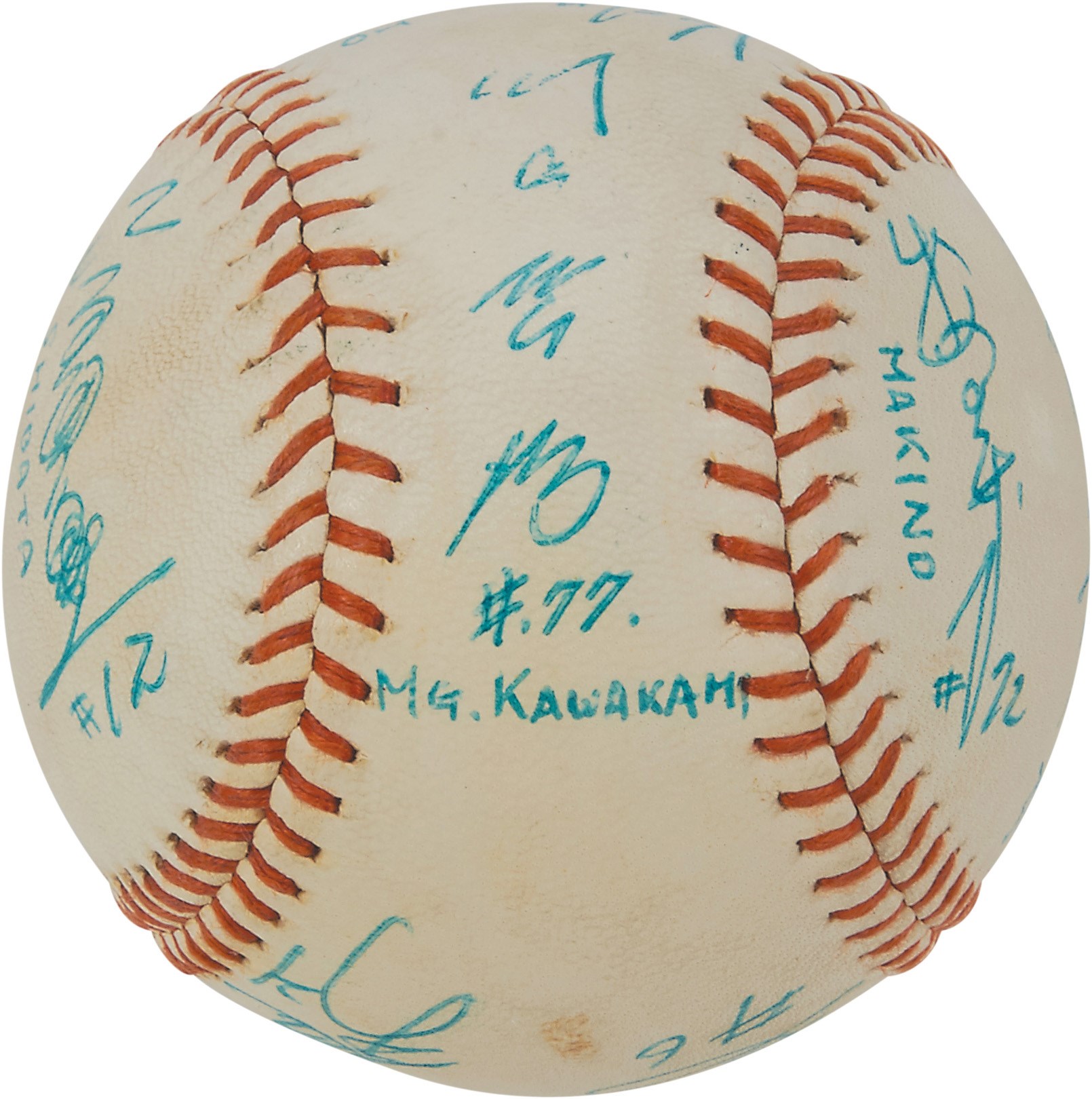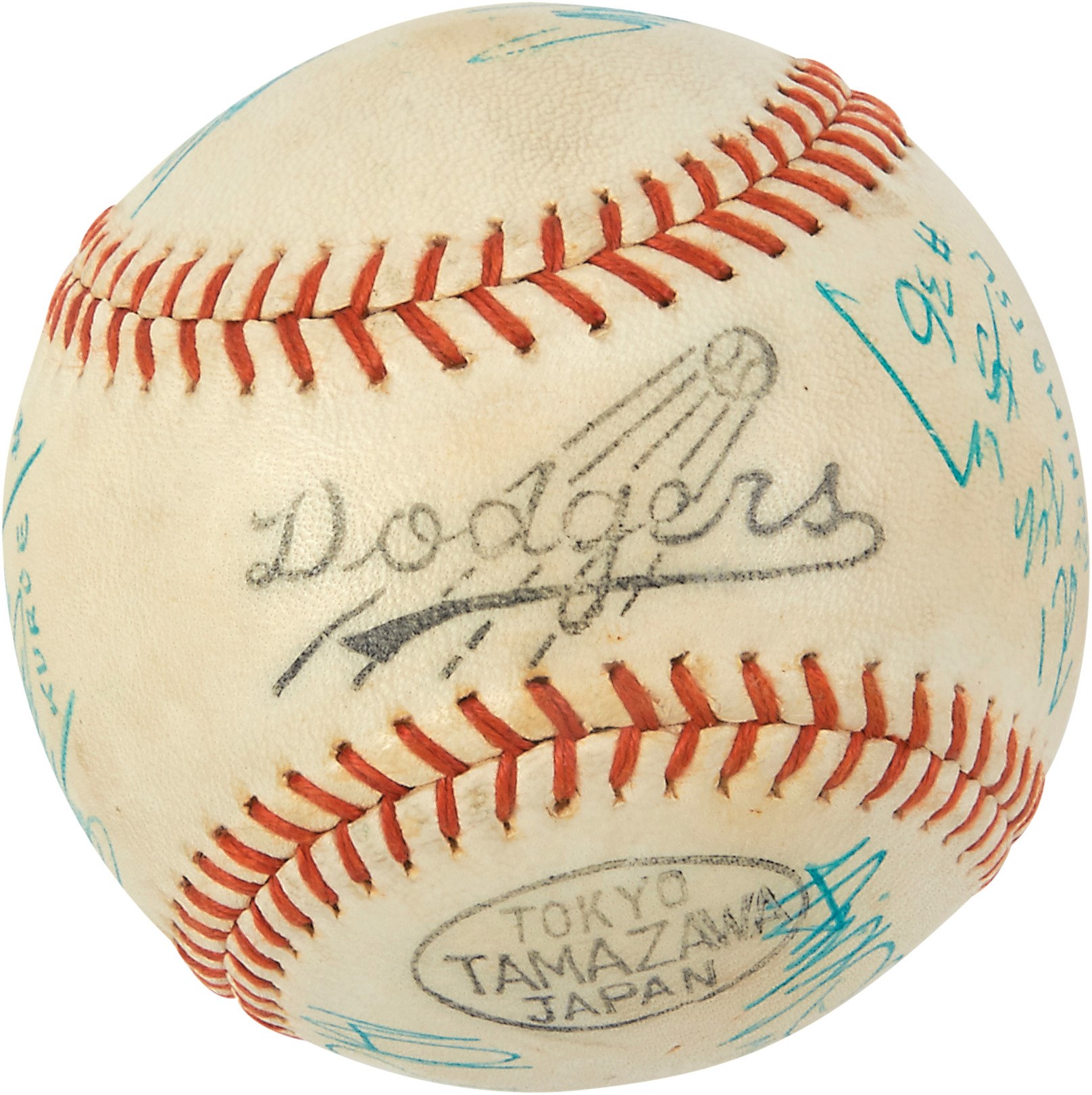 International baseball fans will relish this Tamazawa Dodgers baseball signed by 10 members of the Yomiuri Giants of the Japanese Central League circa the 1960s, including Japanese Hall of Famers Sadaharu Oh, Tetsuharu Kawakami, Masaaki Mori and Shigeru Makino. The players have signed in Japanese kanji, and several have been identified in English below. Signed in blue ink. Overall EX condition. Comes with PSA LOA.