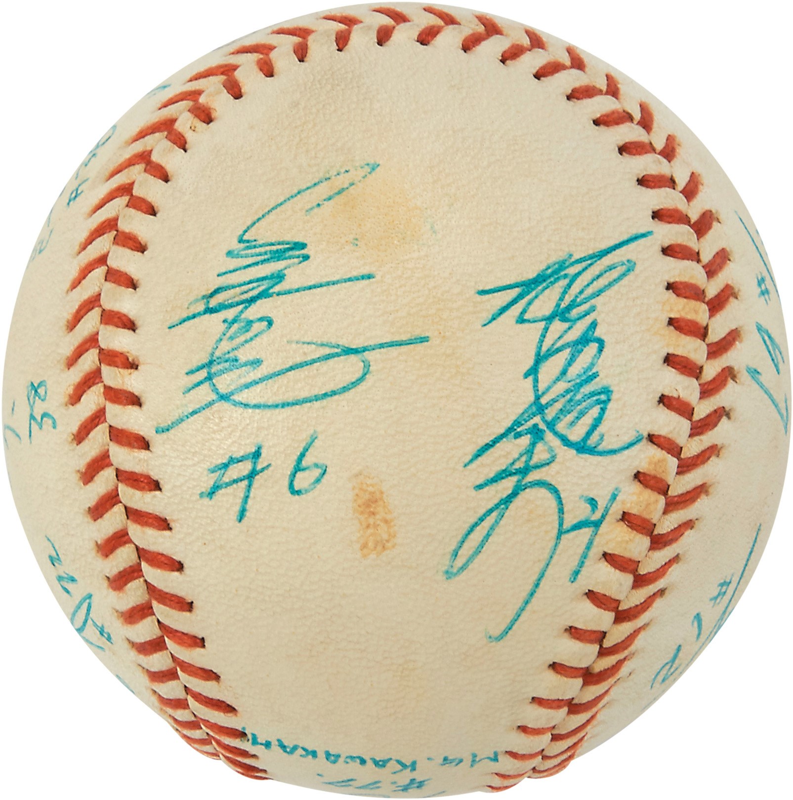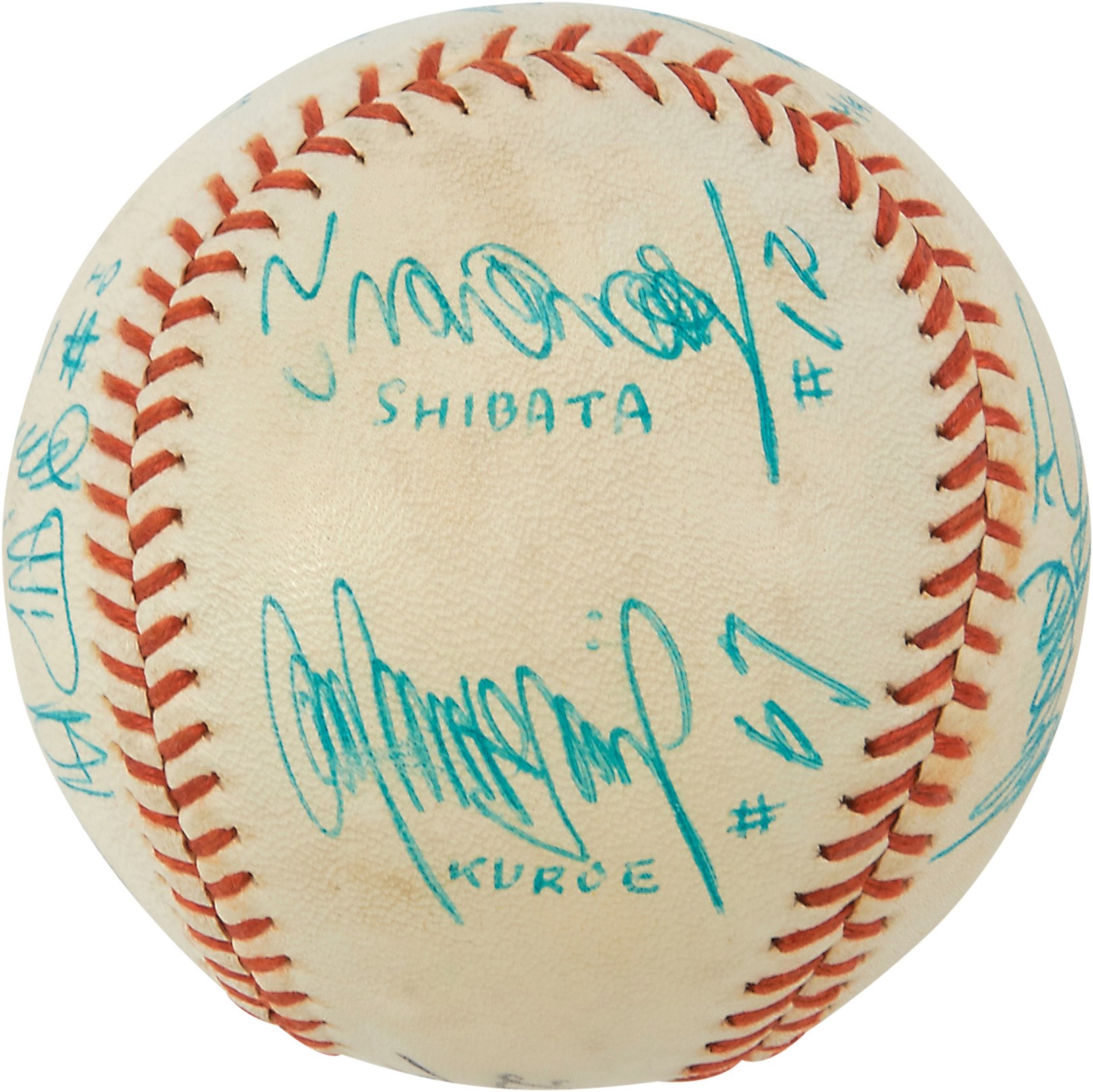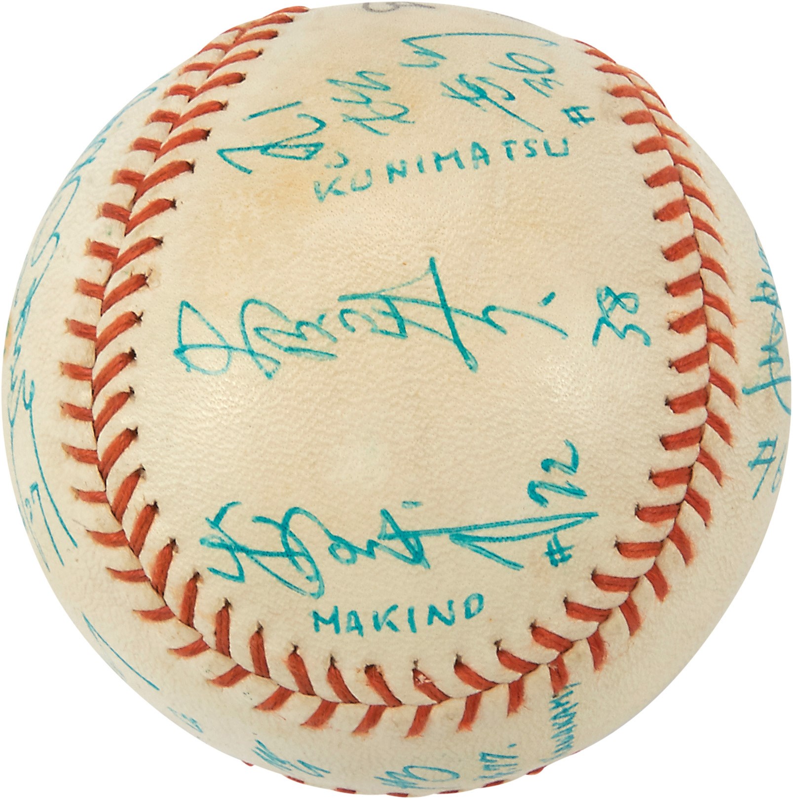 International baseball fans will relish this Tamazawa Dodgers baseball signed by 10 members of the Yomiuri Giants of the Japanese Central League circa the 1960s, including Japanese Hall of Famers Sadaharu Oh, Tetsuharu Kawakami, Masaaki Mori and Shigeru Makino. The players have signed in Japanese kanji, and several have been identified in English below. Signed in blue ink. Overall EX condition. Comes with PSA LOA.