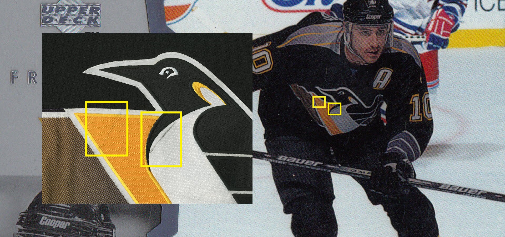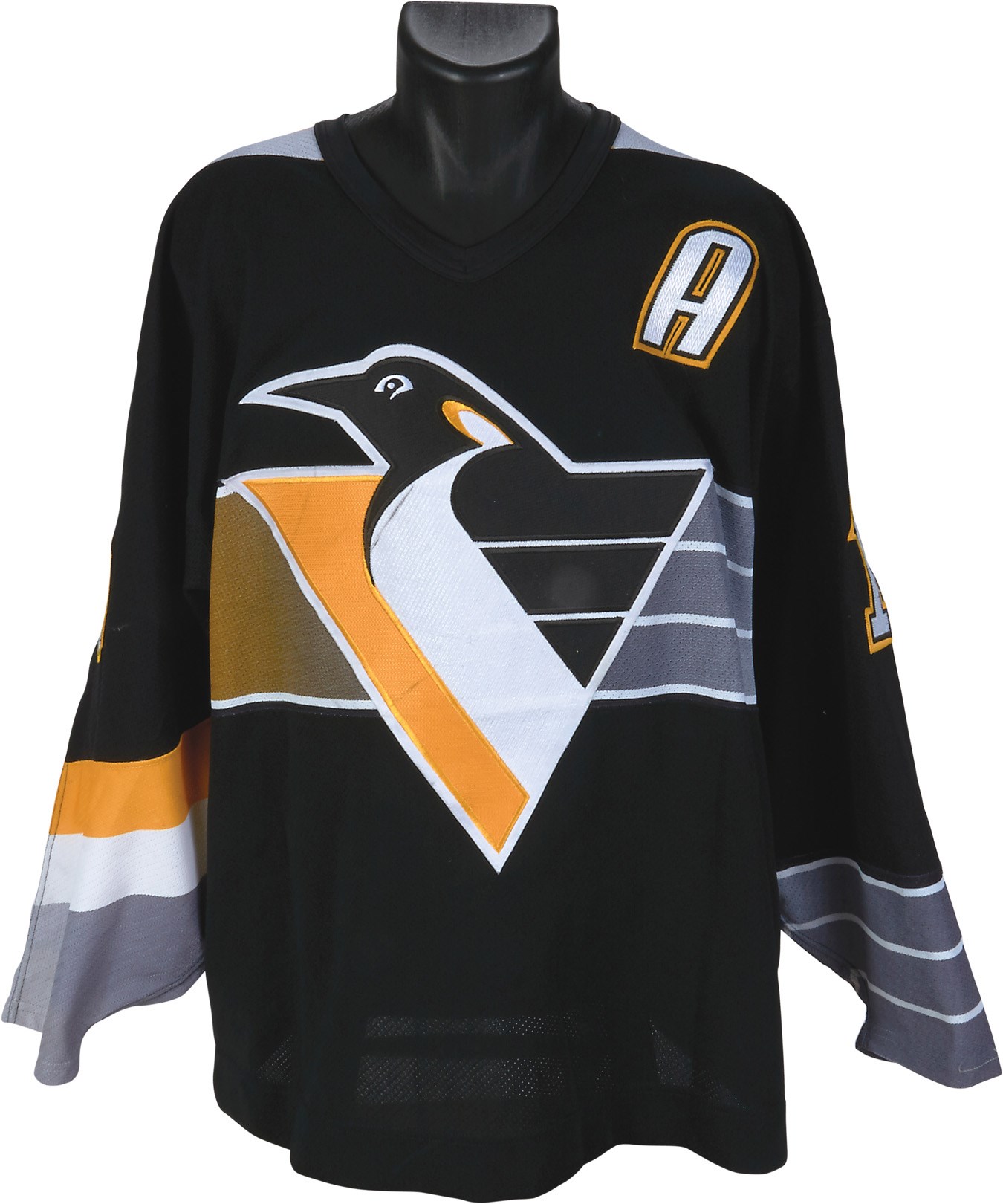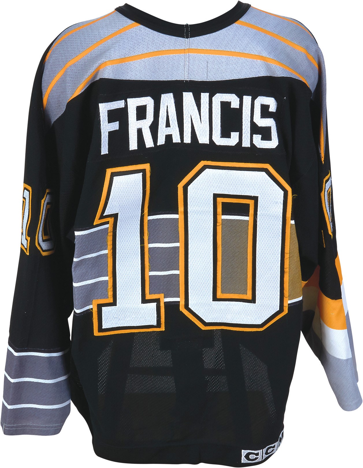 One of the most consistent, durable players in the history of the NHL, Ron Francis' time with the Pittsburgh Penguins proved especially fruitful as he won two Stanley Cups playing alongside Mario Lemieux. This jersey comes from the heart of Francis' tenure with the Penguins, the 1995-96 season, a year after he won the Selke Trophy with the team. Upon his retirement in 2004, Francis appeared near the top of several statistical categories, and currently sits second in all-time assists. He was a four-time All-Star and inducted into the Hockey Hall of Fame in 2007. This black, alternate jersey is all-original and shows great use, with the Penguins crest on front and an alternate captain's "A" on the left part of the chest. The number "10" appears on both sleeves and the back, along with "FRANCIS" sewn on a name plate. There is a Center Ice tag in the collar with a size "52" tag alongside it. There are stick marks, fraying, light board burns, pilling and some pulls throughout the jersey, which has been photo-matched to a 1996-97 Upper Deck Ice card.