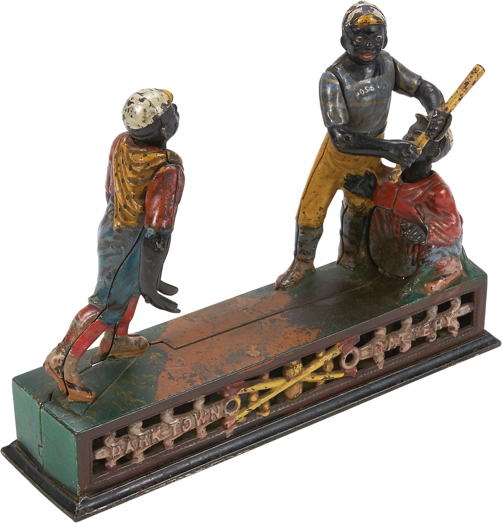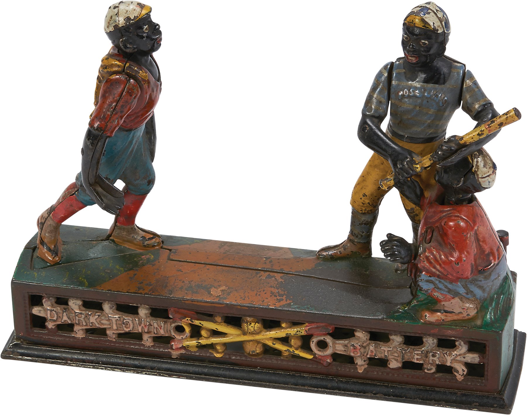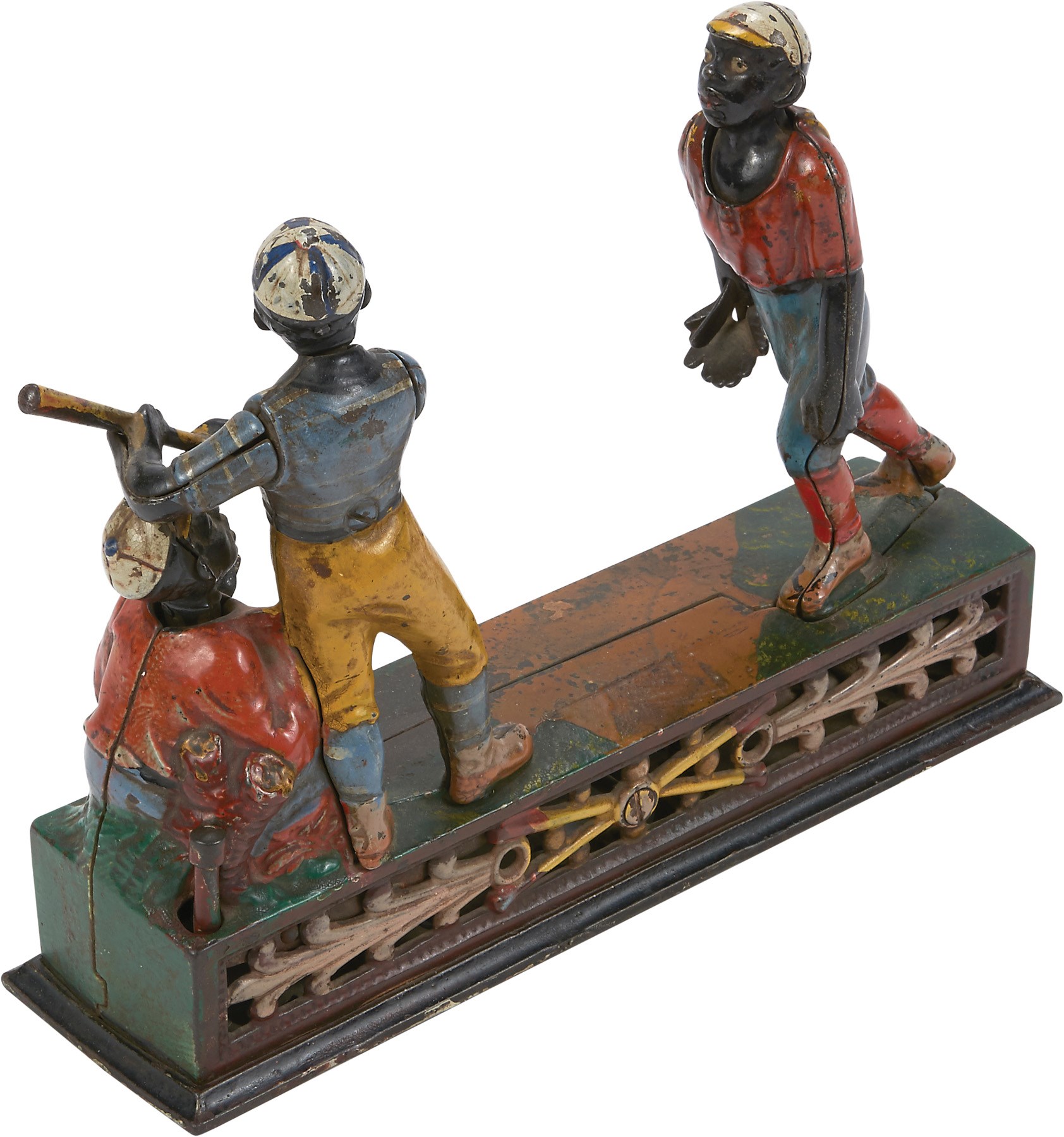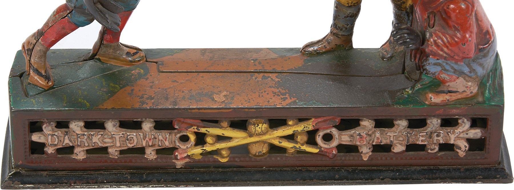 Here's a fine specimen with moving mechanical figures atop this desired cast iron bank, patented by James H. Bowen of Philadelphia and manufactured by J. & E. Stevens. Though it does bear imagery that today would be considered offensive, it is of current value to persons of all colors, shapes and sizes. The functioning, spring-loaded, push-button coin bank features a pitcher, batter, and catcher engaging in a spirited game, all depicted in these classic stereotypes. This piece is in fine condition with no repairs and retains 90% of its original paint. One of the nicer ones you will see!