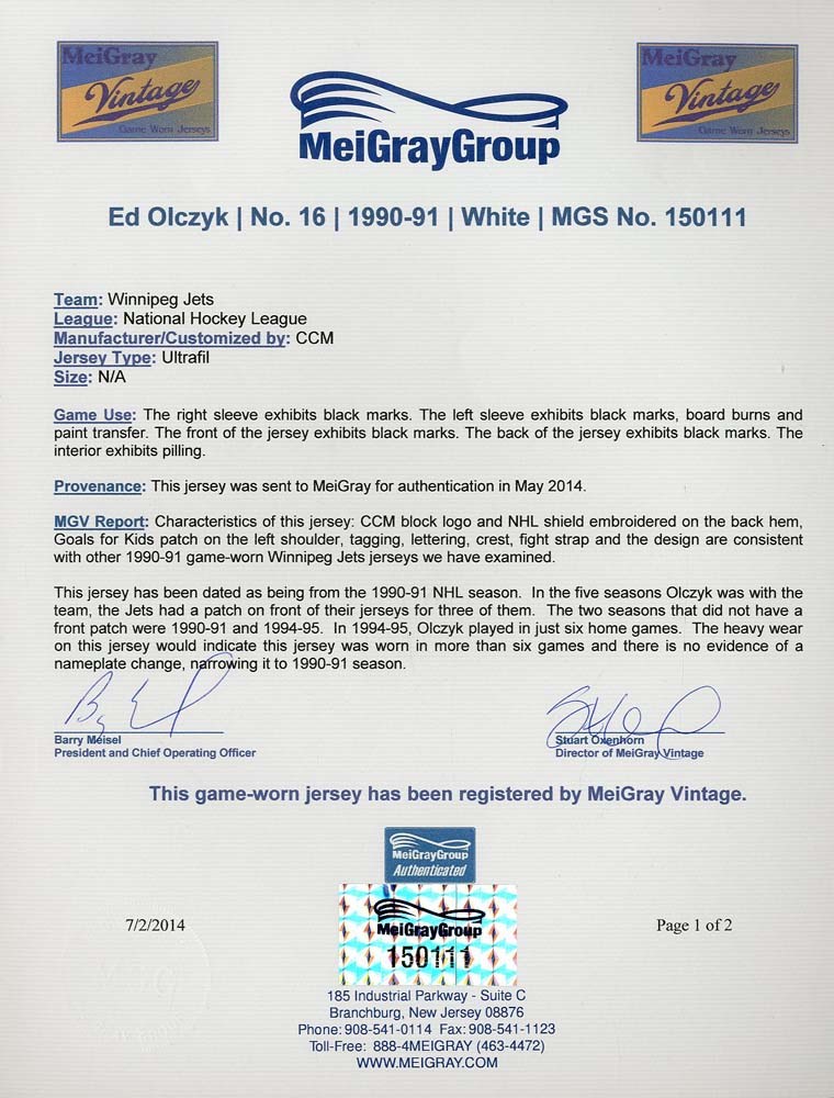 Lot # 476: 1990-91 Ed Olczyk Winnipeg Jets Game Worn Jersey (MeiGray LOA)