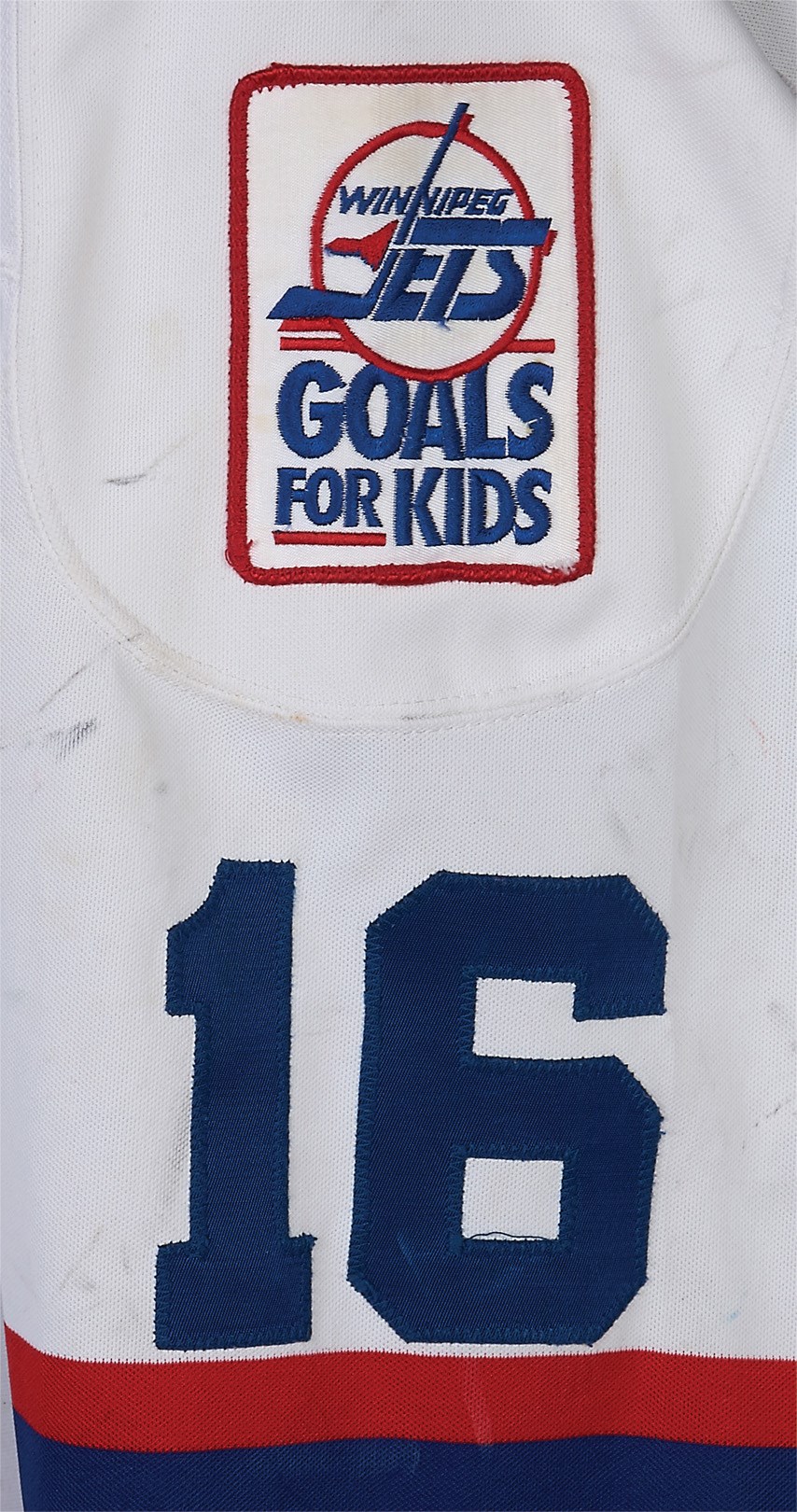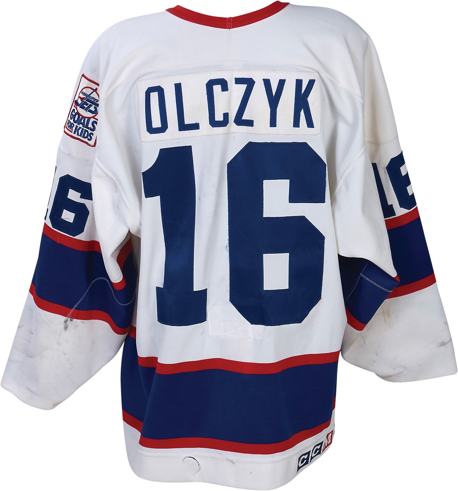 Eddie Olczyk, U.S. Hockey Hall of Famer and beloved broadcaster, was traded to the Winnipeg Jets during the 1990-91 season, which was one of the many stops he made throughout his 17-year tour of the NHL. This game-worn, home jersey shows great use, including lots of stick marks, board burns, fraying and paint transfers. There is also pilling on the inside and an unrepaired cut on the back at the tail area. The jersey is all original with the number "16" on both sleeves and back, along with "OLCZYK" sewn on a name plate above, as well as "Goals For Kids" patch on the left sleeve. A Maska Ultrafil tag can be found in the collar and the jersey comes with an LOA.