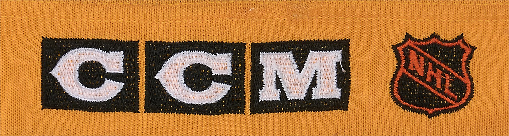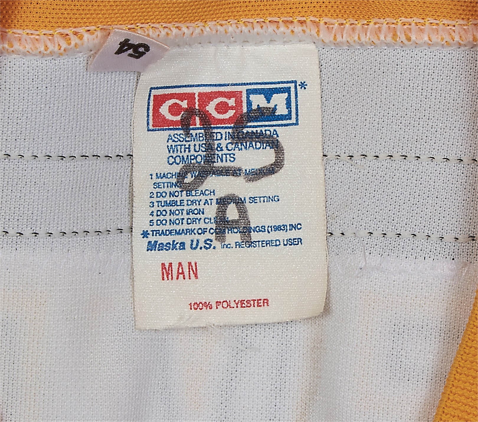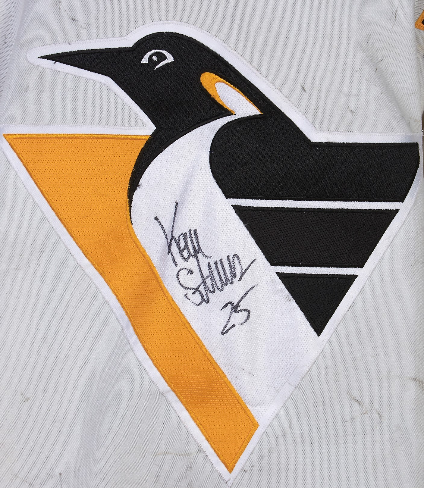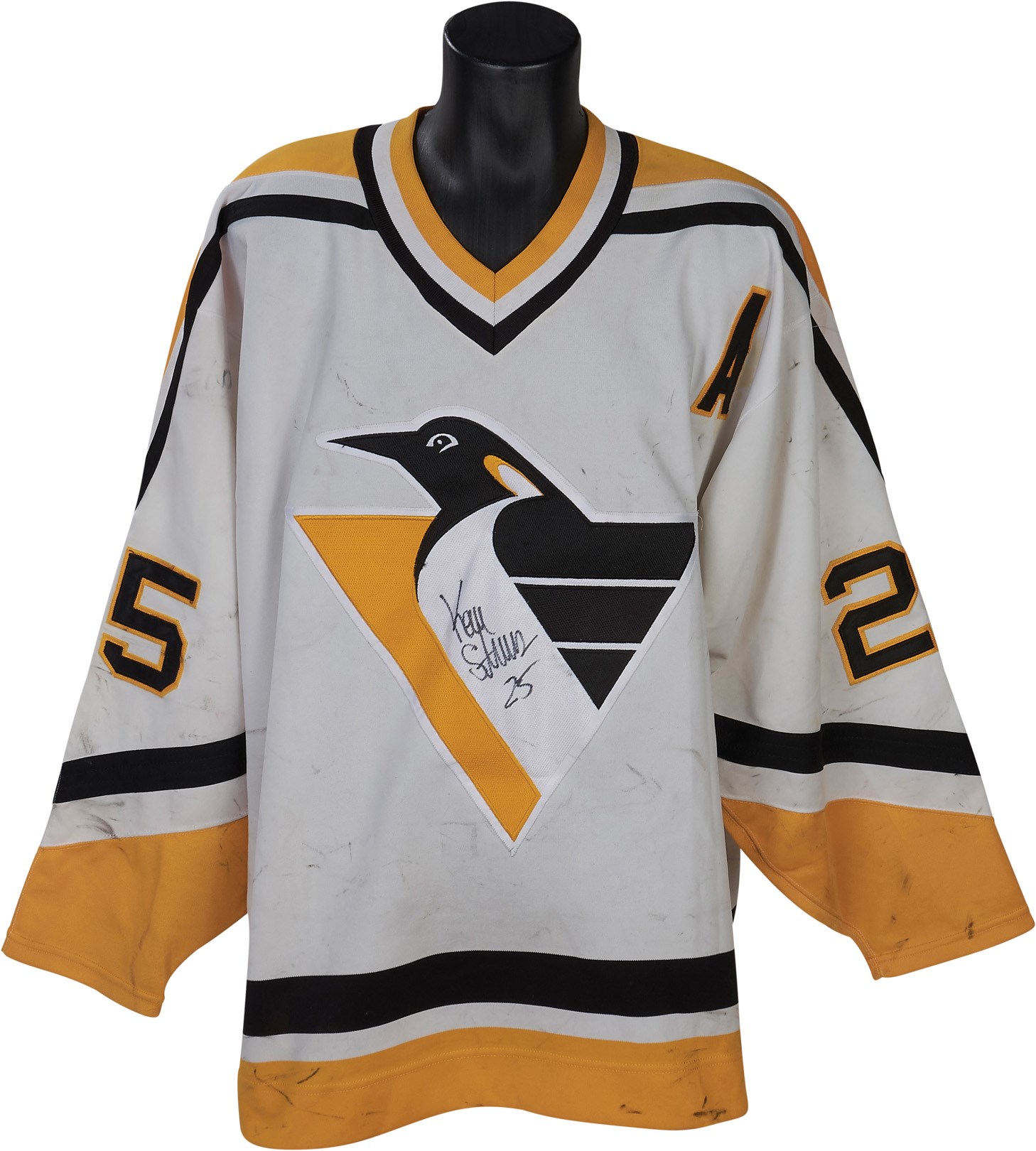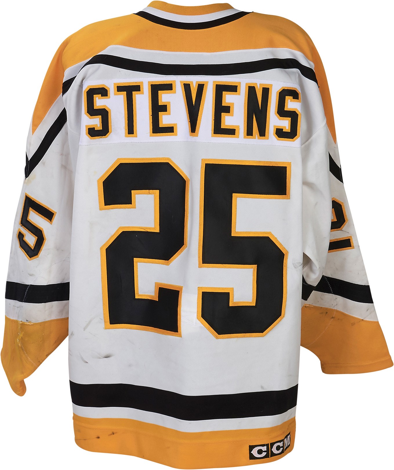 Not even a year removed from massive facial reconstruction surgery necessitated by a colossal hit Kevin Stevens suffered in the 1993 Patrick Division finals, the left winger returned to have a very successful season with the Pittsburgh Penguins, notching more than 40 goals and 40 assists. This white, home jersey was game worn by Stevens that year, the 93-94 season, and shows terrific use. The number "25" appears on the back and both sleeves of the all original jersey, while an alternate captain's "A" can be found on the left front chest. Stevens signed the jersey on its crest in 8/10 black Sharpie and his surname is sewn on a name plate on the back. A CCM size 54 tag appears in the collar with "25 A" written on it in black marker. The jersey displays lots of stick marks, burns, paint transfers and unrepaired rips, along with much pilling inside.