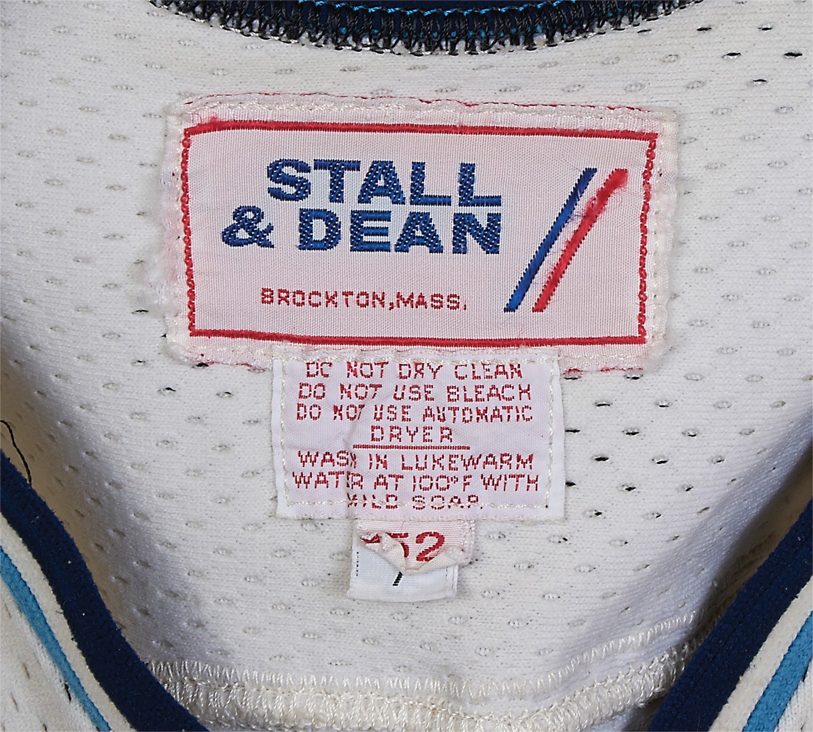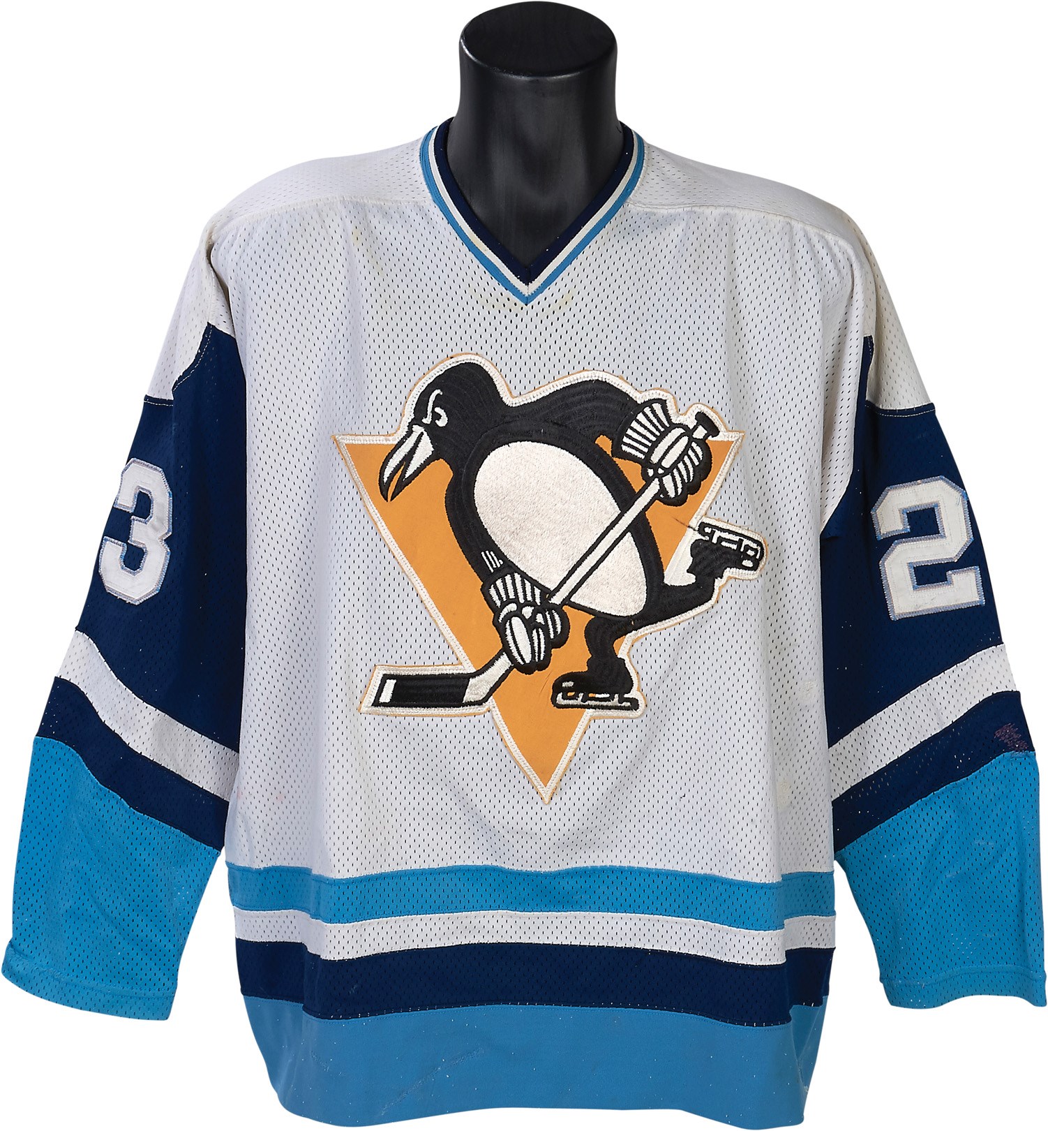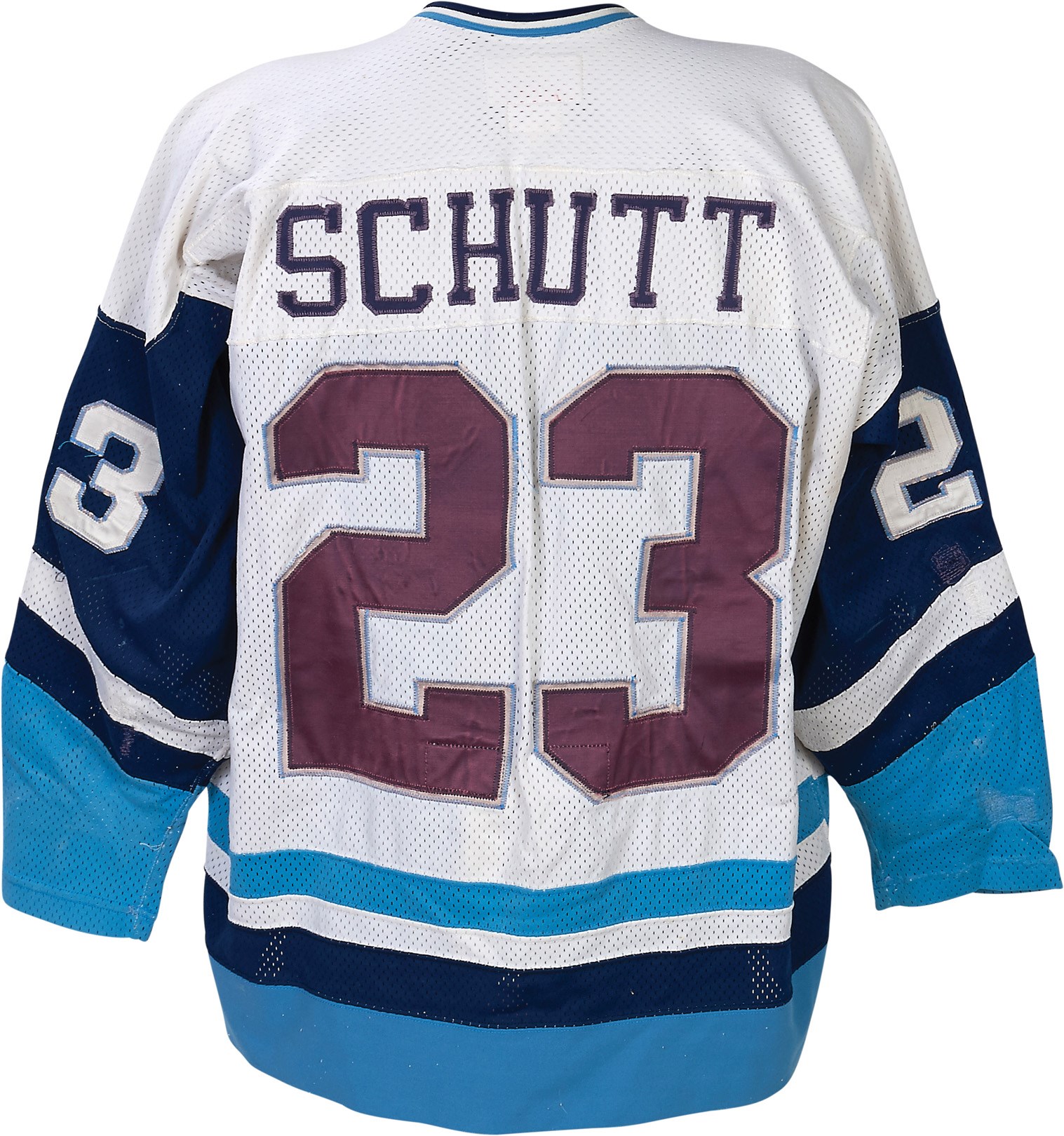 This game worn jersey from the 1978-79 Pittsburgh Penguins features a unique, and thankfully not oft-repeated, style. A smattering of clashing colors grace the jersey, which is predominantly white with blue and light blue trim. The Penguins crest is front and center, with its black, white, and yellow scheme having little to do with the surrounding hodgepodge of color. It is all original with the number "23" appearing on the back in purple with blue stitching; the number also appears on both sleeves but in white. "SCHUTT" is sewn on a name plate in the back as the jersey belonged to Todd Schutt, who had a relatively brief stint in the NHL. A Stahl & Dean tag appears in the collar with washing instructions and a size 52 tag. A "7" tag can also be found in the collar which denotes the jersey was made in 1977. Since Schutt was not with the Penguins that year the jersey is a hold-over from the previous season and was lettered and numbered when he joined the team. It shows fine use with at least 11 team repairs, as well as other use in the form of stick marks and some scuffs and burns, and has a metal clip style fight strap inside.