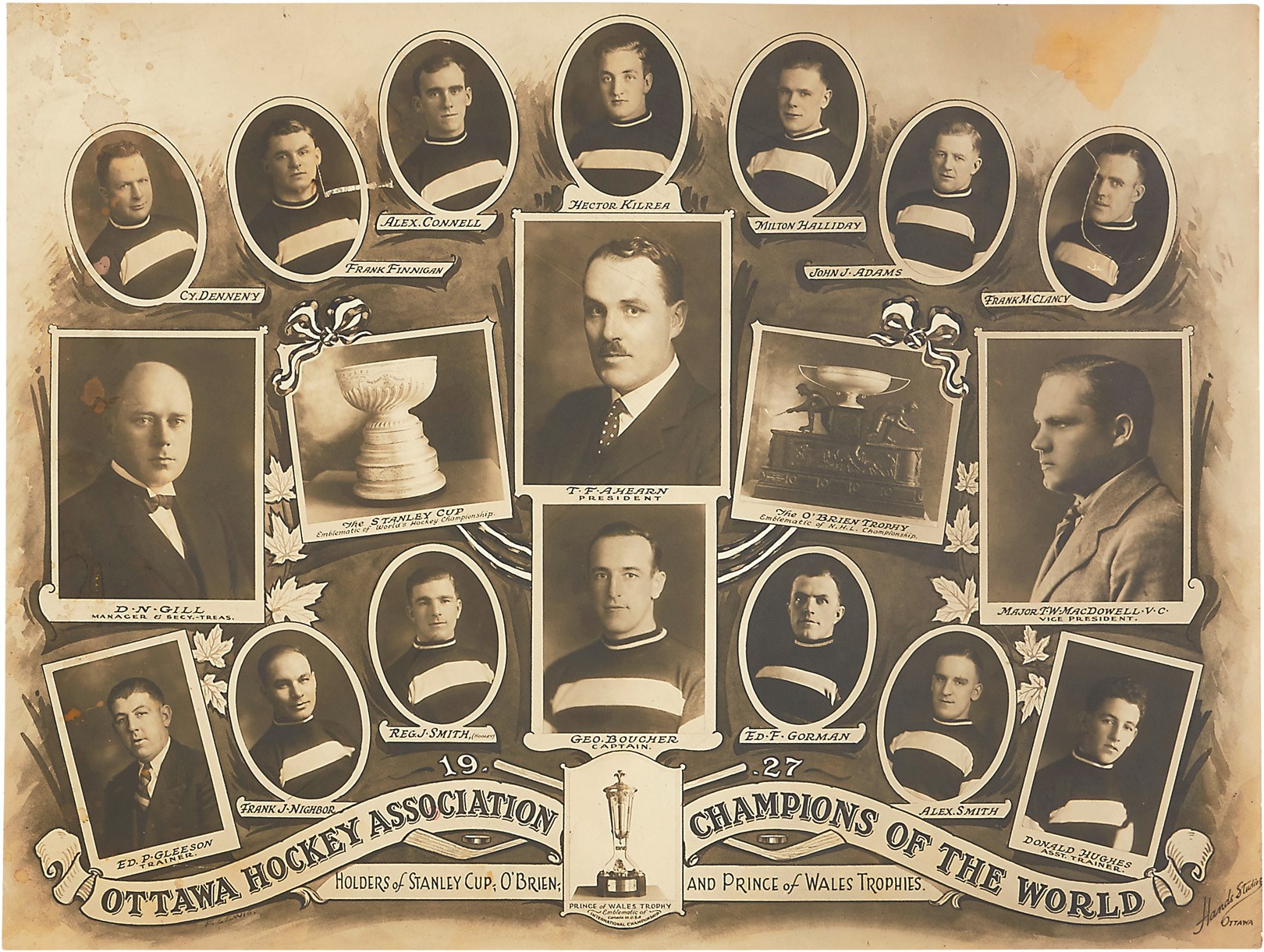 This magnificent photograph of the 1927 Ottawa Senators is overflowing with hockey history. Dubbed the "Super Six," the Senators teams from the 1920s were considered to be the NHL's first dynasty, having won four Stanley Cups during their run, though 1927 was fated to be their last. The team, true to its moniker, produced six Hall of Famers and all are present in the photo: Cy Denneny, Alex Connell, John "Jack" Adams, Frank "King" Clancy, Frank Nighbor and captain George Boucher. Also included are players Frank Finnigan, Hector Kilrea, Milton Halliday, Reginald Smith, Edwin Gorman and Alex Smith. An image of the Stanley Cup appears to the left of Senators owner Frank Ahearn, while the O'Brien Trophy, which is a retired trophy that was presented to the NHL champion from 1921 to 1927, appears on Ahearn's right. This Type I photograph with incredible graphics was likely only presented to players and VIPs and as such is exceedingly rare. Measures 16" x 12".