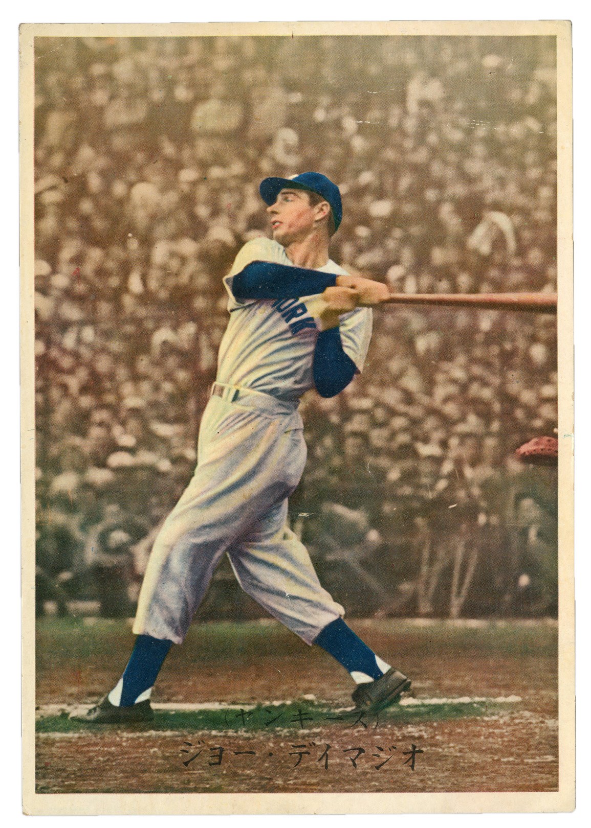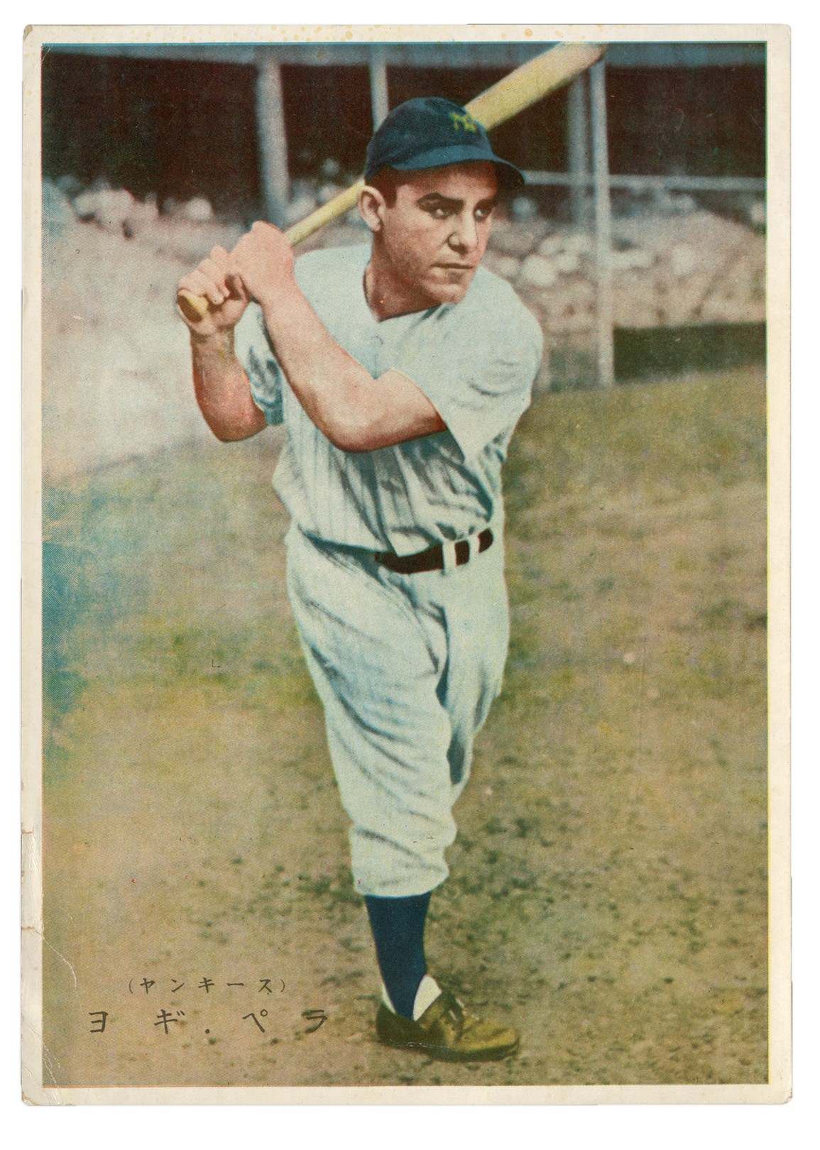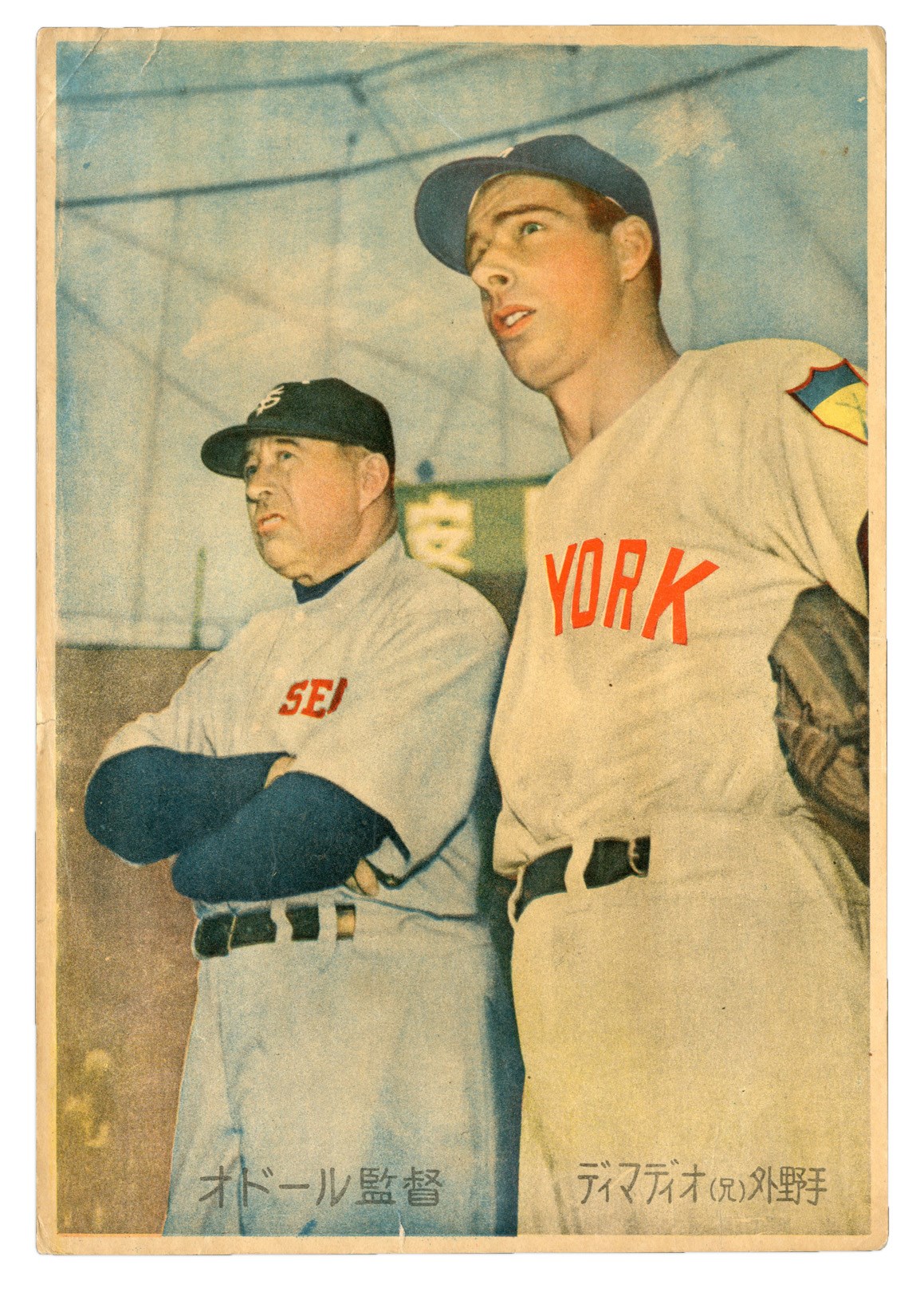 Rare oversized cards from Japan. 1) 1951 Joe Dimaggio. Striking, giant-sized, first prize winner bromide is a beautiful memento of the series of games. 2) 1951 O'Doul and Joe DiMaggio. O'Doul and DiMaggio were together in Japan on several occasions. The most famous time was in 1954, when DiMaggio was accompanied by his then wife, Marilyn Monroe. Supposedly, Monroe became jealous of all the adulation DiMaggio was receiving and left the tour for a number of days. 3) 1953 Yogi Berra. Dazzling, full-color premium commemorates the 1953 Ed Lopat U.S. Major League All-Star Tour of Japan. All first prize bromide cards of this type contain paper and/or glue residue because of previous attachment to a display sheet, which does not detract significantly from condition. O/w EX-MT, average 7x10".