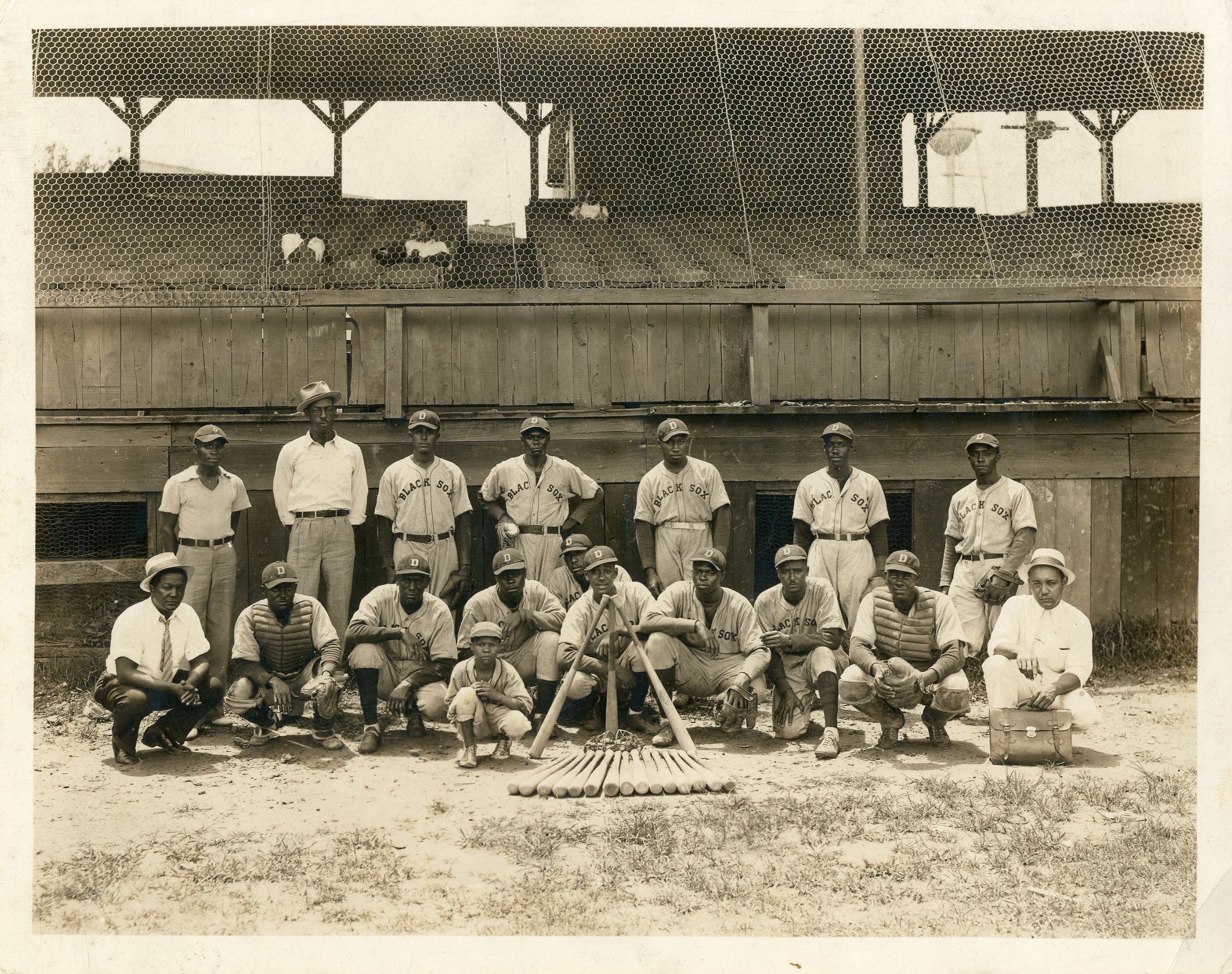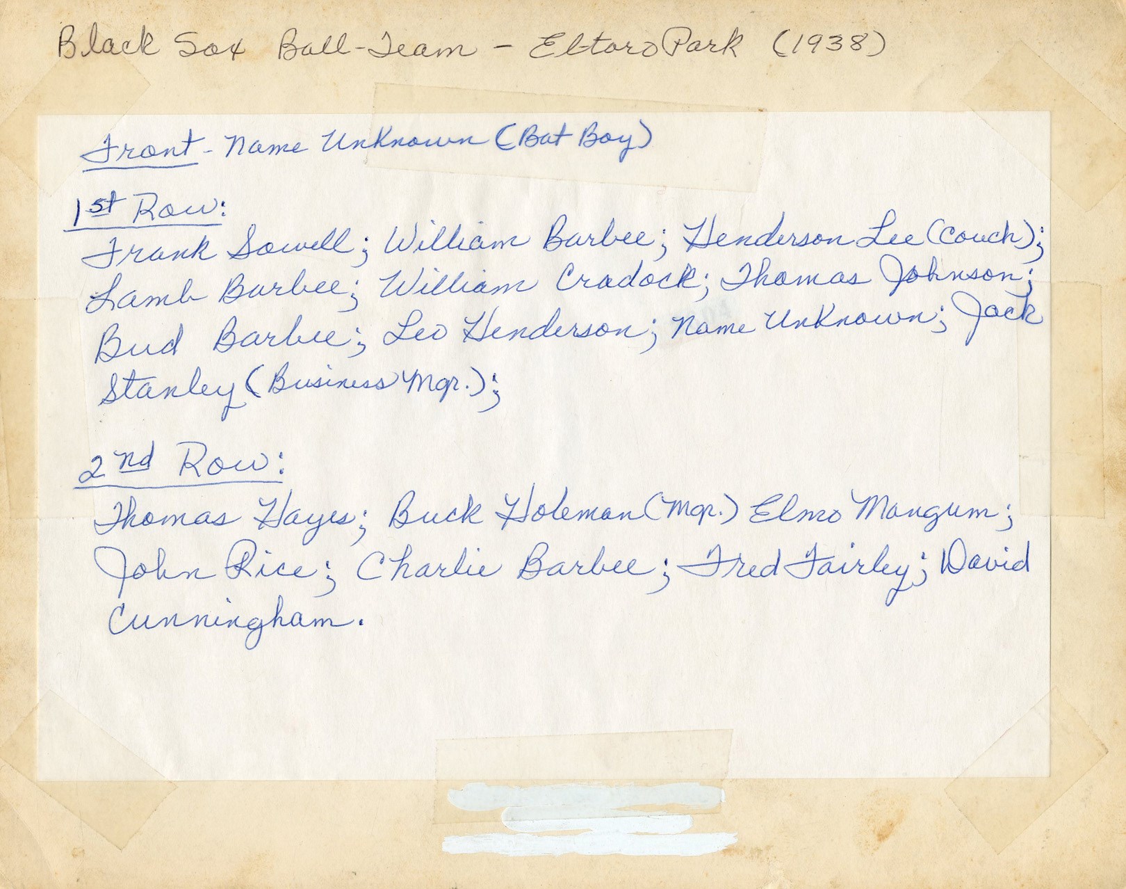 This rare image is a team photograph of the 1938 Durham Black Sox and was taken at El Toro Park, which burned down in 1939. The back of the 8x10" photo has handwritten "Black Sox Ball-Team - Eltoro Park (1938)," and also has the team roster written in hand and taped on back with three white-out strips underneath. The contemporary writing indicates the players to be: Sowell, W. Barbee, Lee (coach) L. Barbee, Cradock, Johnson, B. Barbee, Henderson, unknown, Stanley (business mgr.), Hayes, Holeman (manager), Mangum, Rice, C. Barbee, Fairley, Cunningham. It is growing increasingly difficult to find Negro Leagues information from this period, especially one with identifications. There is minor creasing otherwise EX condition.