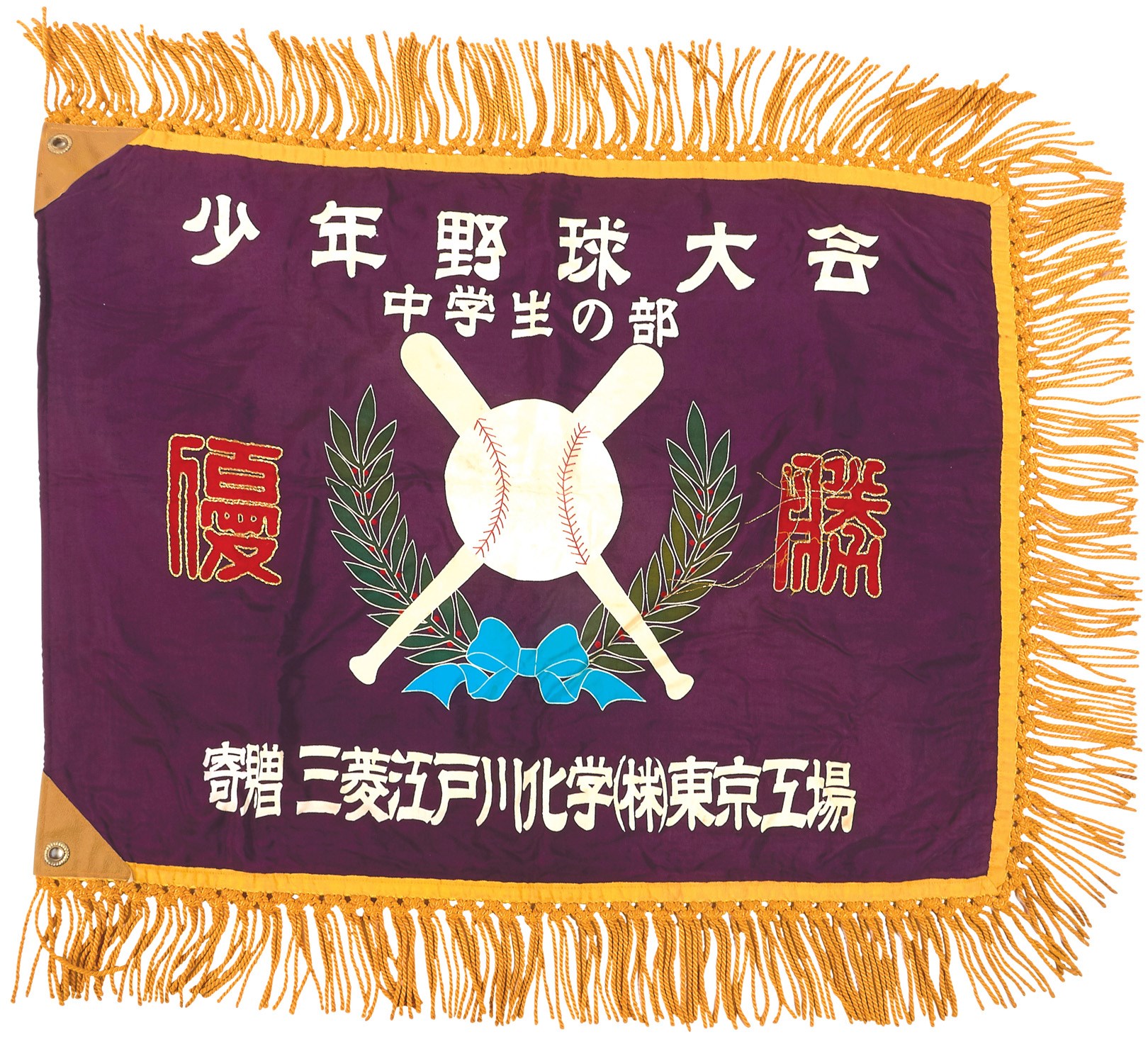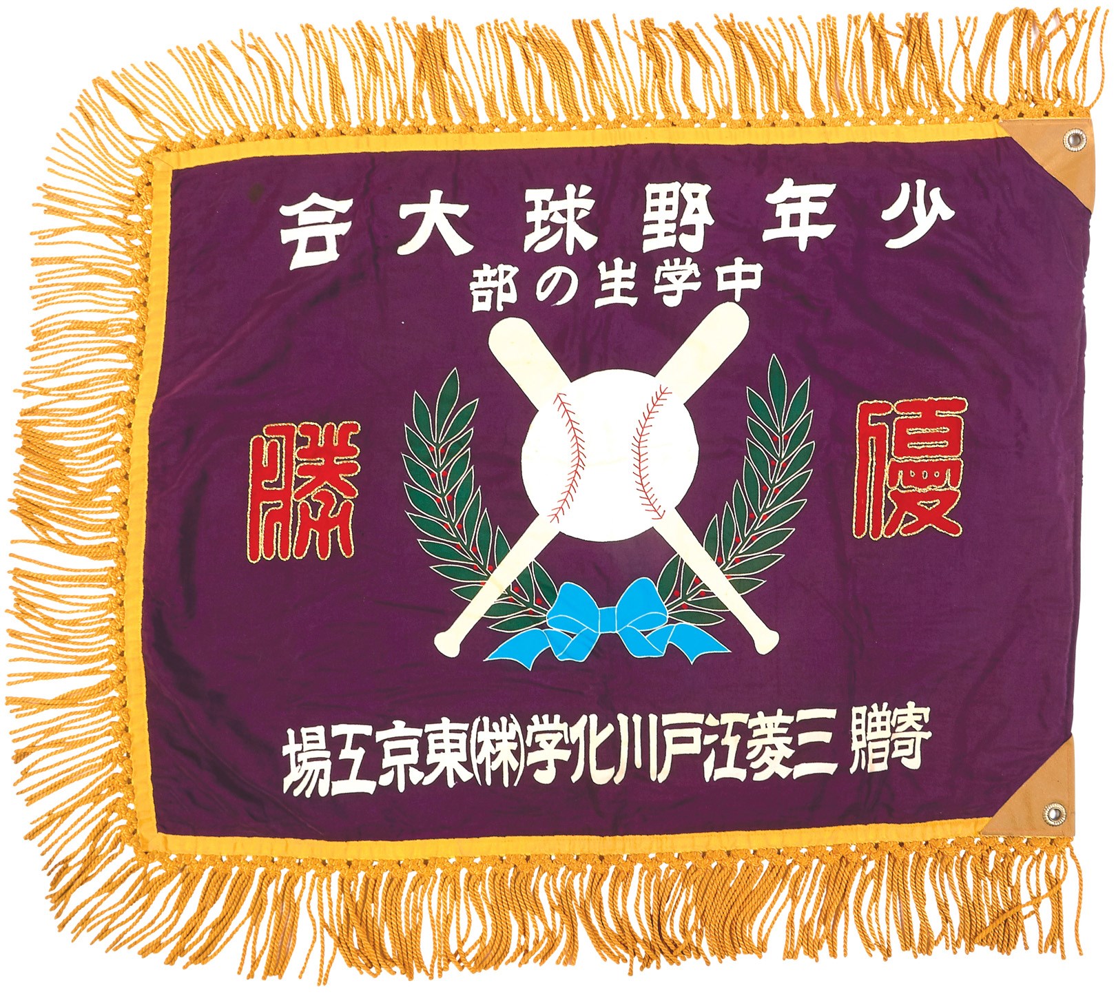 Gorgeous purple and gold tasseled cloth banner measures an impressive 37x35" and advertises "Youth Baseball Tournament Middle School Champions." Was given to the tournament from the Mitsubishi Edogawa Chemical Corp. Toyota Factory. Two of the corners have metal grommets for hanging. Great condition, colors and graphics.